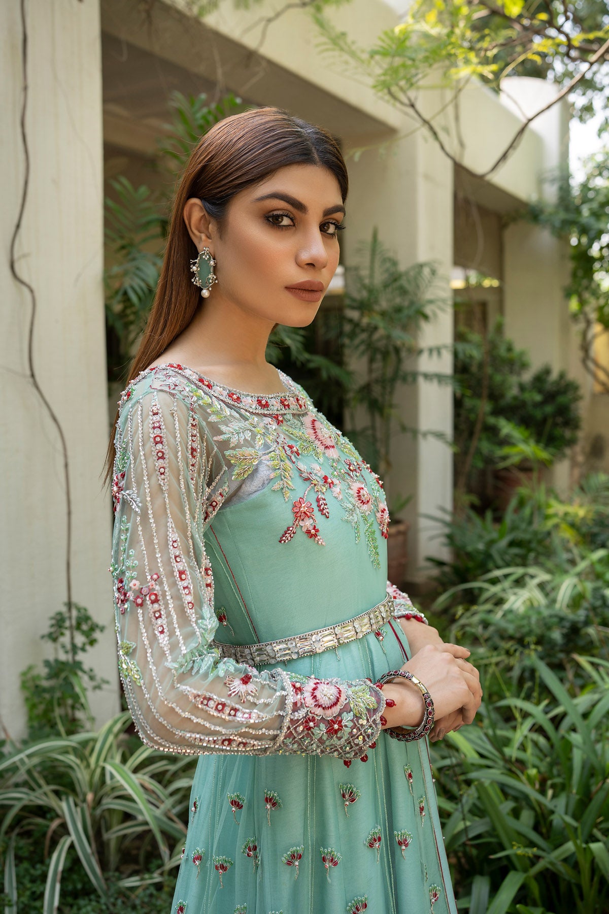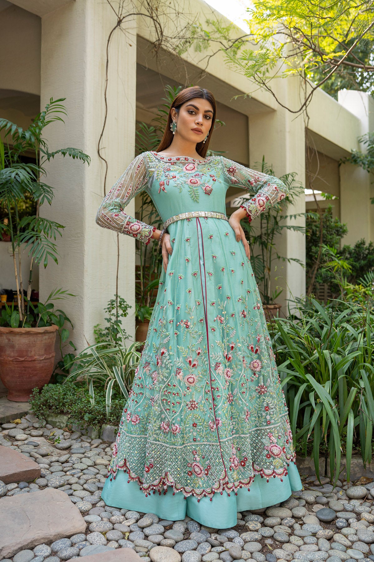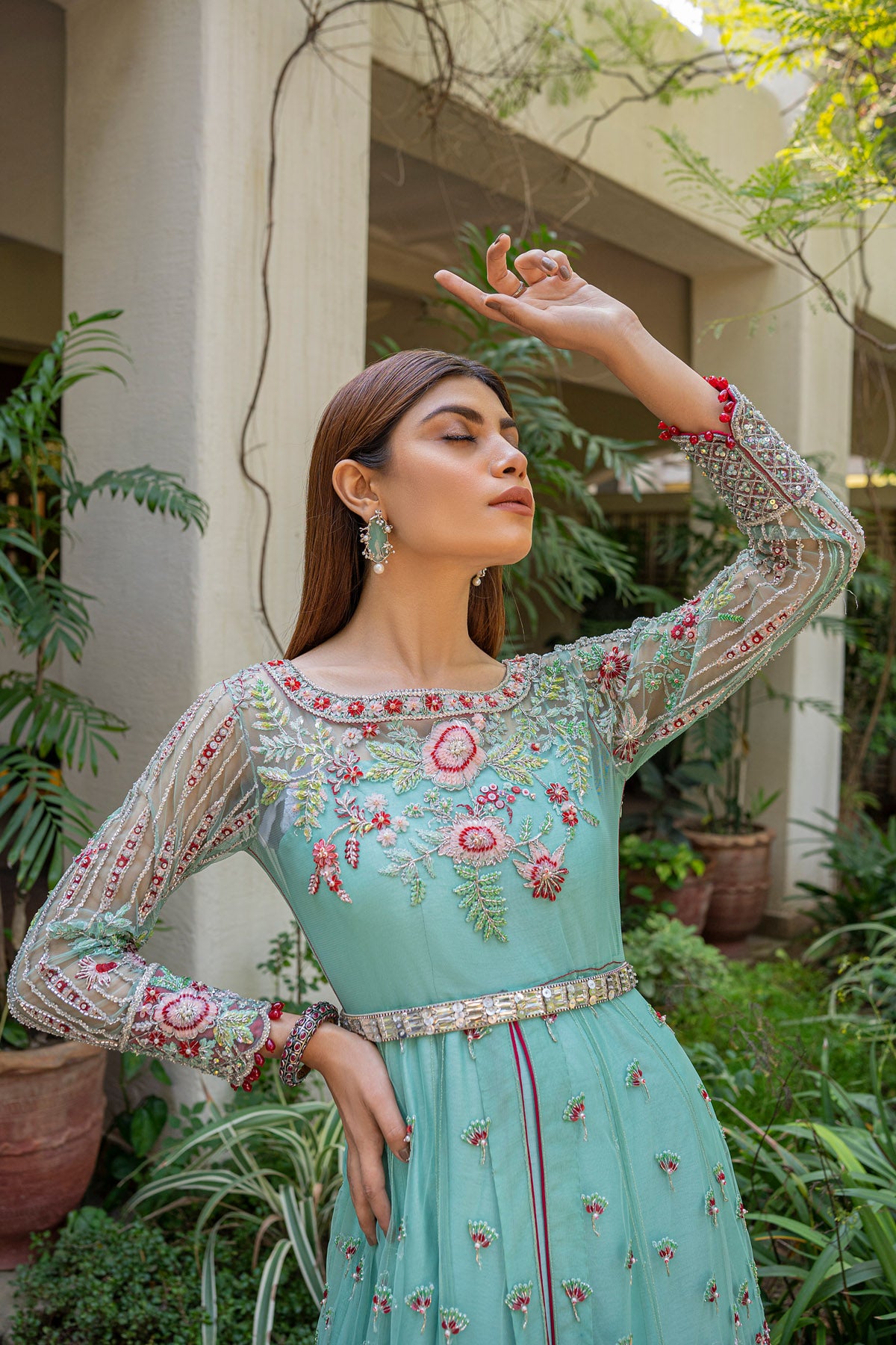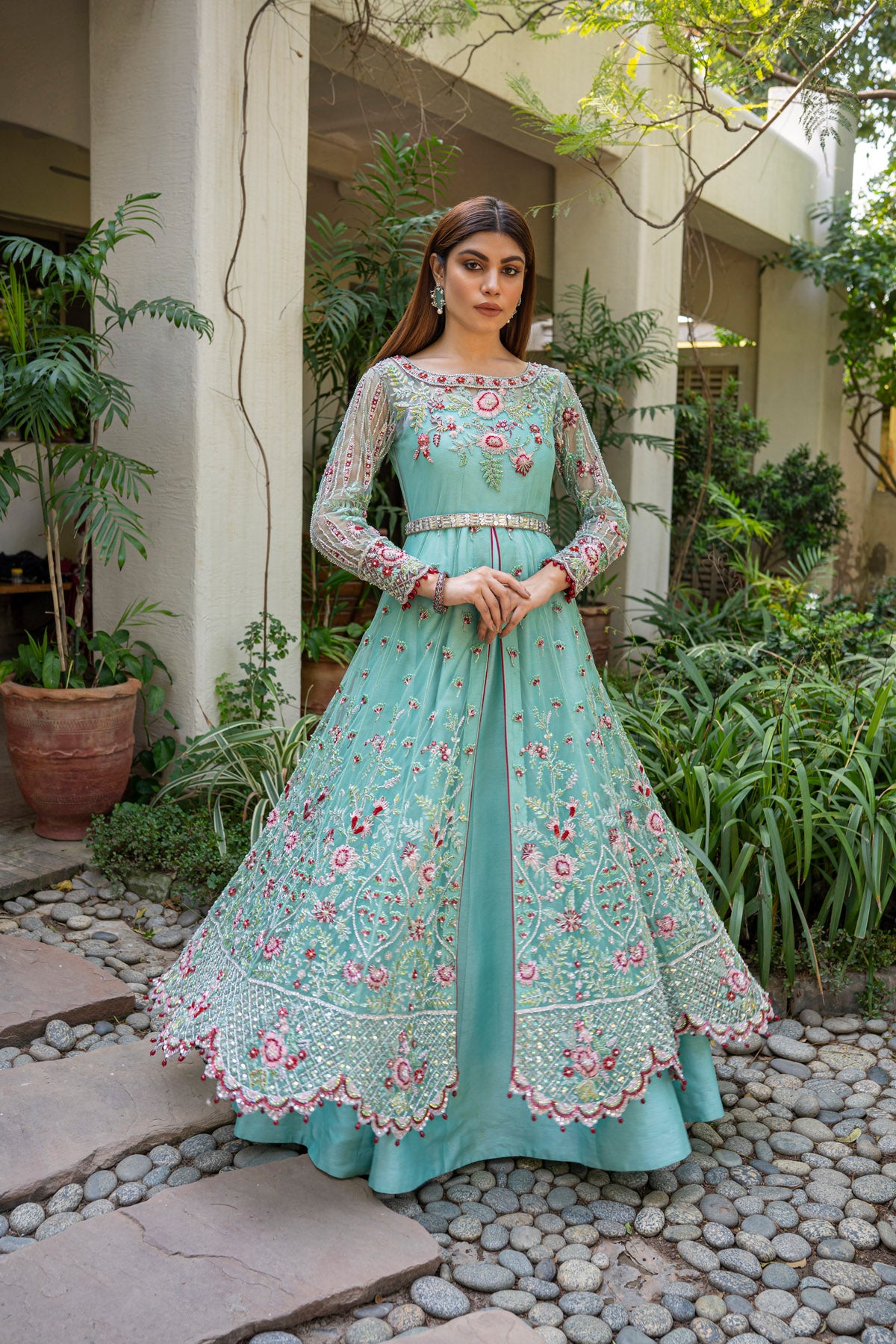Description: Dreamy tones of pastel blue marked with pinches of red and maroon adorned with charming floral handiwork, stands out like a glamorous ensemble for your winter festivities. THE GOWN IS MADE OF NET, EMBROIDERY, AND HAND EMBELLISHMENTS ALL OVER, THE INNER IS MADE OF RAW SILK, AND THE ORGANZA DUBATTA IS EMBELLISHED DUBBATTA WITH 4 SIDED BORDER.