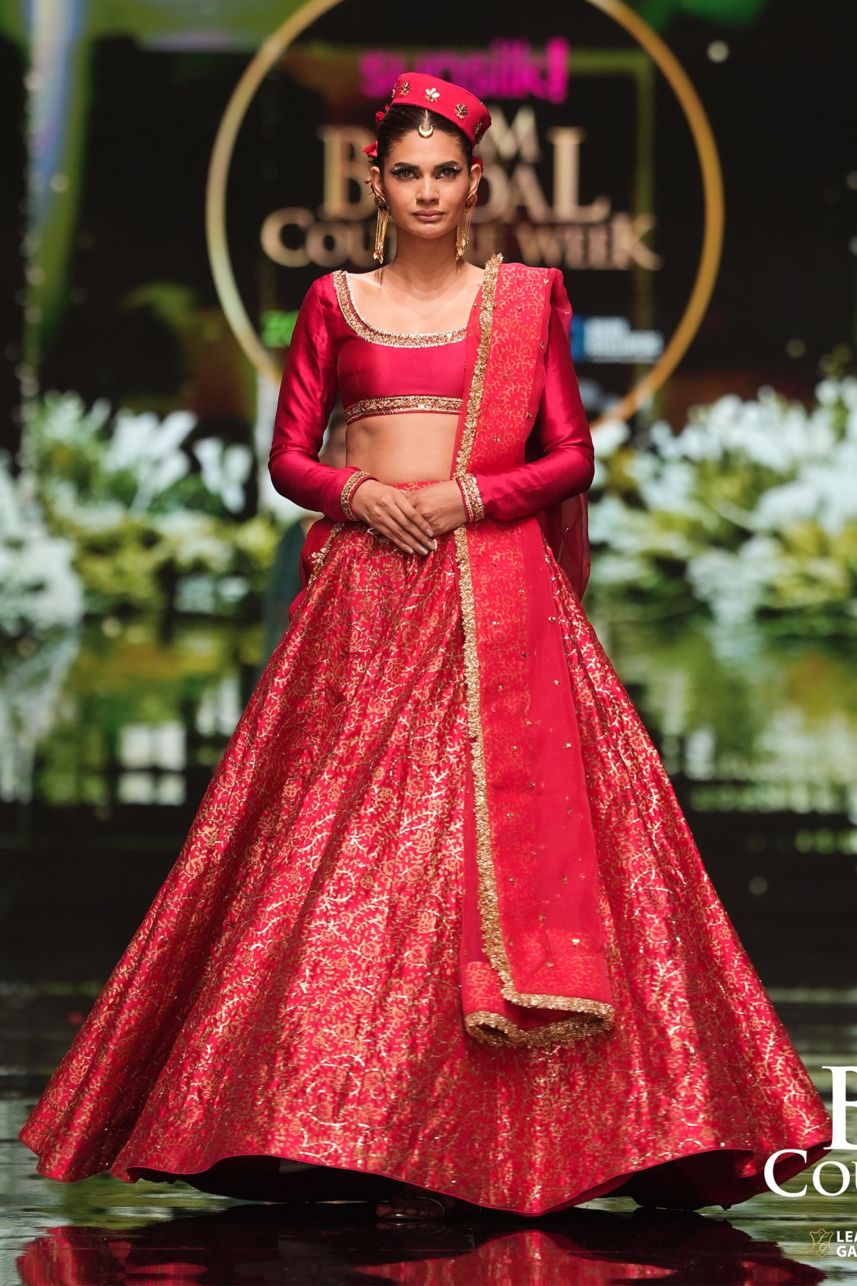 Gliding down the runway with undeniable allure, this double-layered jamni peshwas embodies timeless elegance with a regal flair. Crafted from chiffon fabric, the peshwas is beautifully adorned in golden details, adding radiance to the rich hue. It is finished with classic lappa detailing at the hem for a touch of tradition. Framing the look is a delicately embroidered net dupatta, featuring an intricate jaal pattern that lends an ethereal dimension to the ensemble.
