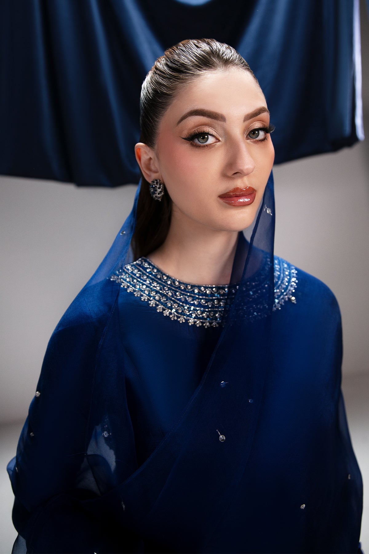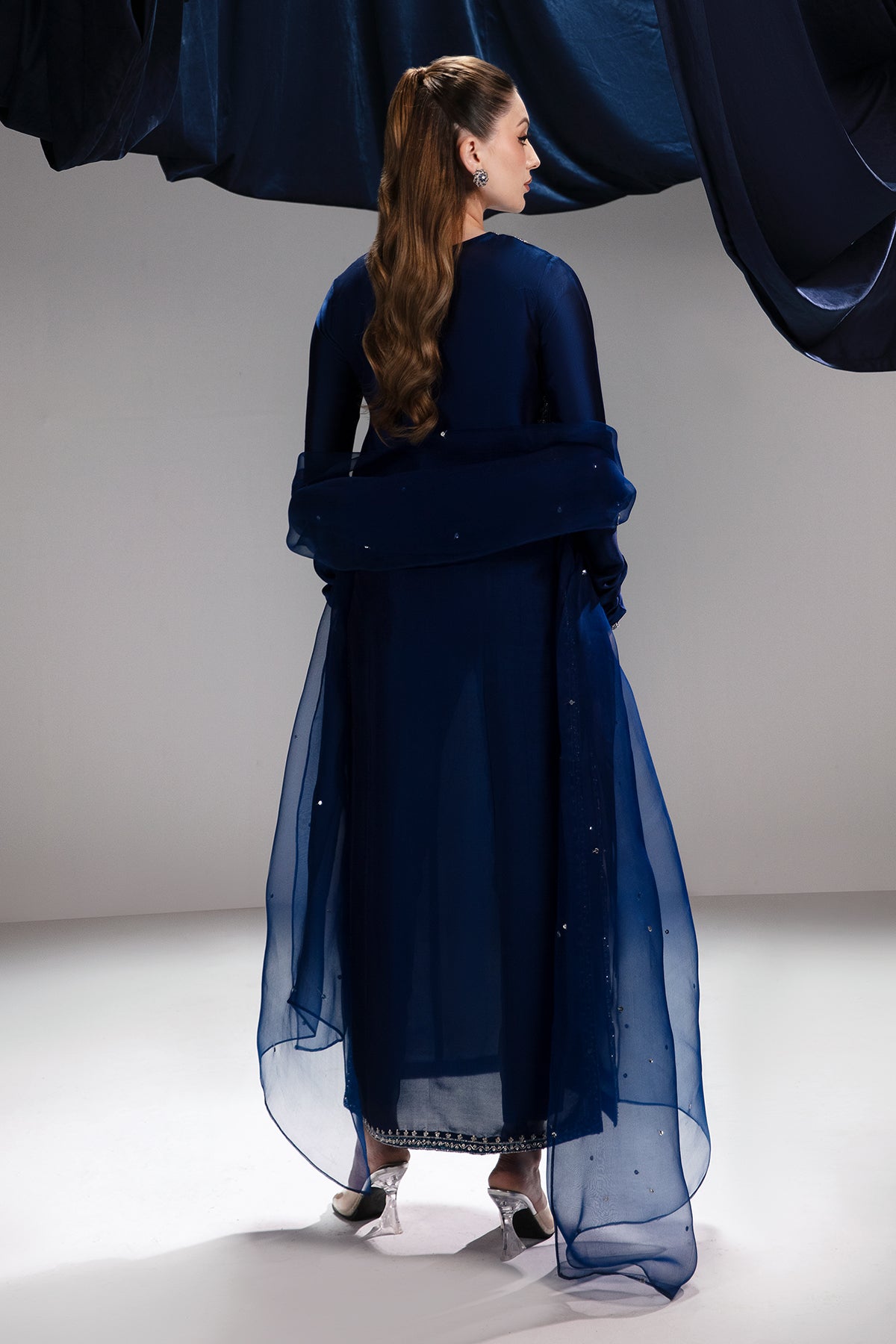 Description: Prepare to be dazzled by our stunning midnight blue long shirt, a masterpiece that combines elegance and intricate craftsmanship. The panelled A-line silk shirt boasts silver hand embellishments and churidar sleeves, adding a touch of traditional charm. It is paired with cigarette pants and sheer organza dupatta sprayed with shimmering sequins that catch the light with every movement, creating a mesmerizing aura. Stand out in any crowd with this timeless masterpiece!