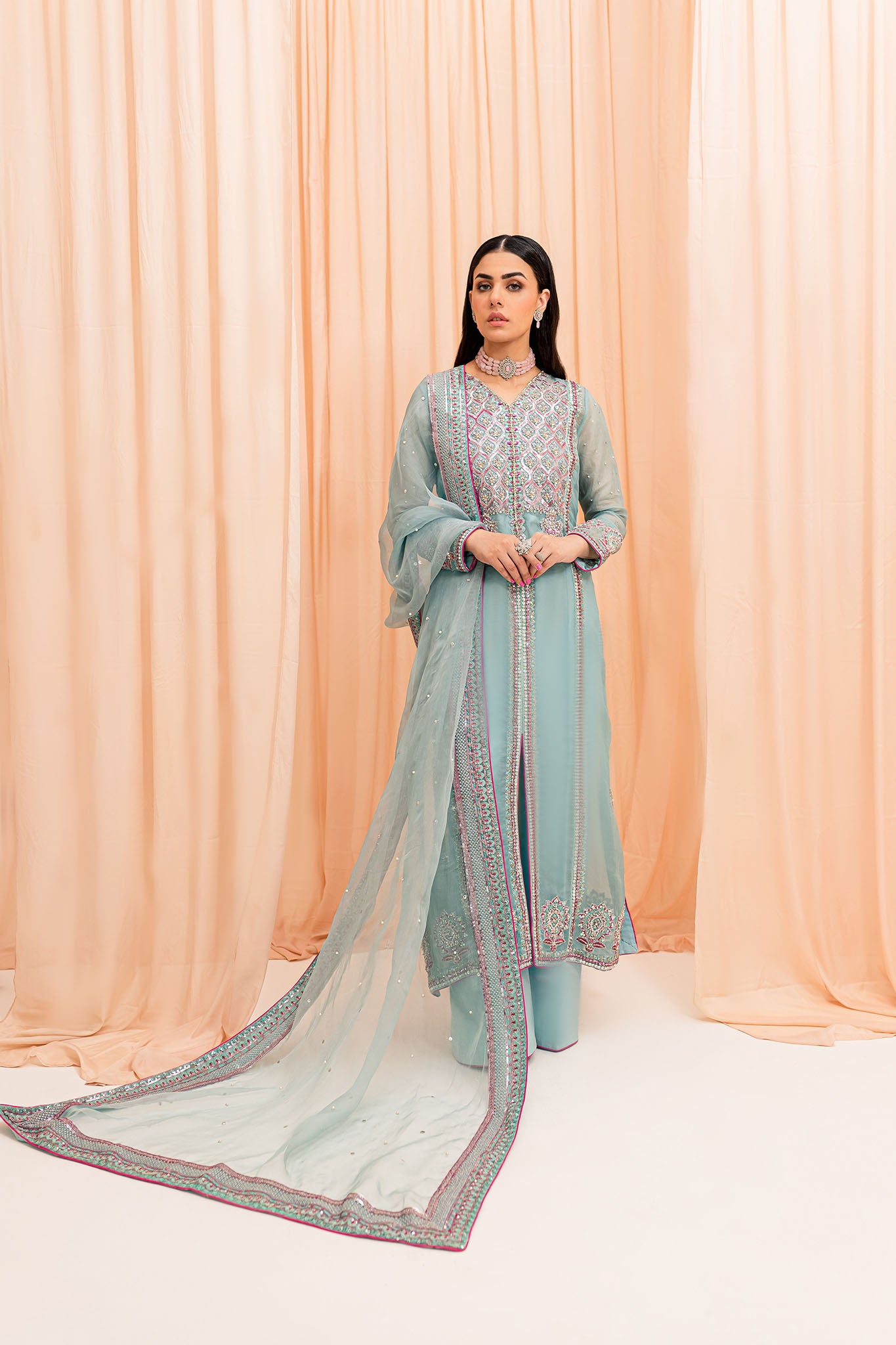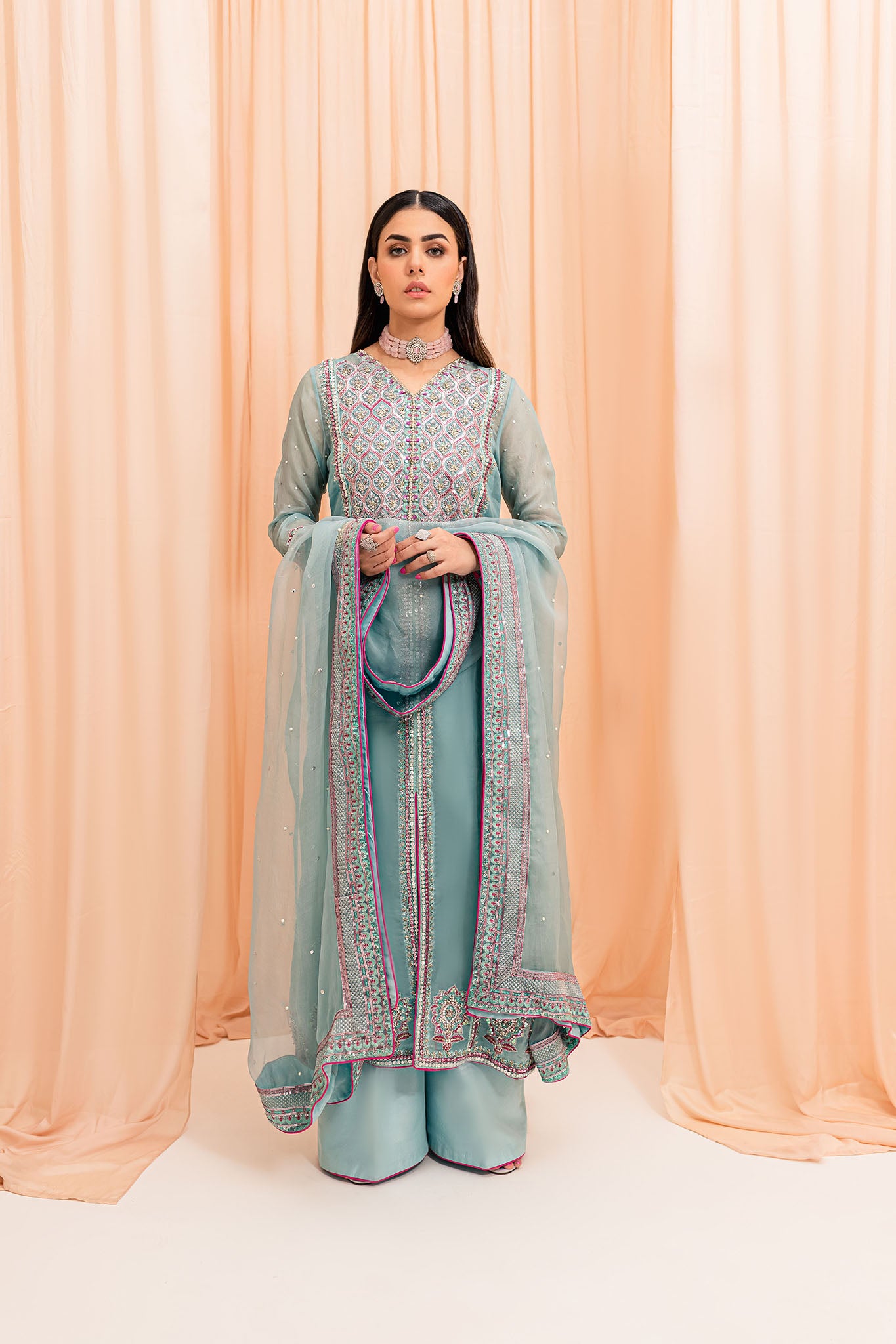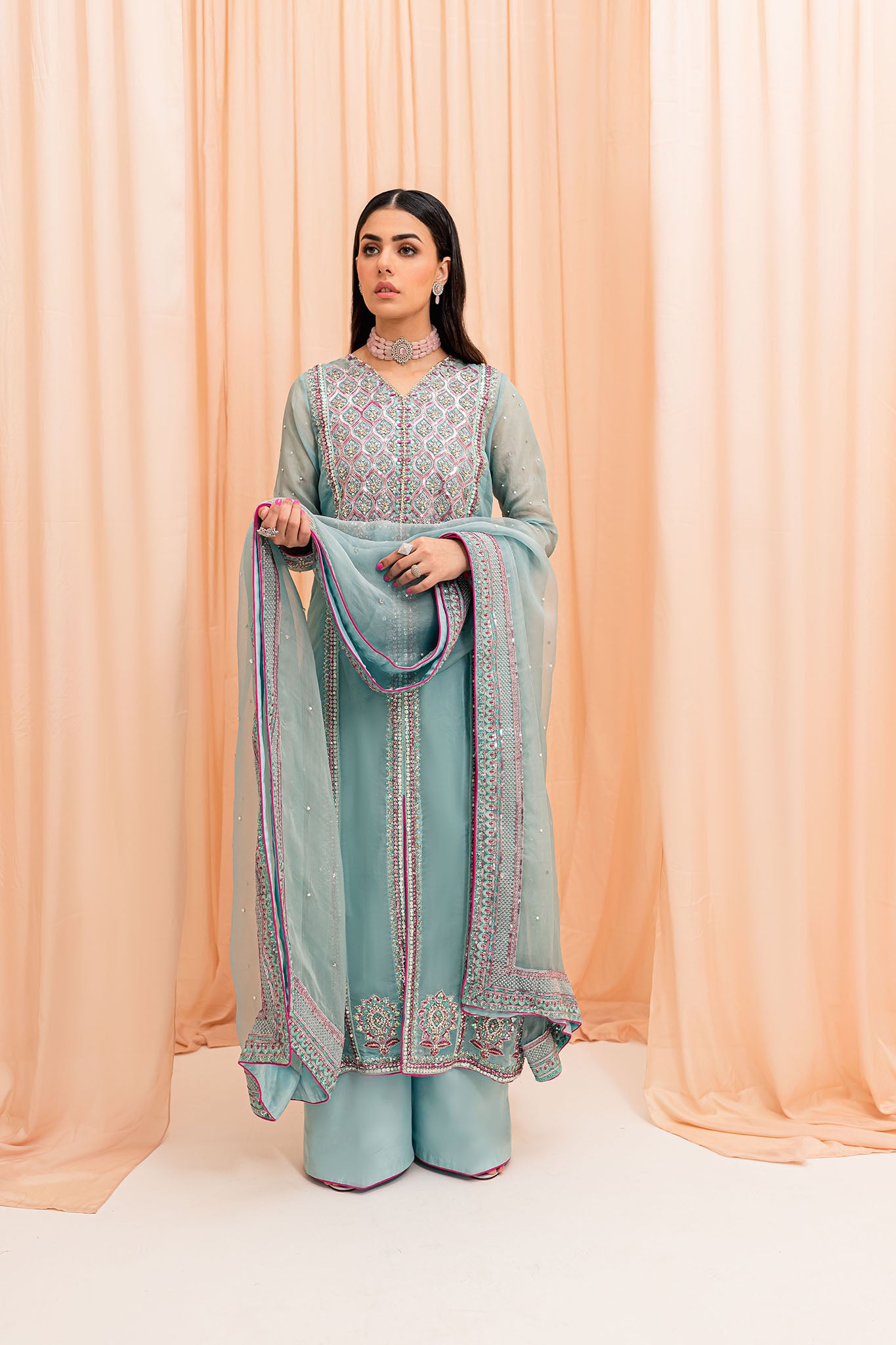 It is a center-slit shirt with heavily embellished borders & neckline enhancing the delicate work of nakshi, sequin, and cutdana. The playful combination of pink, silver, and golden on our studio’s favorite ice-blue canvas is completing its look. Pure Organza dupatta with motif spray is intricately embellished on all edges paired up with palazzo pants.