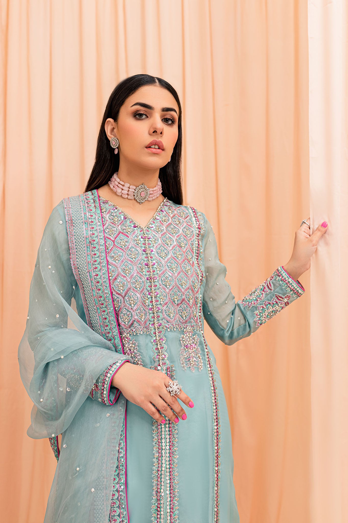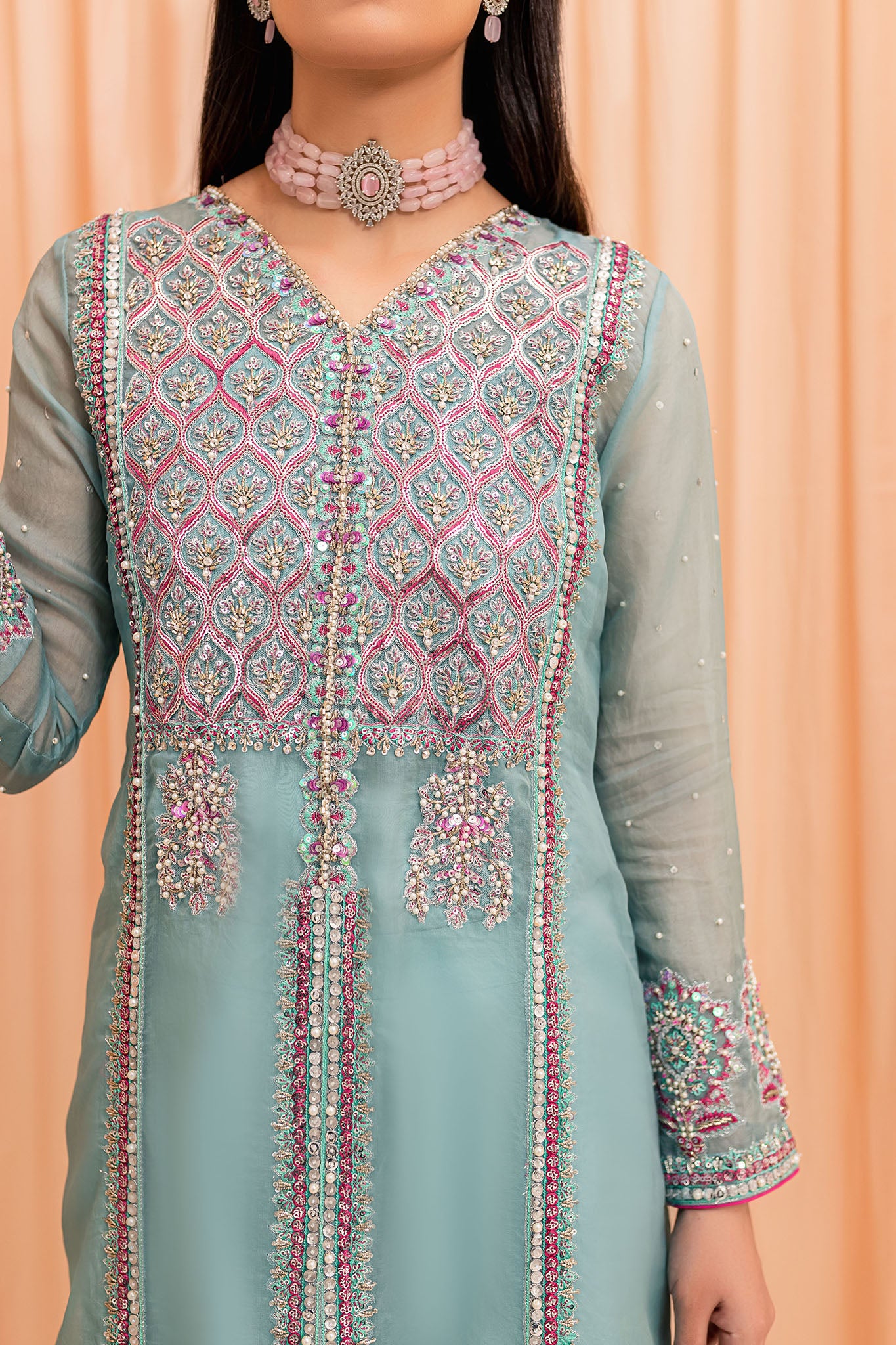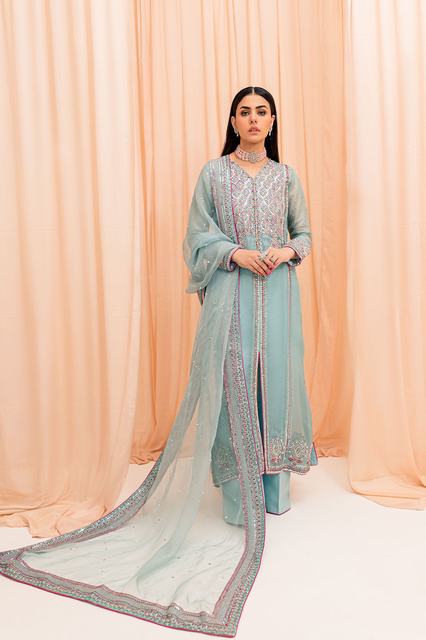 It is a center-slit shirt with heavily embellished borders & neckline enhancing the delicate work of nakshi, sequin, and cutdana. The playful combination of pink, silver, and golden on our studio’s favorite ice-blue canvas is completing its look. Pure Organza dupatta with motif spray is intricately embellished on all edges paired up with palazzo pants.