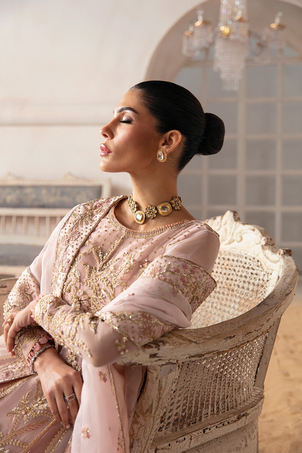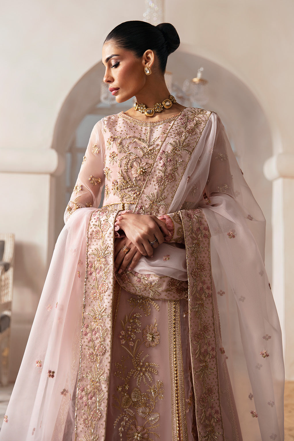 This jaw-dropping dusky pink pishwas, crafted with precision on sumptuous organza fabric stands as an impeccable choice. Embellished with intricate adda work of pearls, sequins, and kat dana in antique gold which adds a touch of sophistication and charm.