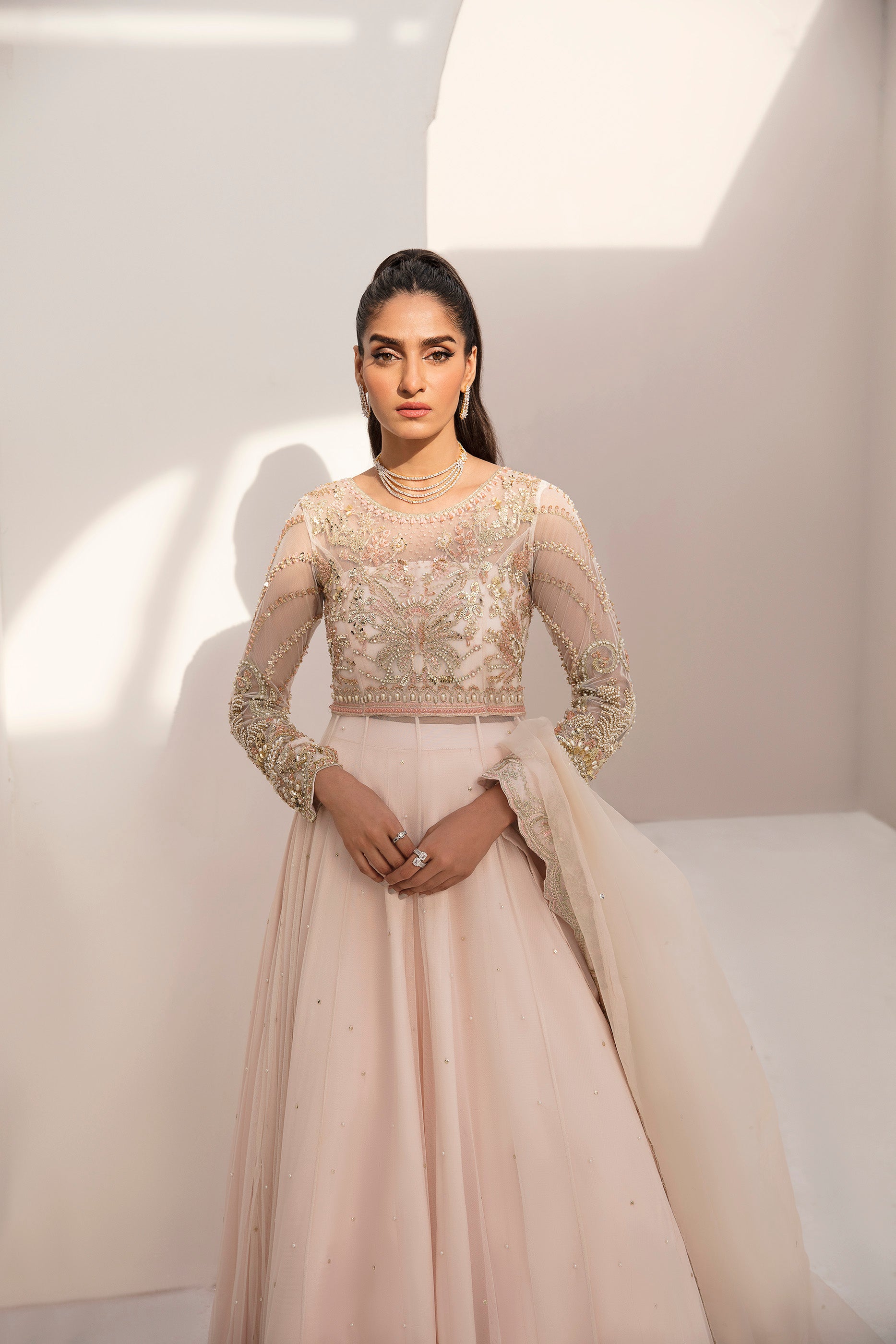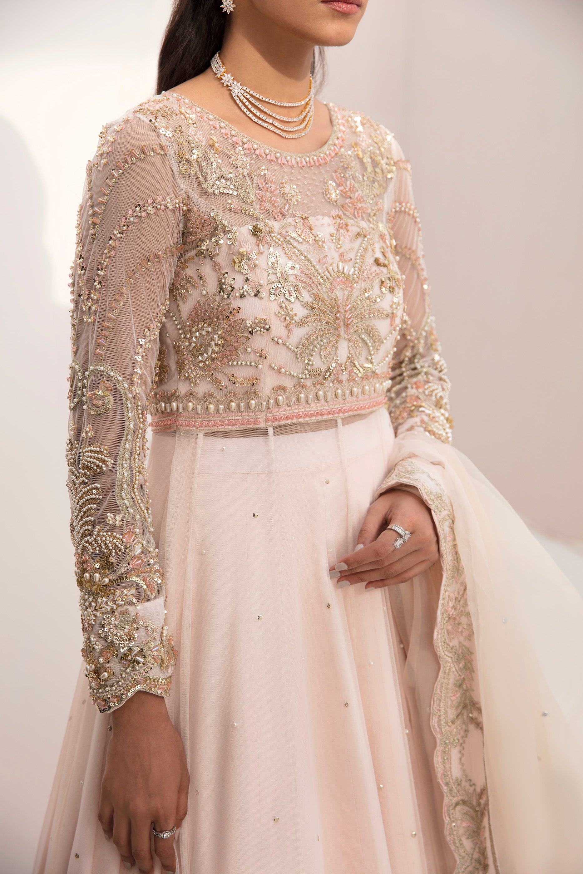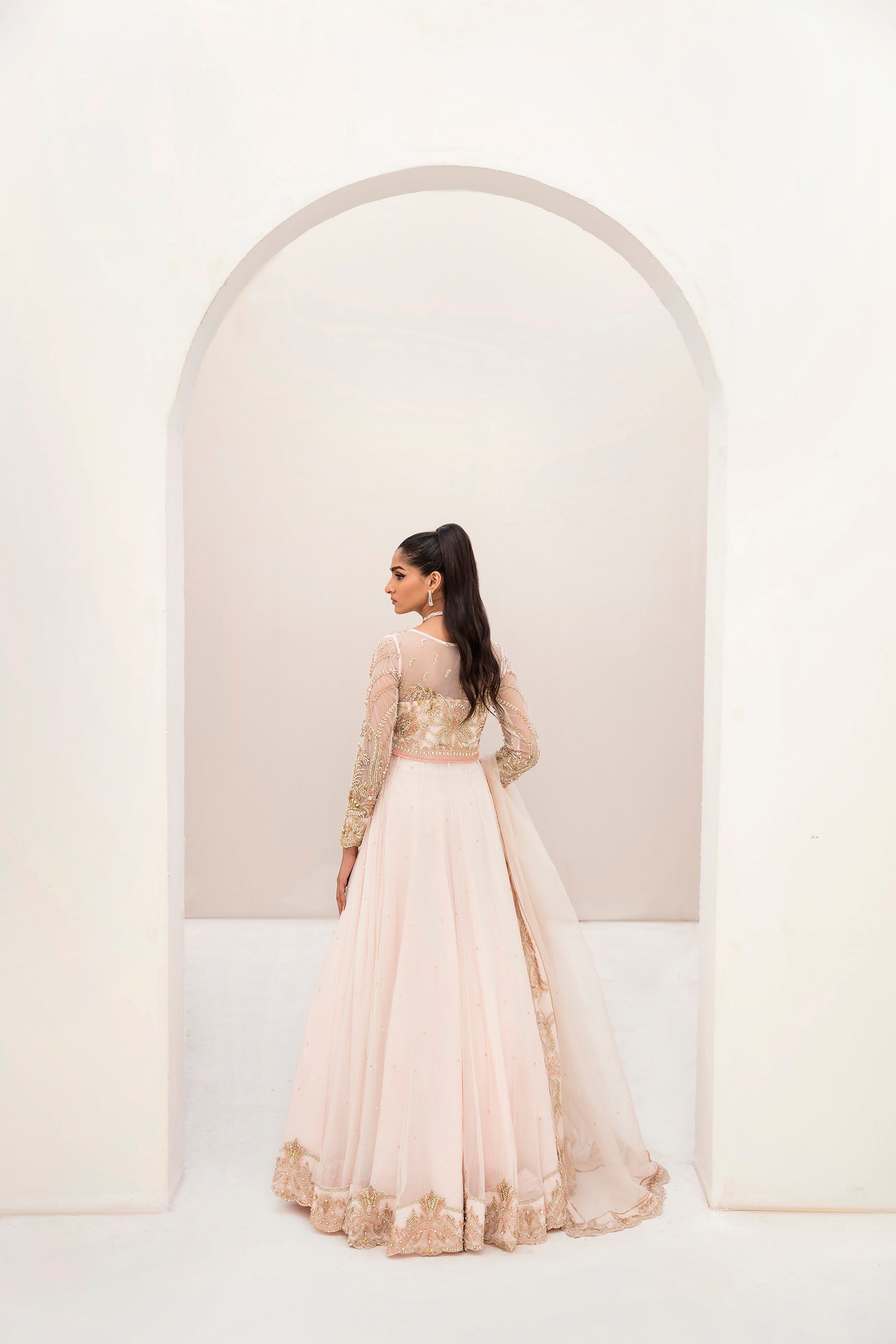 Exuding luxury and sophistication, this dusty pink net pishwas is bejeweled with 3D embellishments on the bodice and sleeves. The sequin spray on flare and embroidered borders add an extra touch of grandeur. Accompanying this captivating ensemble is a korean lehenga, designed to accentuate your silhouette with its graceful drape. The organza dupatta adorned with four-sided multi-head borders further uplifts the entire look.