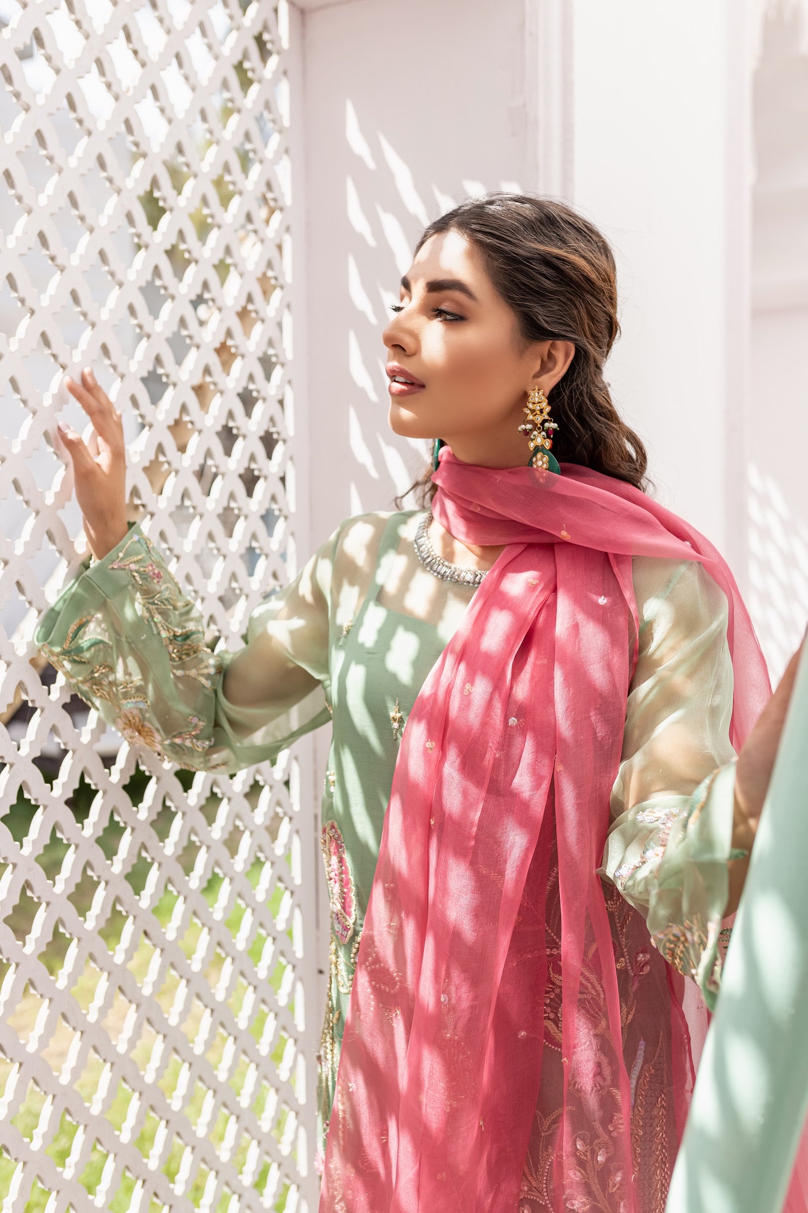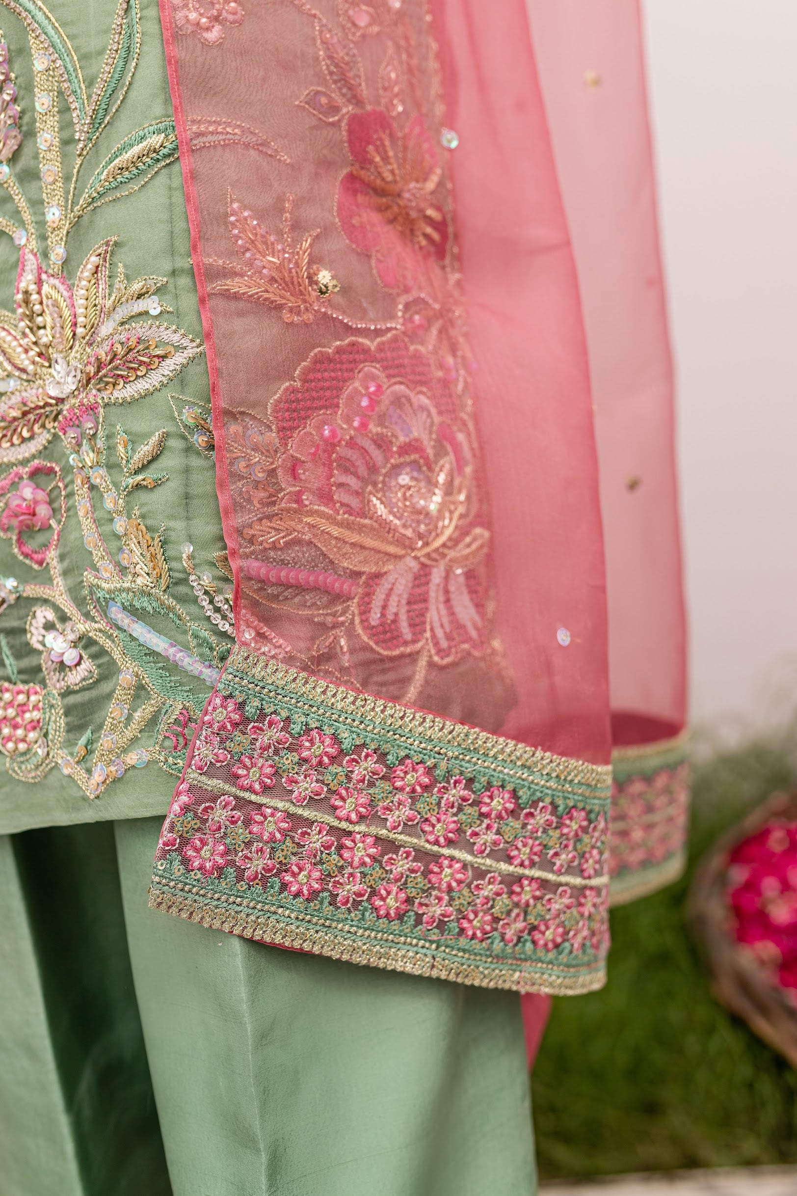 Embellished bottom of izar pants and Embroided pallu on medium organza dupatta.