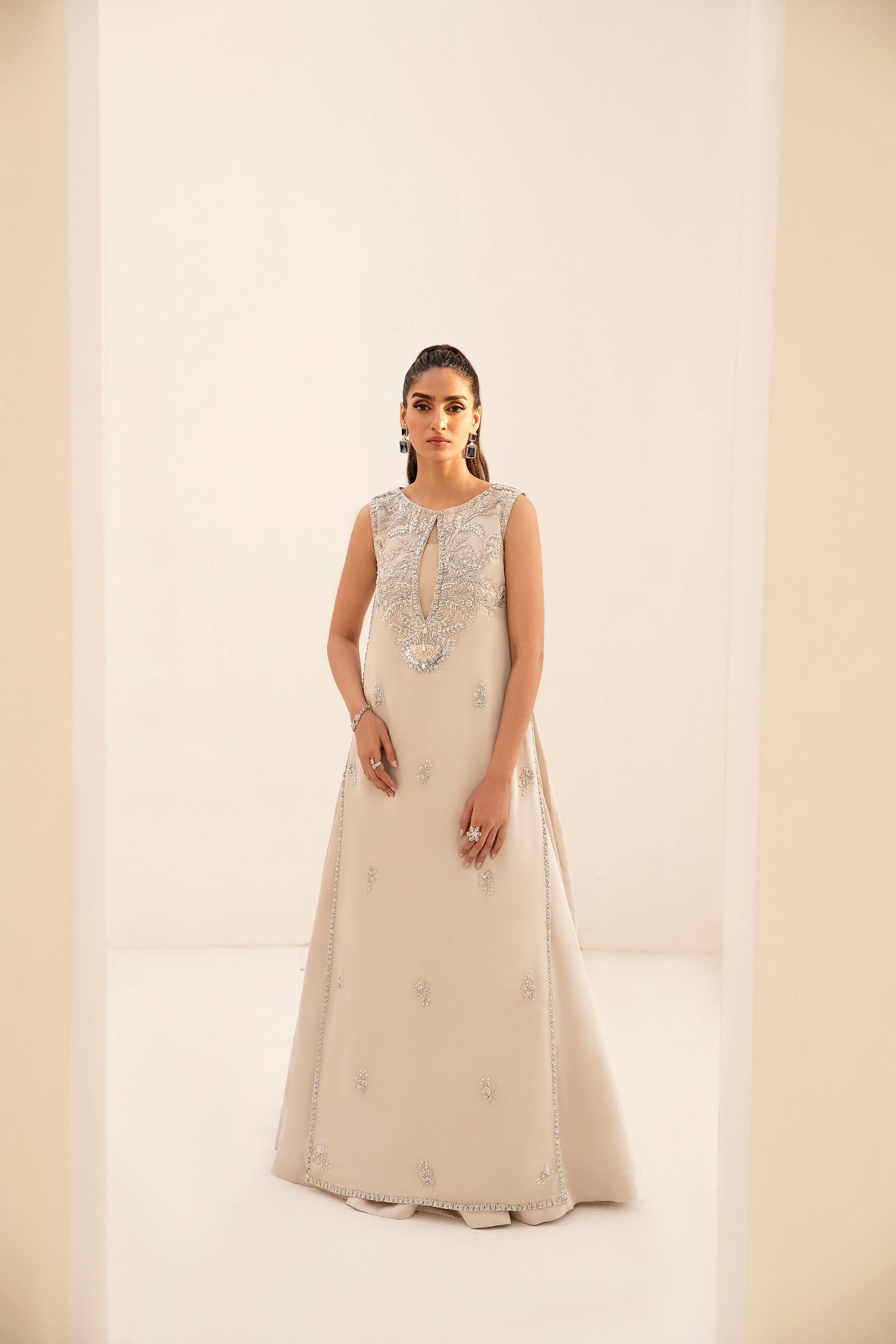 Featuring breathtaking fog grey A-line silk shirt meticulously designed with a unique neckline cut. This shirt is bedecked with intricate silver embellishments on the neckline, side slits, and has motifs spray in the front and back. It comes with a one piece gown crafted on silk fabric, which adds a feminine touch to this festive attire.