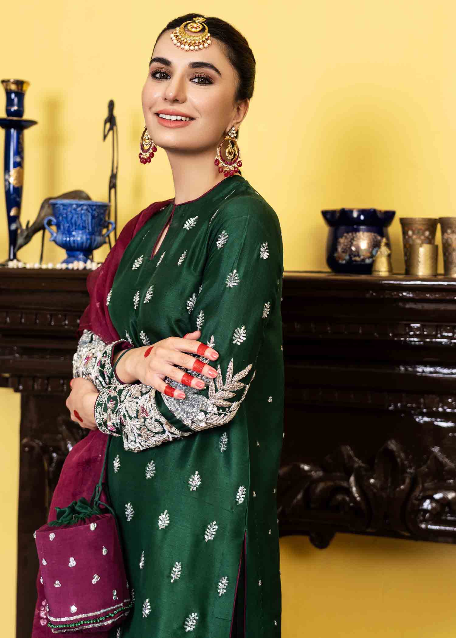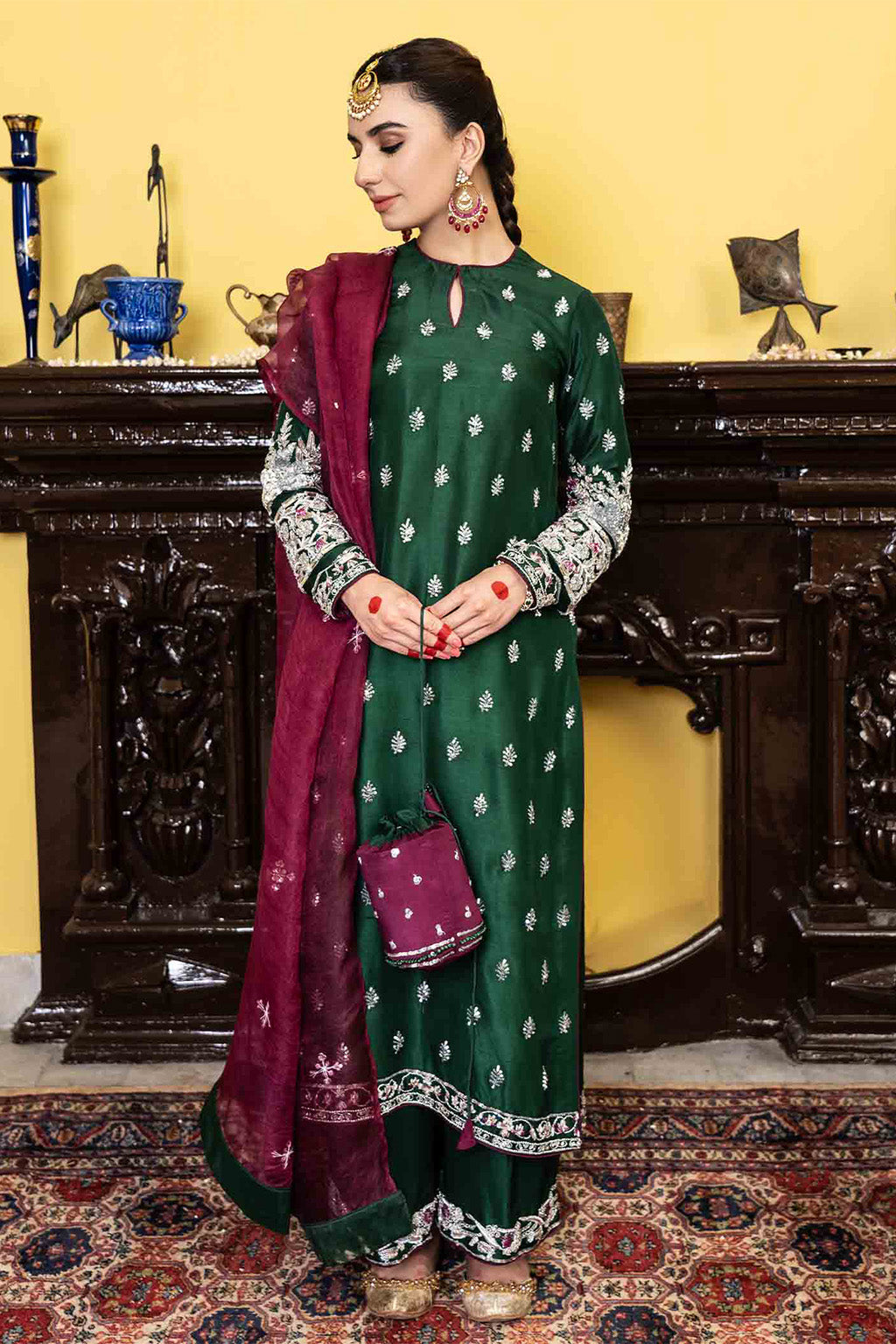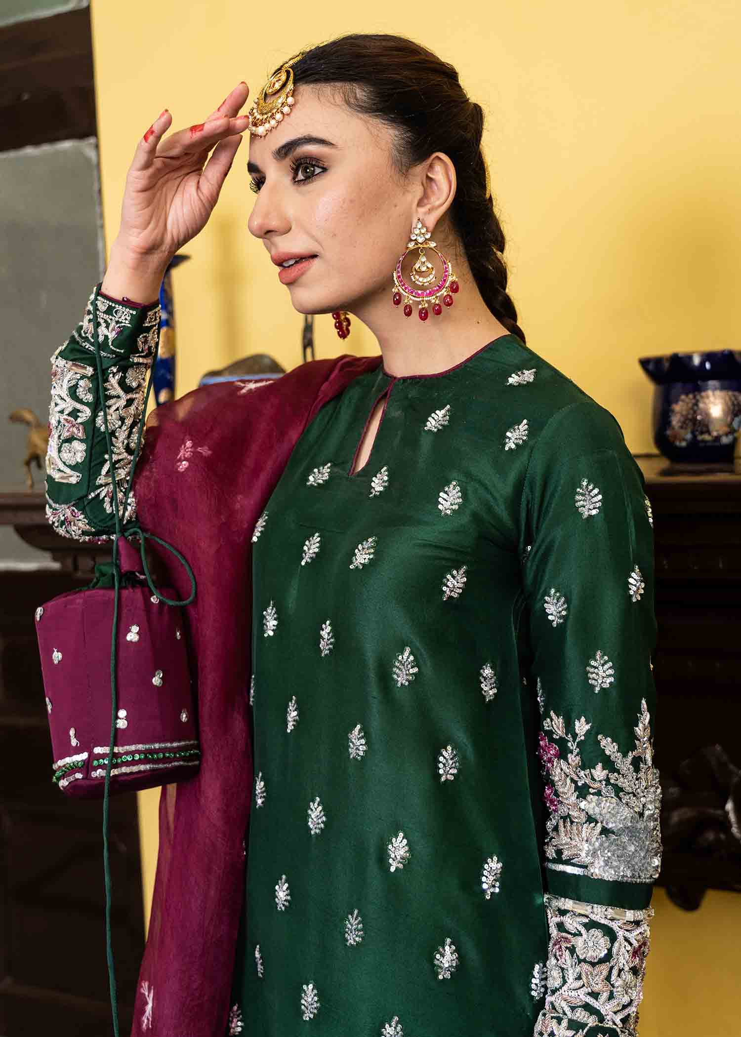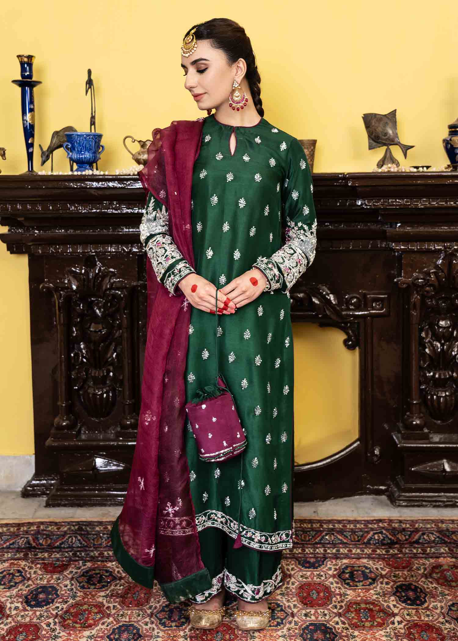 Description: Capturing the colors of Eid, transitioning with amorous touches of ethnic silhouette. This season emerald green is a head turner. Made in pure 80 gms raw silk totally hand embellished and organza dupatta embellished.