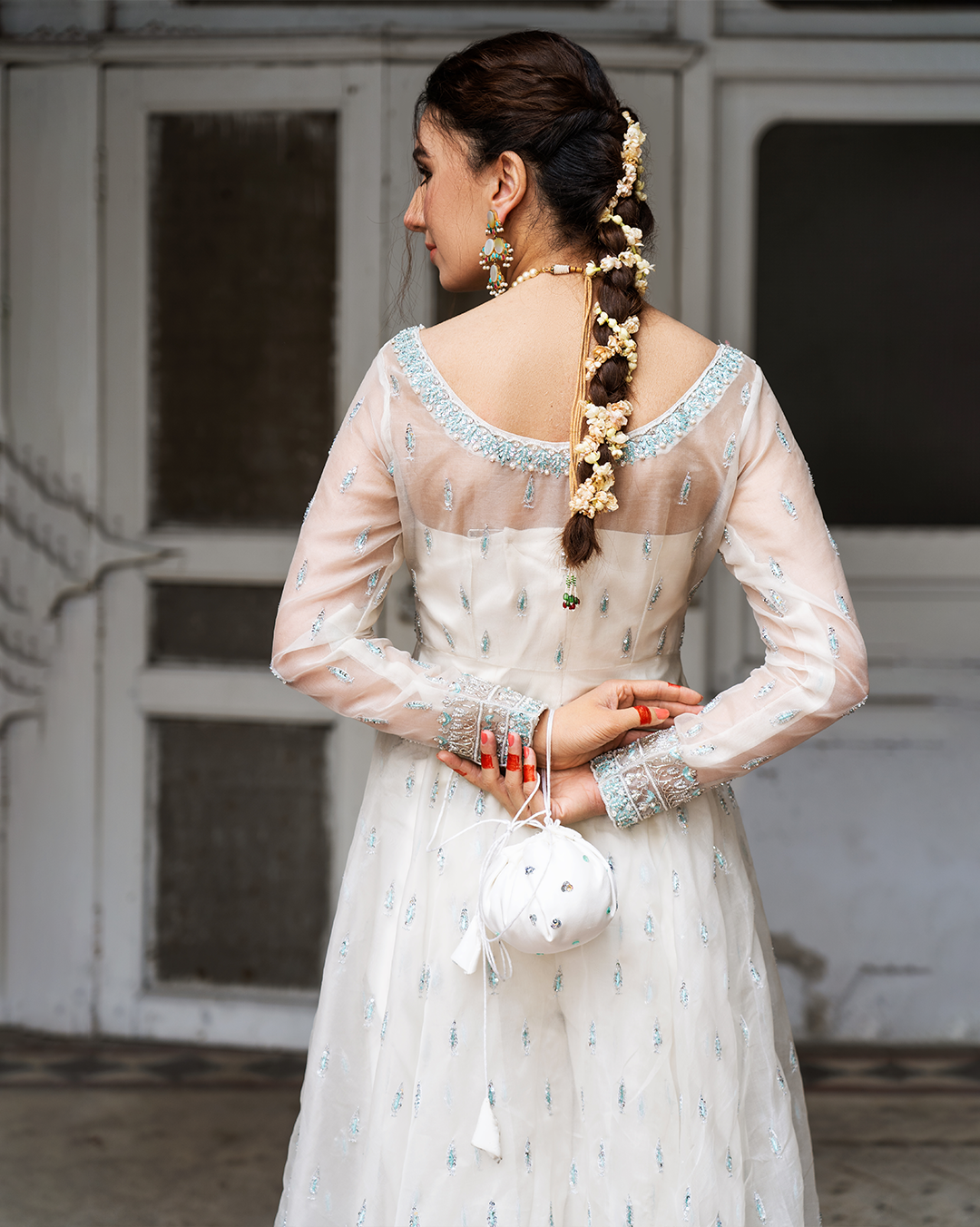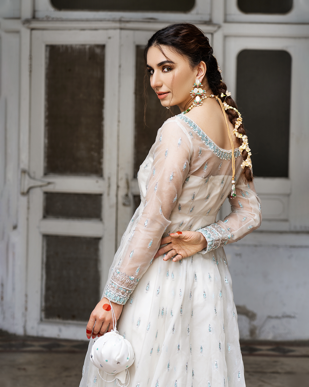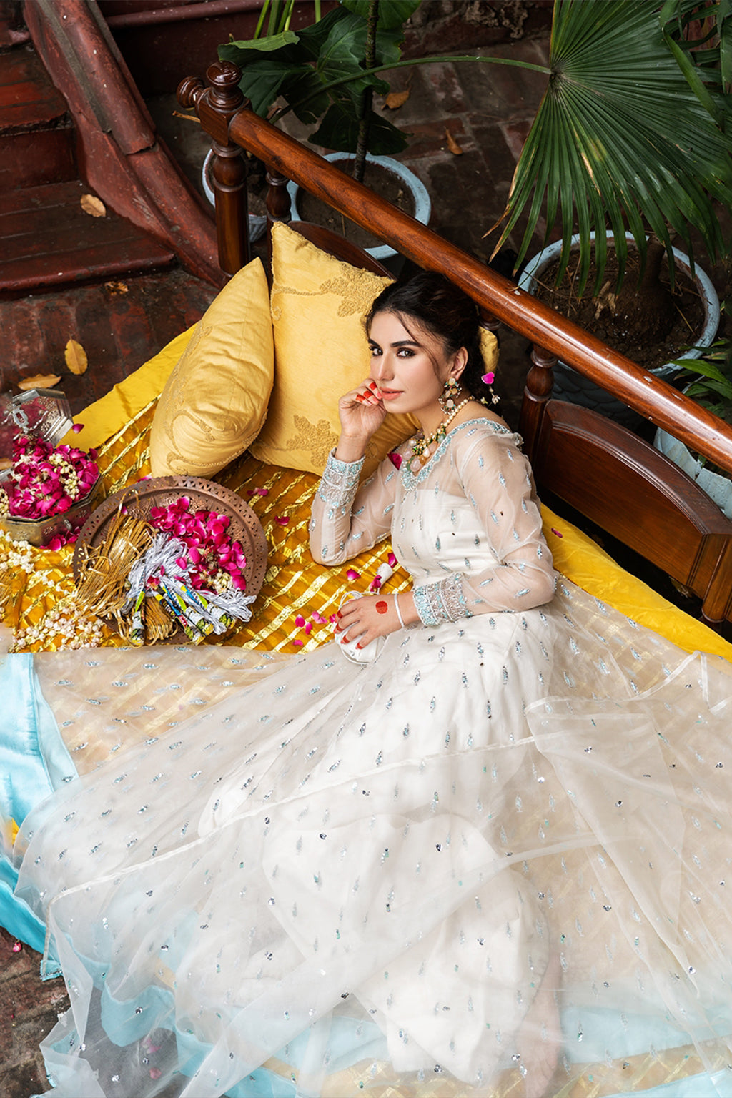 Description: The sumptuous off-white pishwas is adorned with exquisite silver and blue hand embellishments all over. Accompanied by wide-leg pants and organza dupatta with sequin spray, this ensemble is a true masterpiece of elegance.