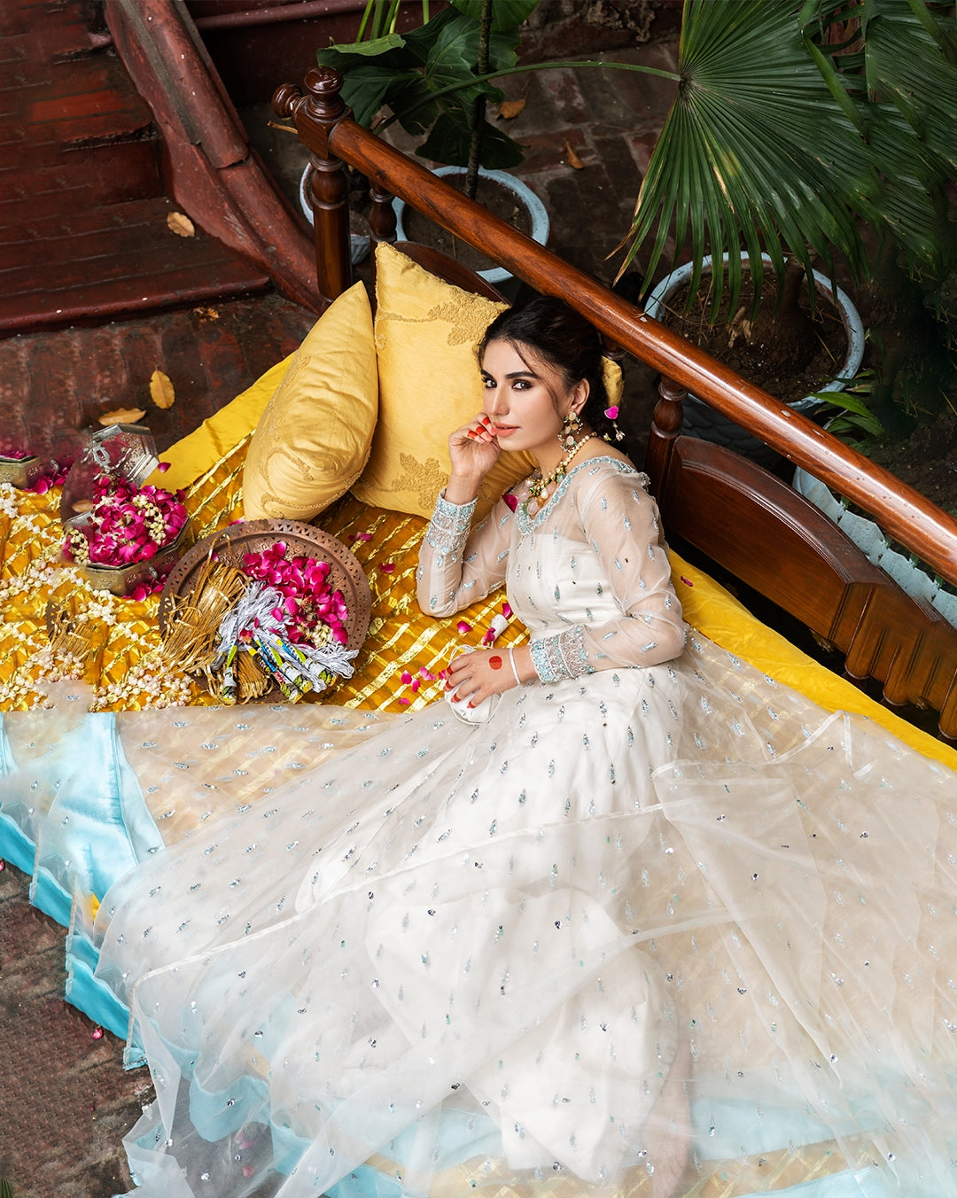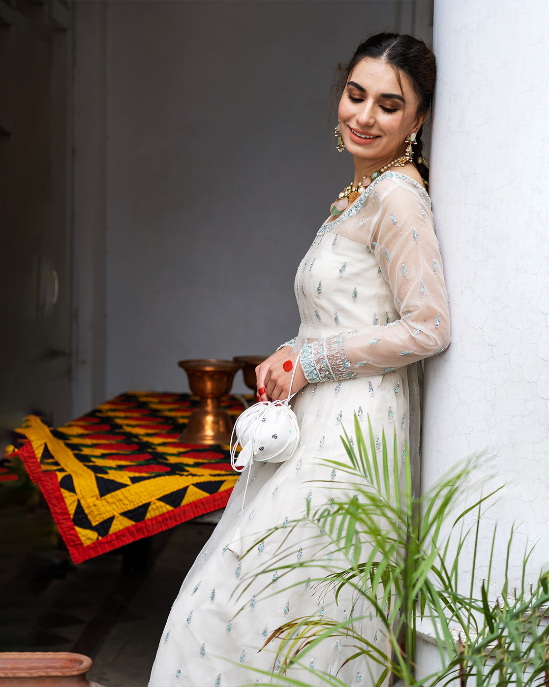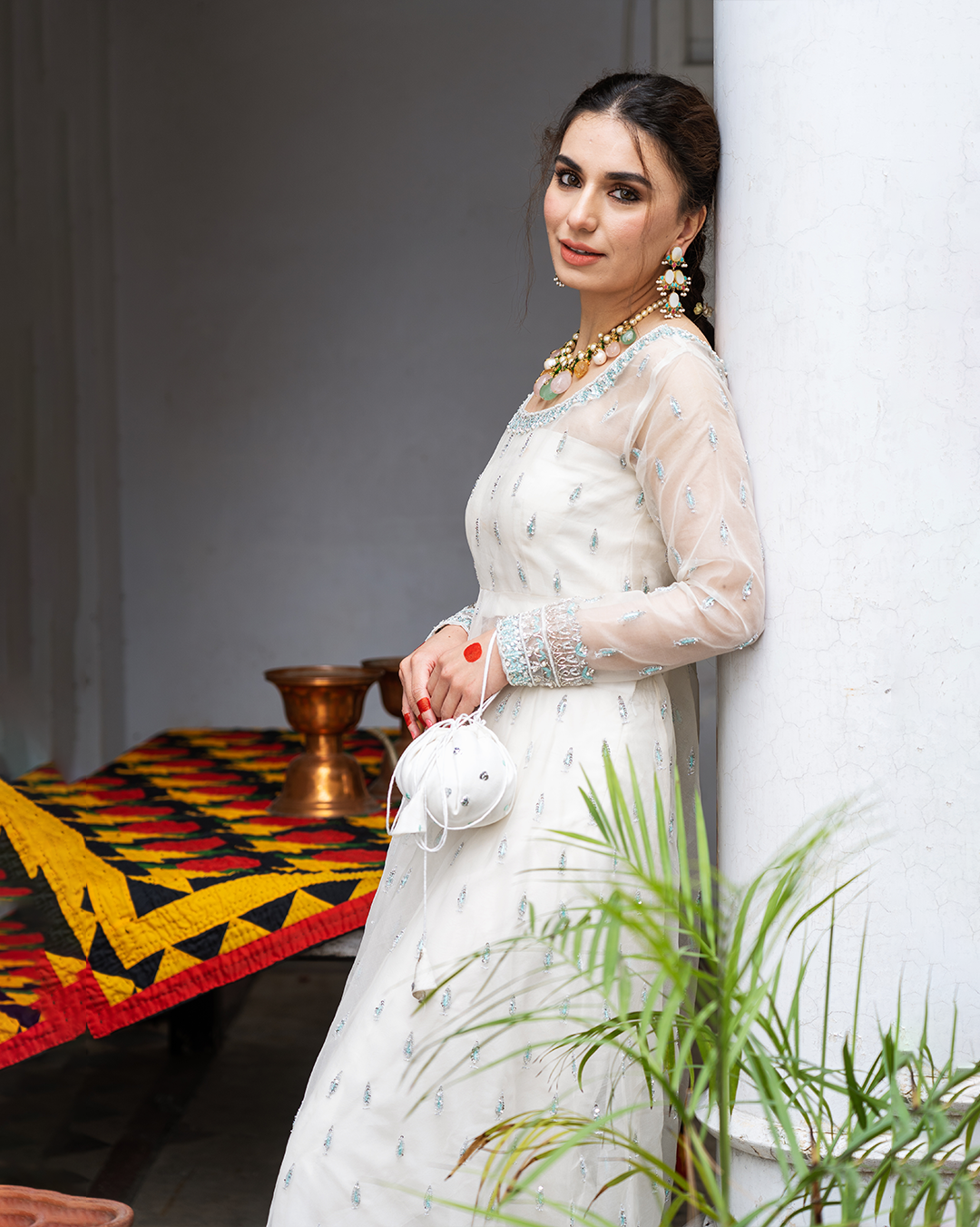 Description: The sumptuous off-white pishwas is adorned with exquisite silver and blue hand embellishments all over. Accompanied by wide-leg pants and organza dupatta with sequin spray, this ensemble is a true masterpiece of elegance.