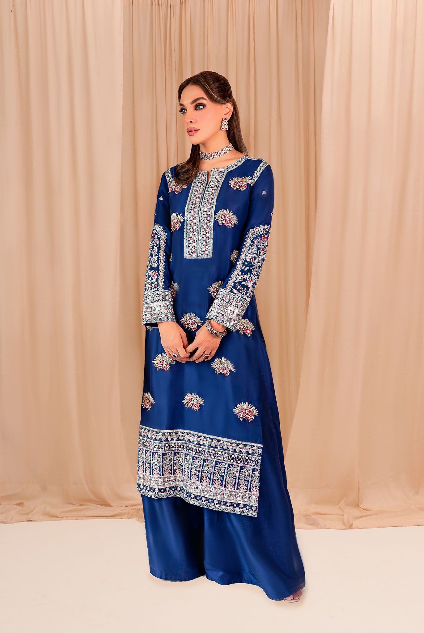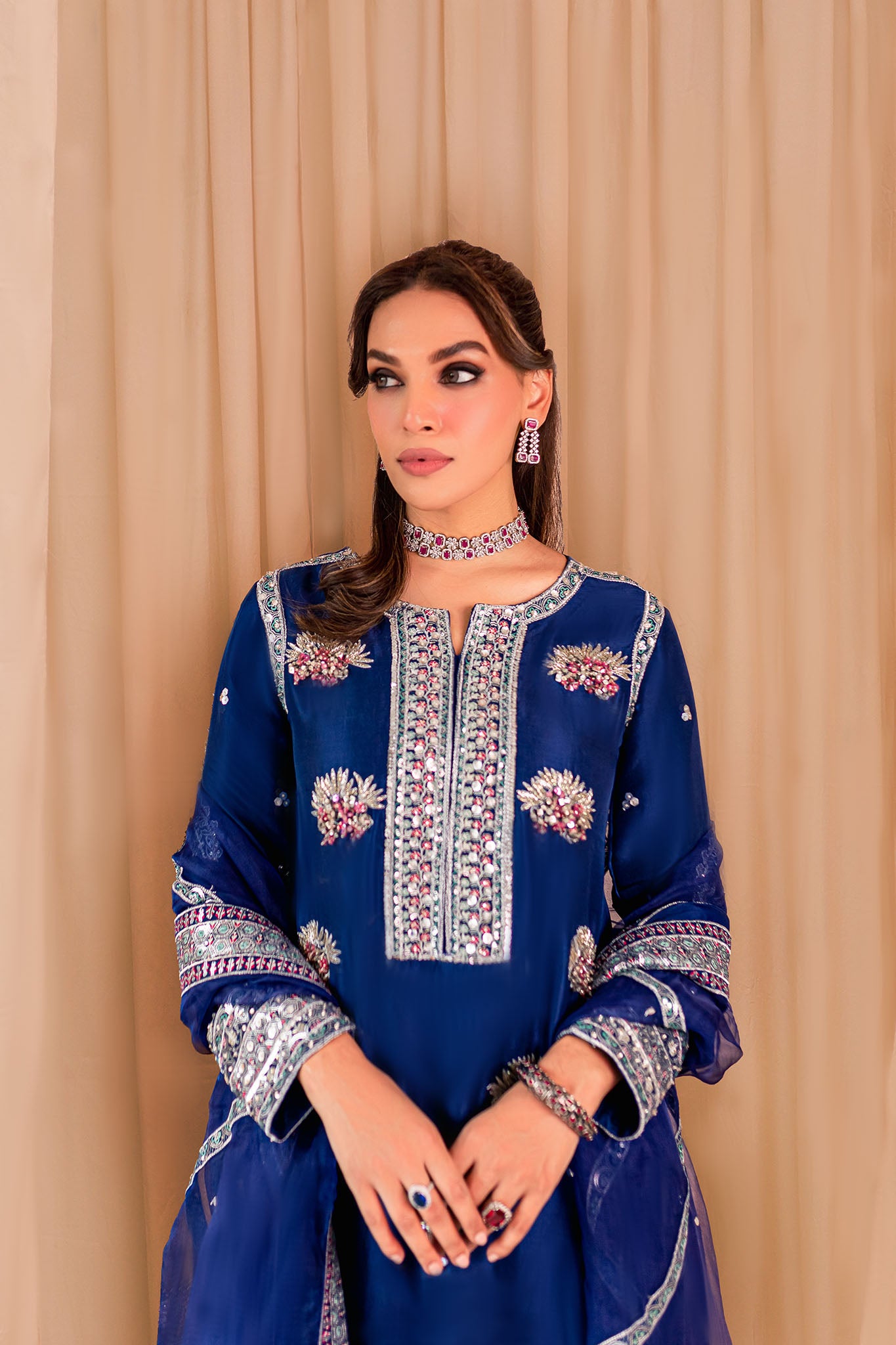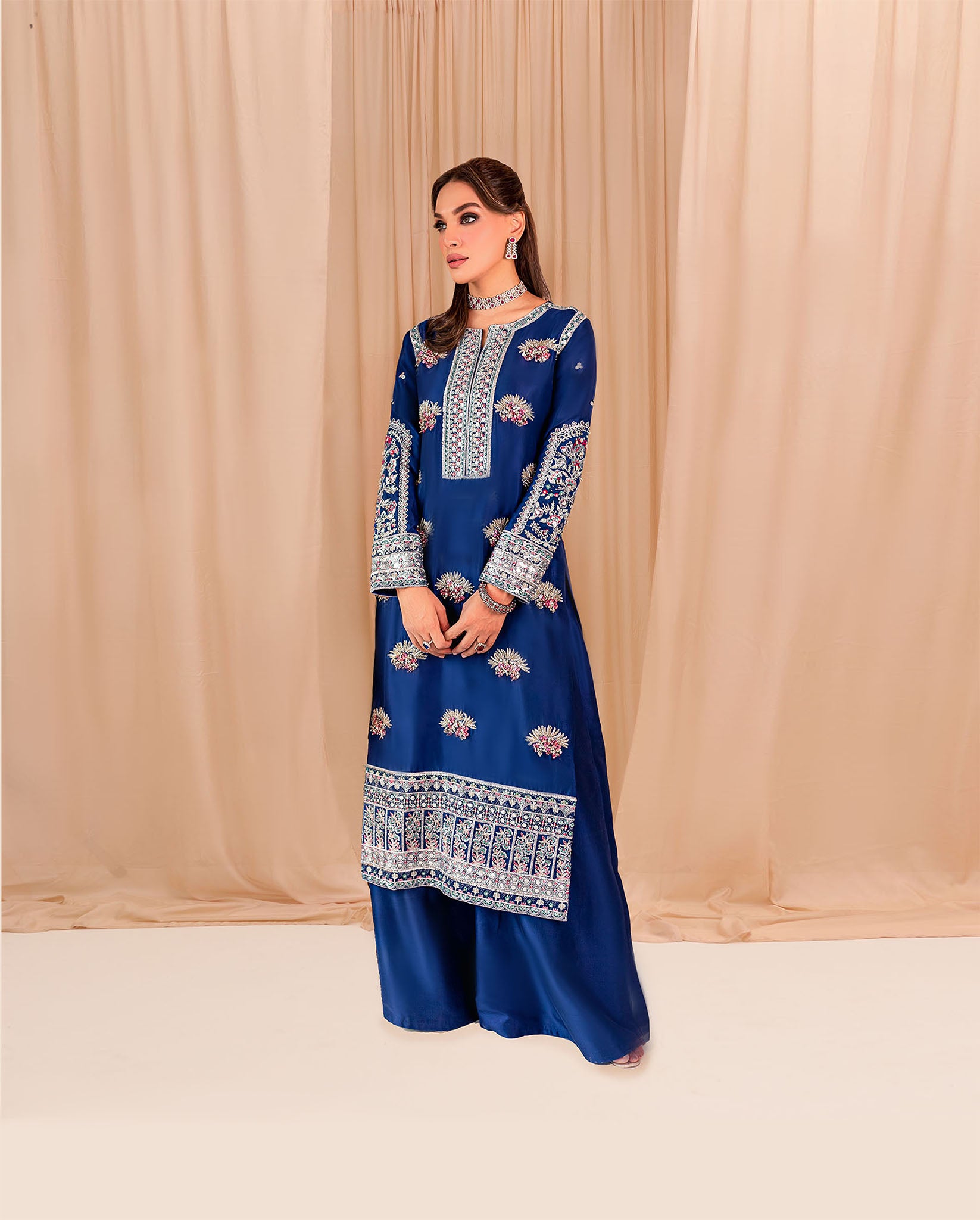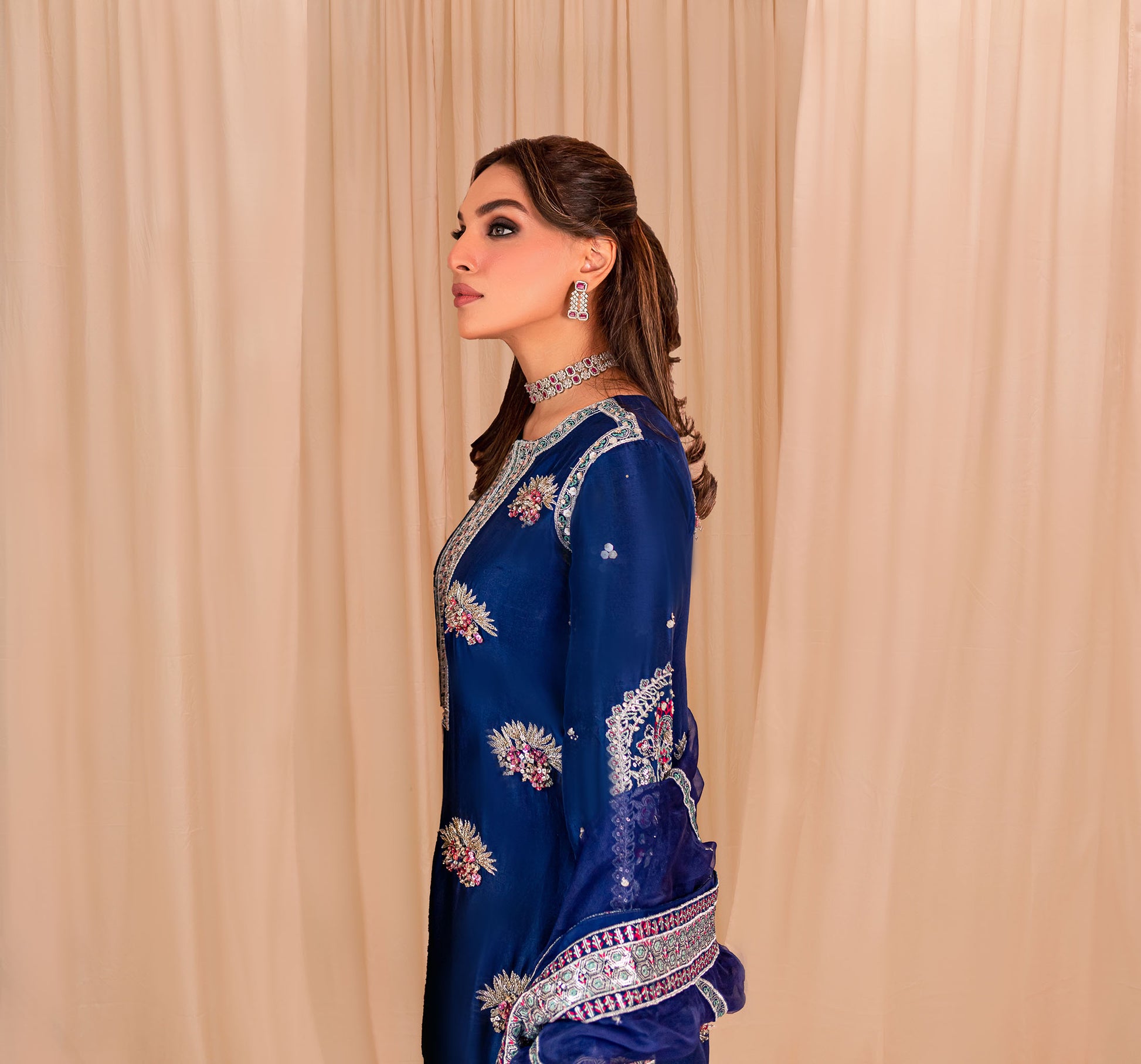 It is a long shirt executed with nakshi, dabka, crystal, sequin, and cutdana detailing in hues of silver, teal green, and shades of pink on deep blue canvas paired up with sharara pants. Pure organza dupatta that is beautifully embroidered on all edges spreaded with sequin spray.