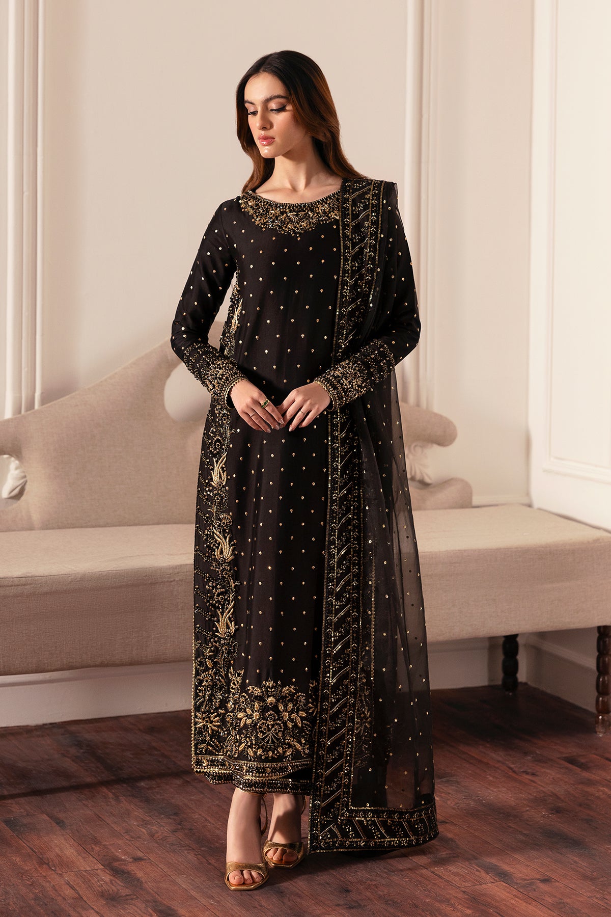 Description: Make striking statement of timeless allure in this breathtaking black silk ensemble. The straight cut shirt is heavily ornamented with gold embellishments, gracefully interwind with black crystals and stones creating a mesmerising play of depth and brilliance. Paired effortlessly with wide-leg silk pants and embroidered sheer organza dupatta, This look is the epitome of refined elegance. The sequin spray all over the dupatta further adds an ethereal touch, ensuring a look that is enchanting.