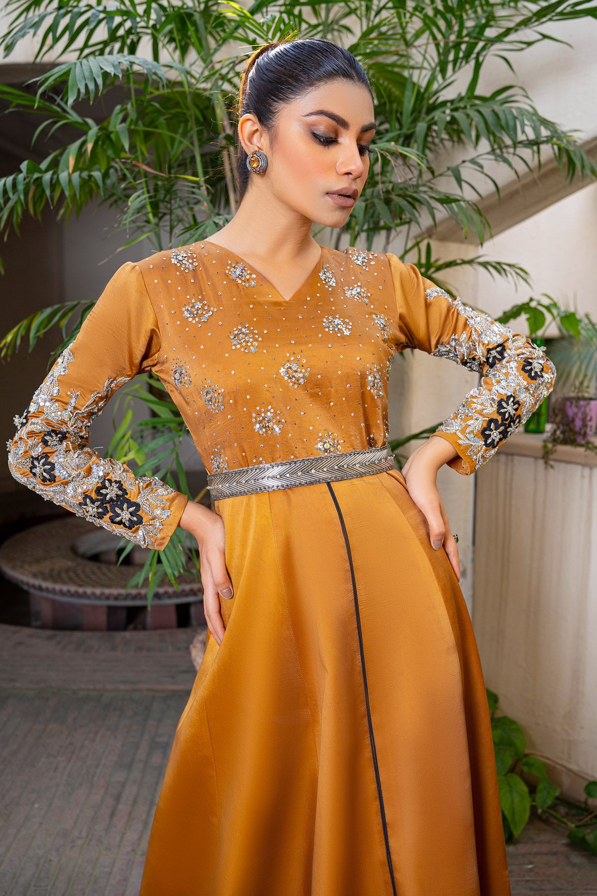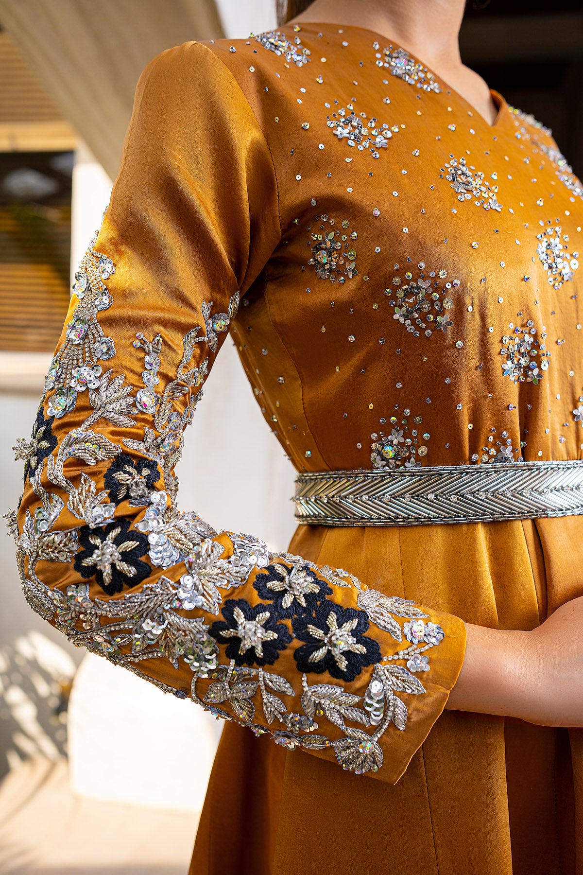 Description: Fusion of simplistic flares with a stellar top engraved with our signature handiwork and a stylish flair. This lovely ensemble is a must have for your coming festivities. MADE IN SHAMOZ SILK 80 GMS FUSED WITH TURKISH FUSING, TOTALLY HAND EMBELLISHED, BELT IS HAND EMBELLISHED.