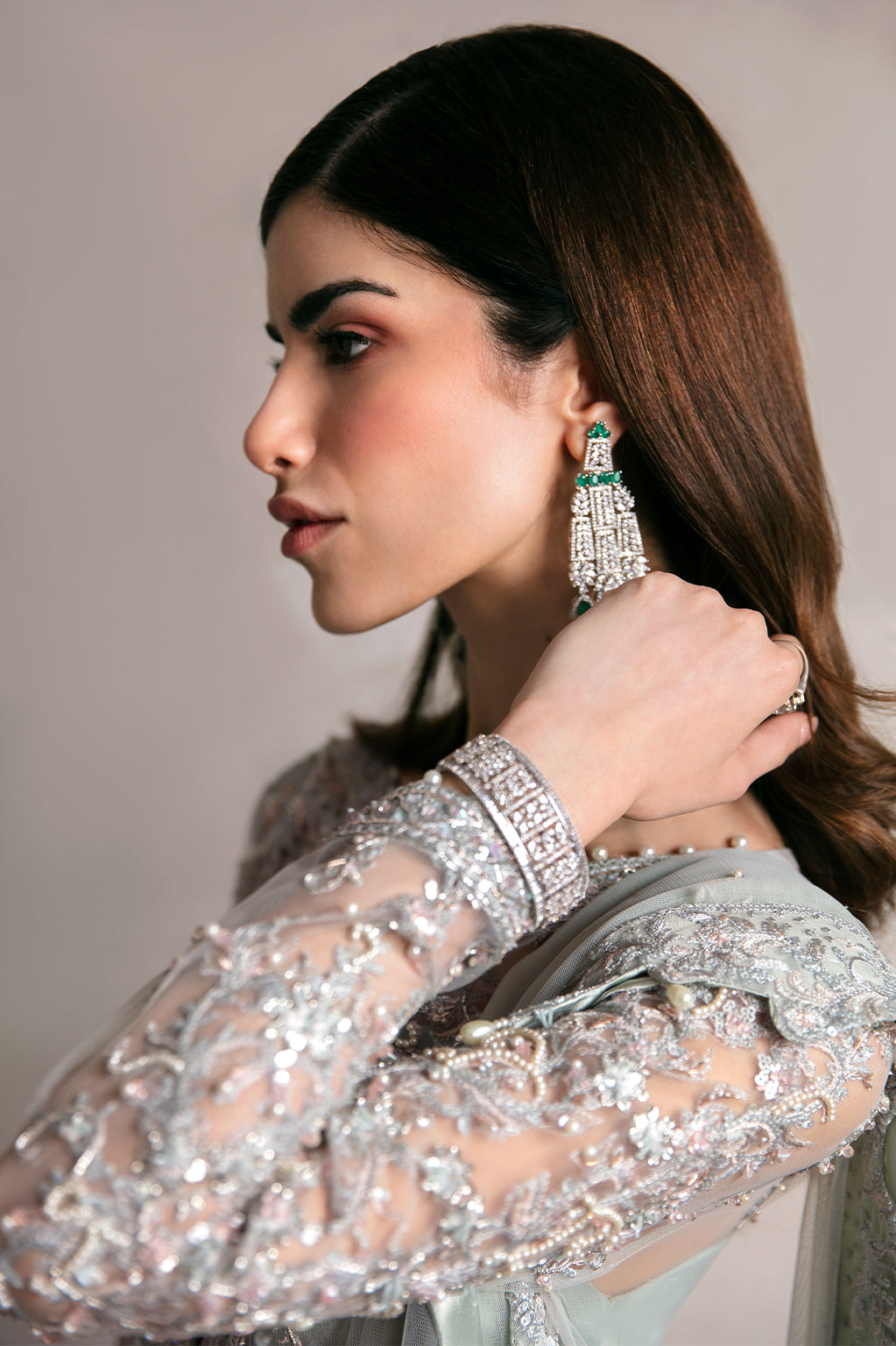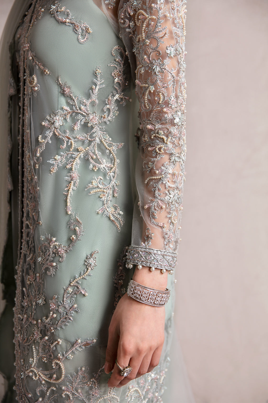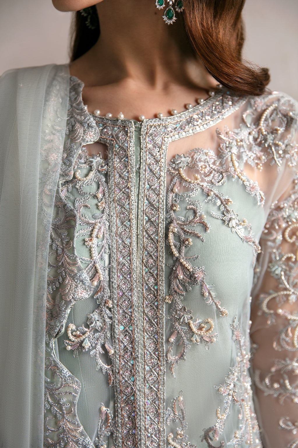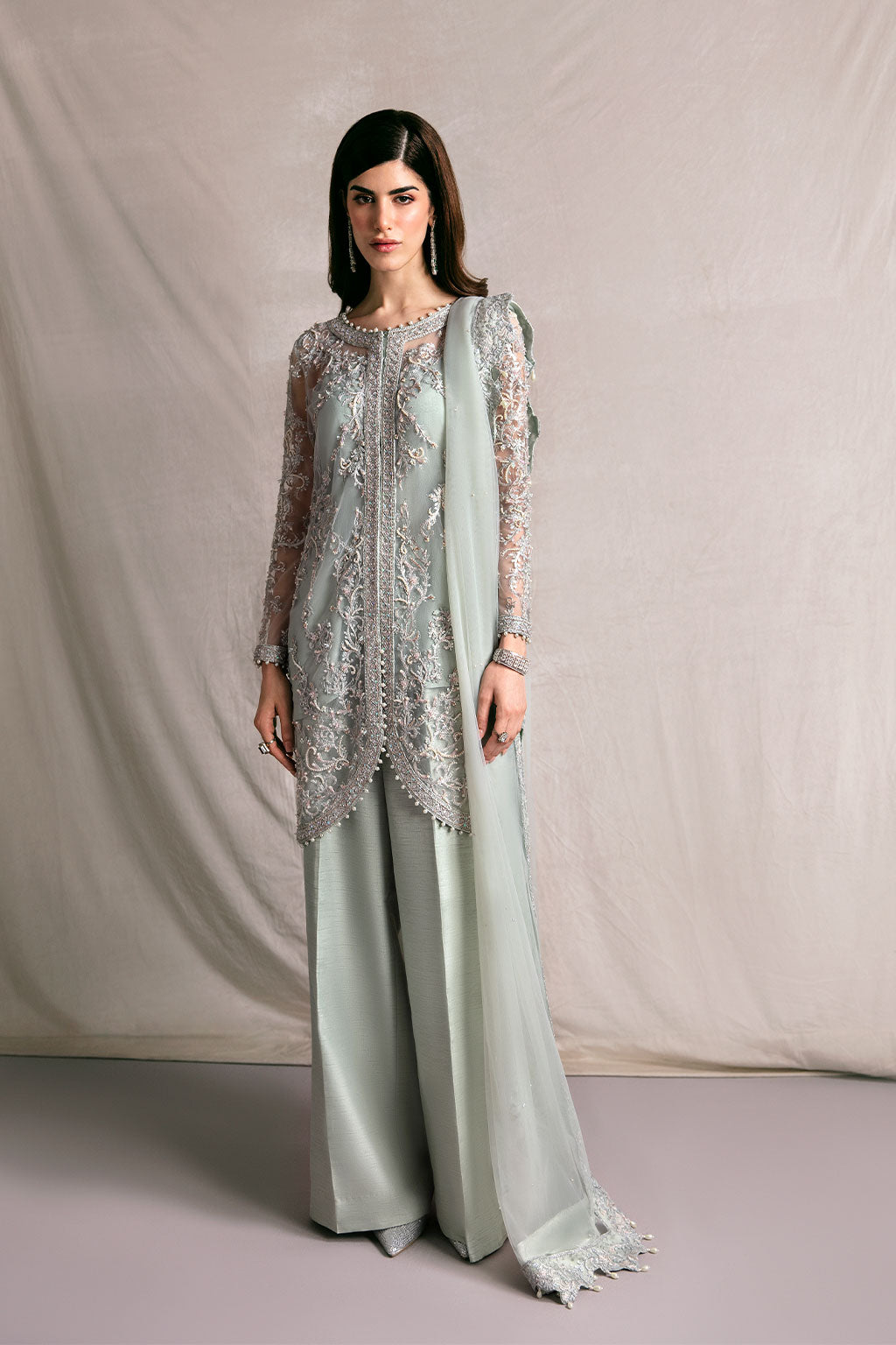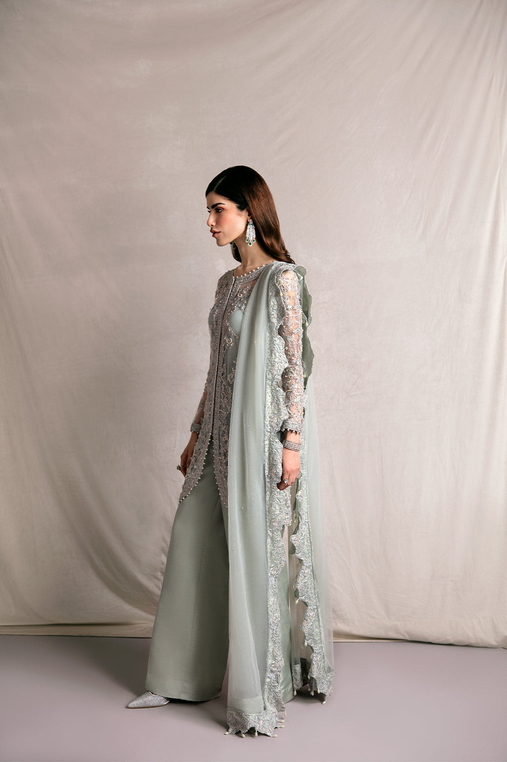 Description: Step into the spotlight and make a lasting impression as you drape yourself in the ethereal charm of the pistachio ensemble. The dazzling pistachio net jacket boasts intricate detailing of Swarovski, crystals and pearls, turning the jacket into a work of art. Paired along are elegant raw silk bell bottoms which lend a modern twist and add a sense of effortless grace. While the net dupatta with scalloped multi-head embroidered borders lifts the outfit to new heights.
