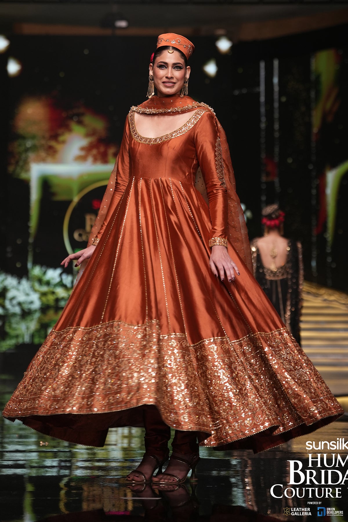 Radiating warmth and regal charm, this burnt orange peshwas paired with a classic churidar brings a breathtaking blend of tradition and vibrance to the forefront. The silhouette is beautifully adorned with golden block printing, further elevated with intricate hand embellishments that create luminous, eye-catching detail. Completing the look is an airy organza dupatta, finished with a delicate sequin spray and traditional kiran lace, adding the perfect touch of festive elegance.