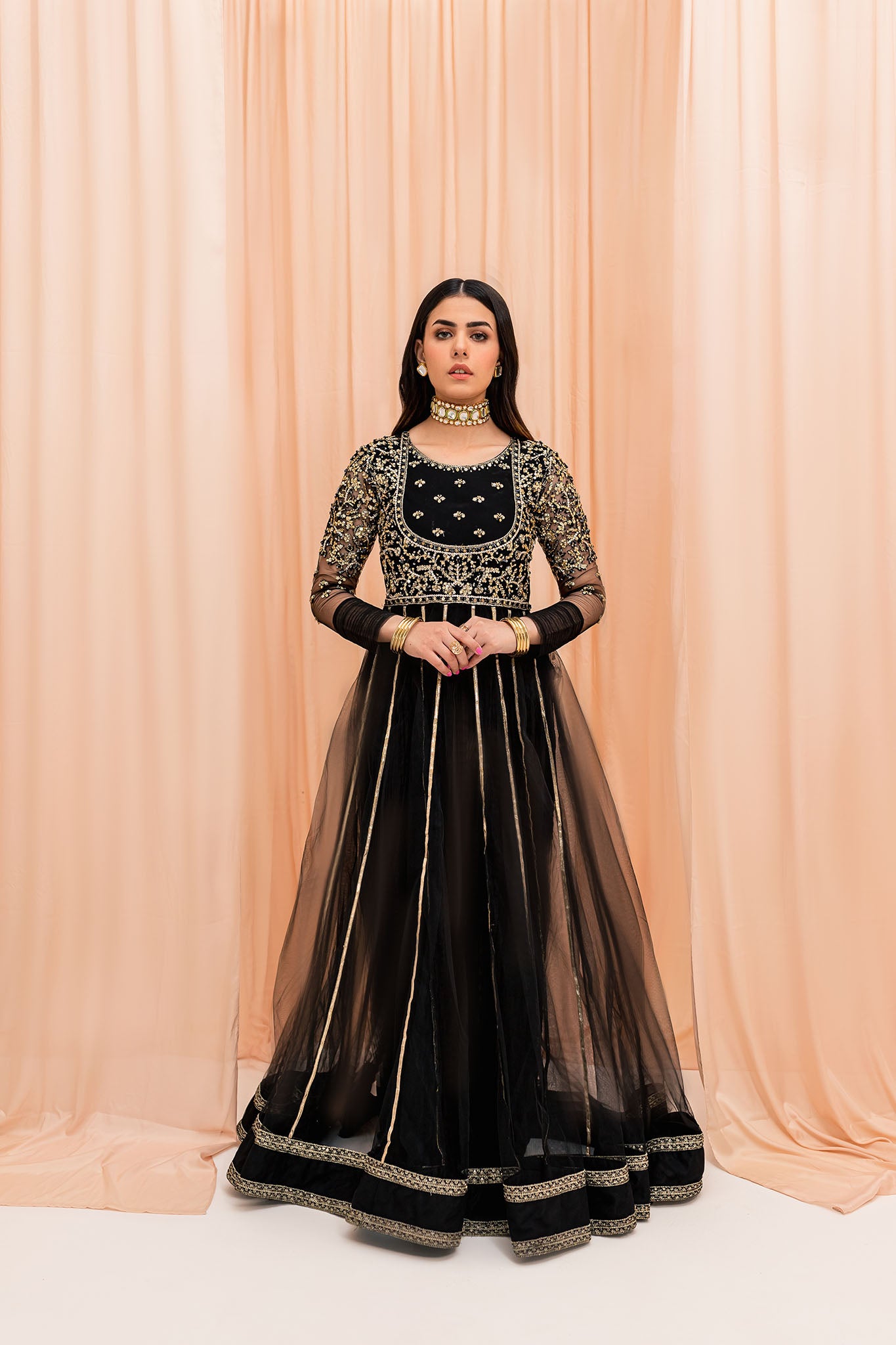 Description: A glamoured net paneled black pishwas along with crushed lehnga