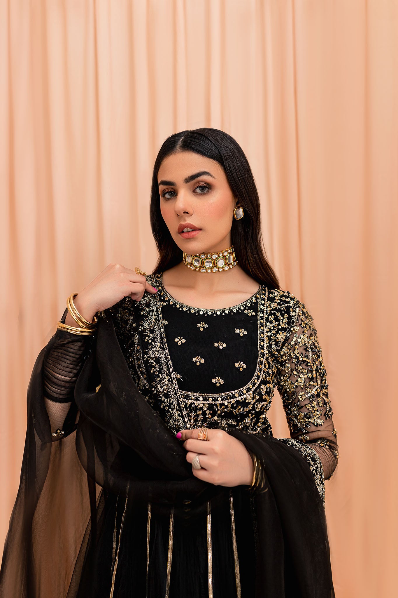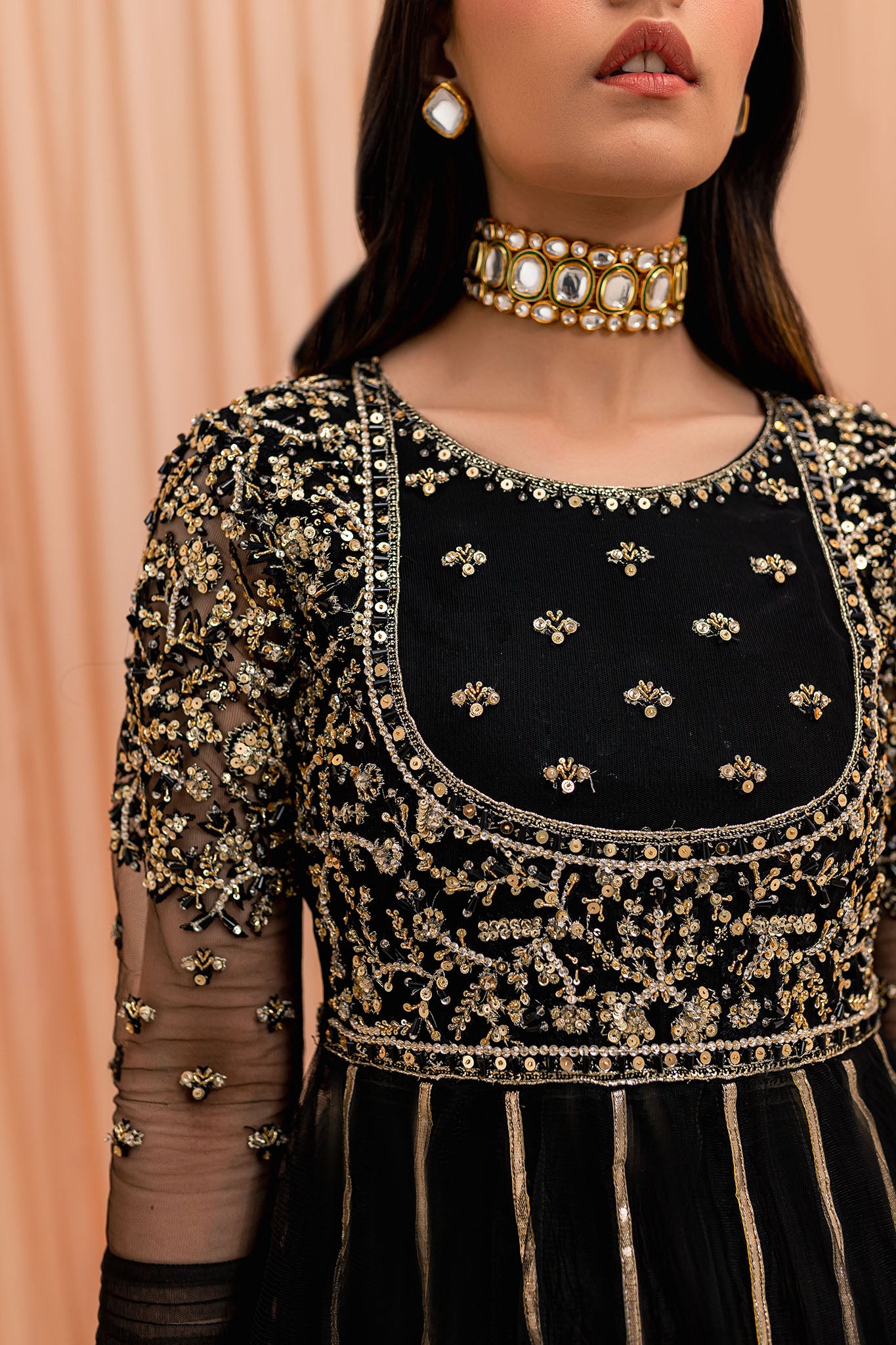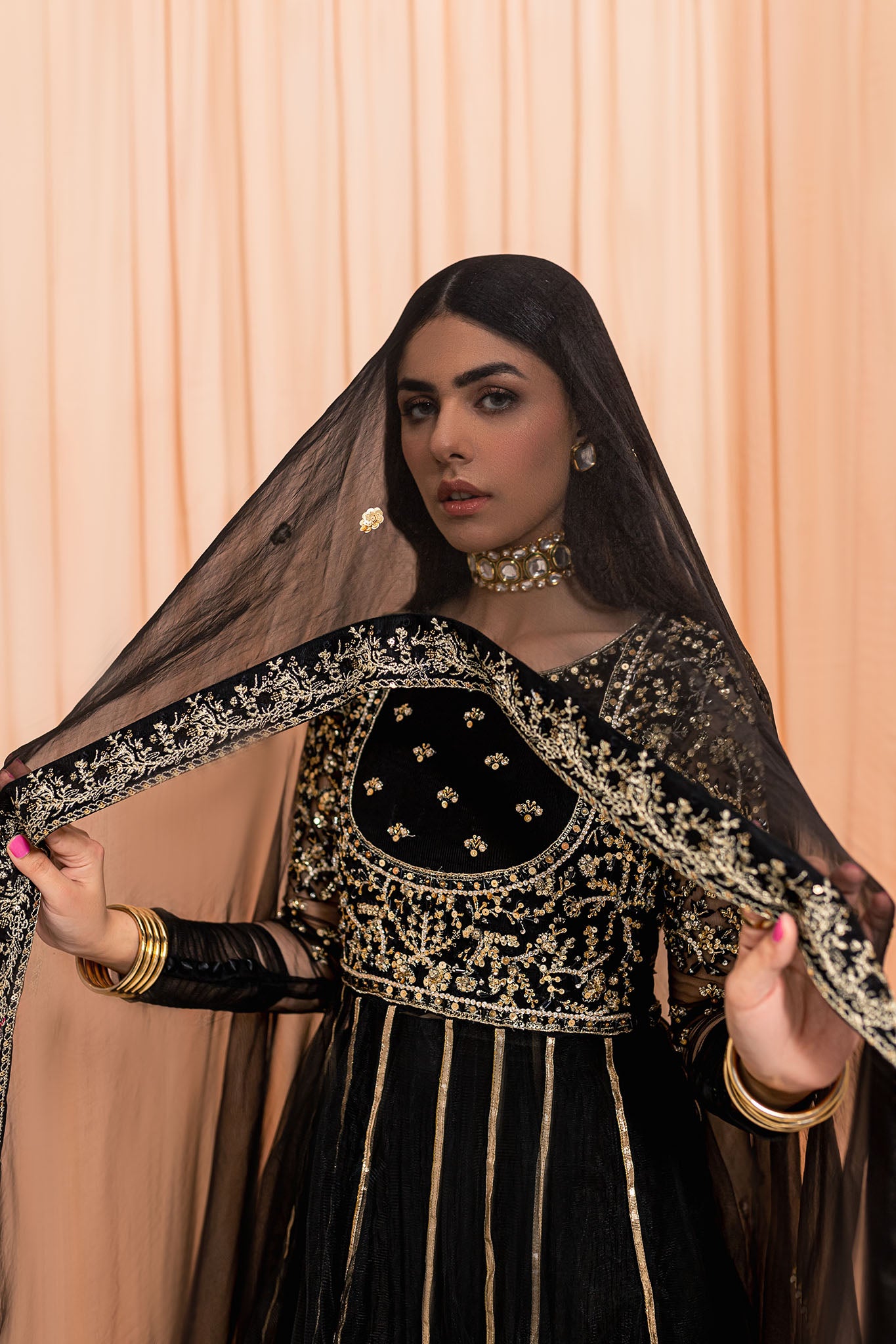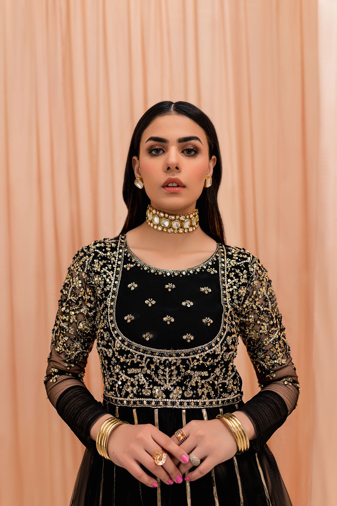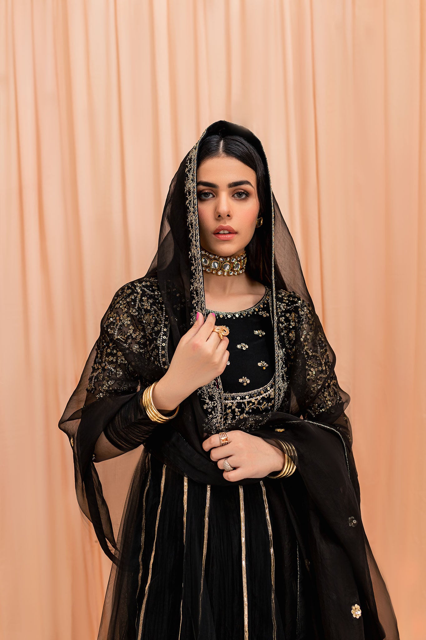 Kalidar pishwas with an all-over gotta lining heavily ornamented with miraculous crystals, moti ,cutdana nakshi, dabka, sequin detailing, and gotta finishing in work further glorified with glitzy threads in a hue of gold on black canvas on the bodice combined with pleated sleeves. Worn with a graceful dupatta embroidered on all-edges paired up with crushed Lehnga.