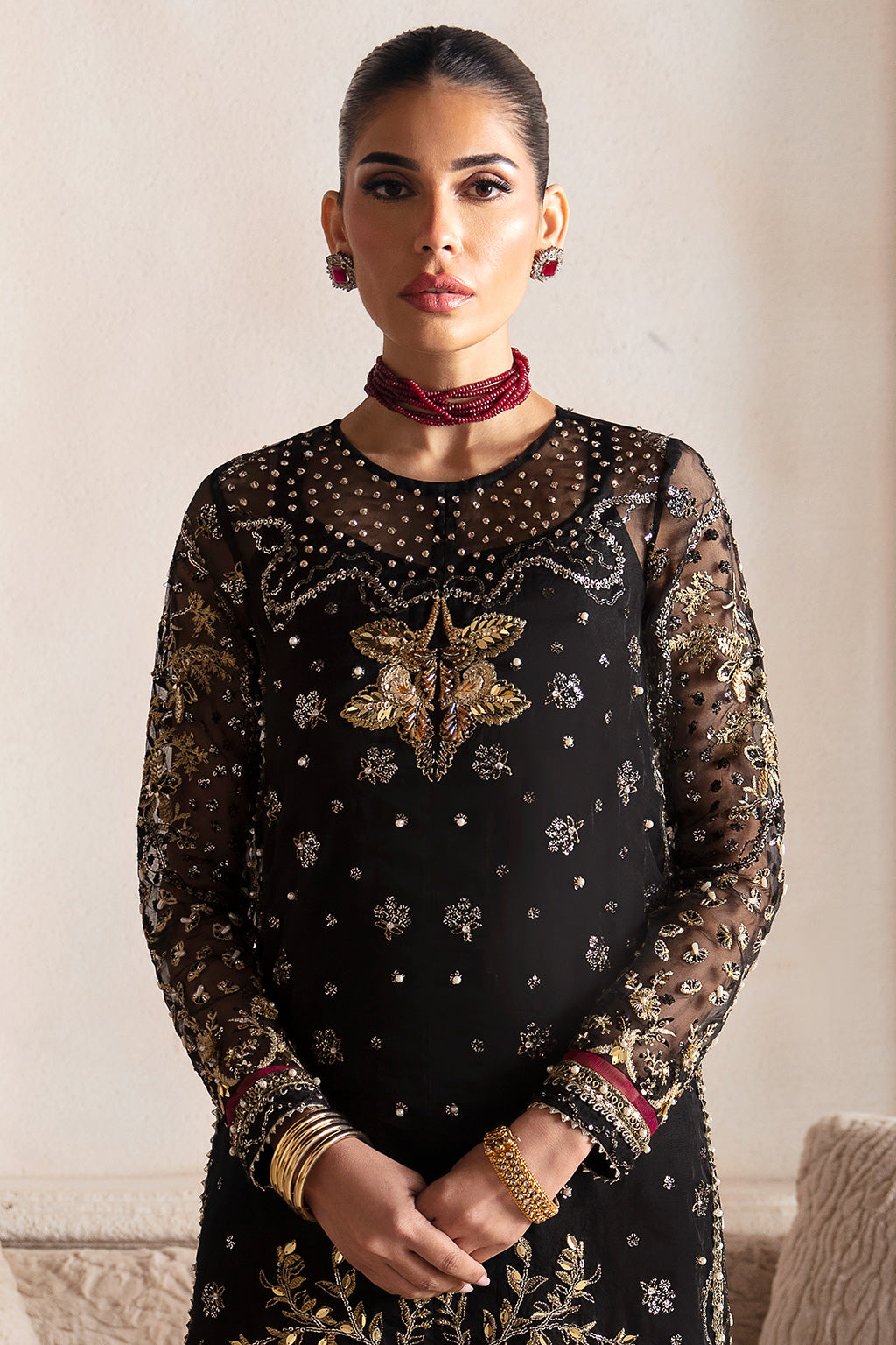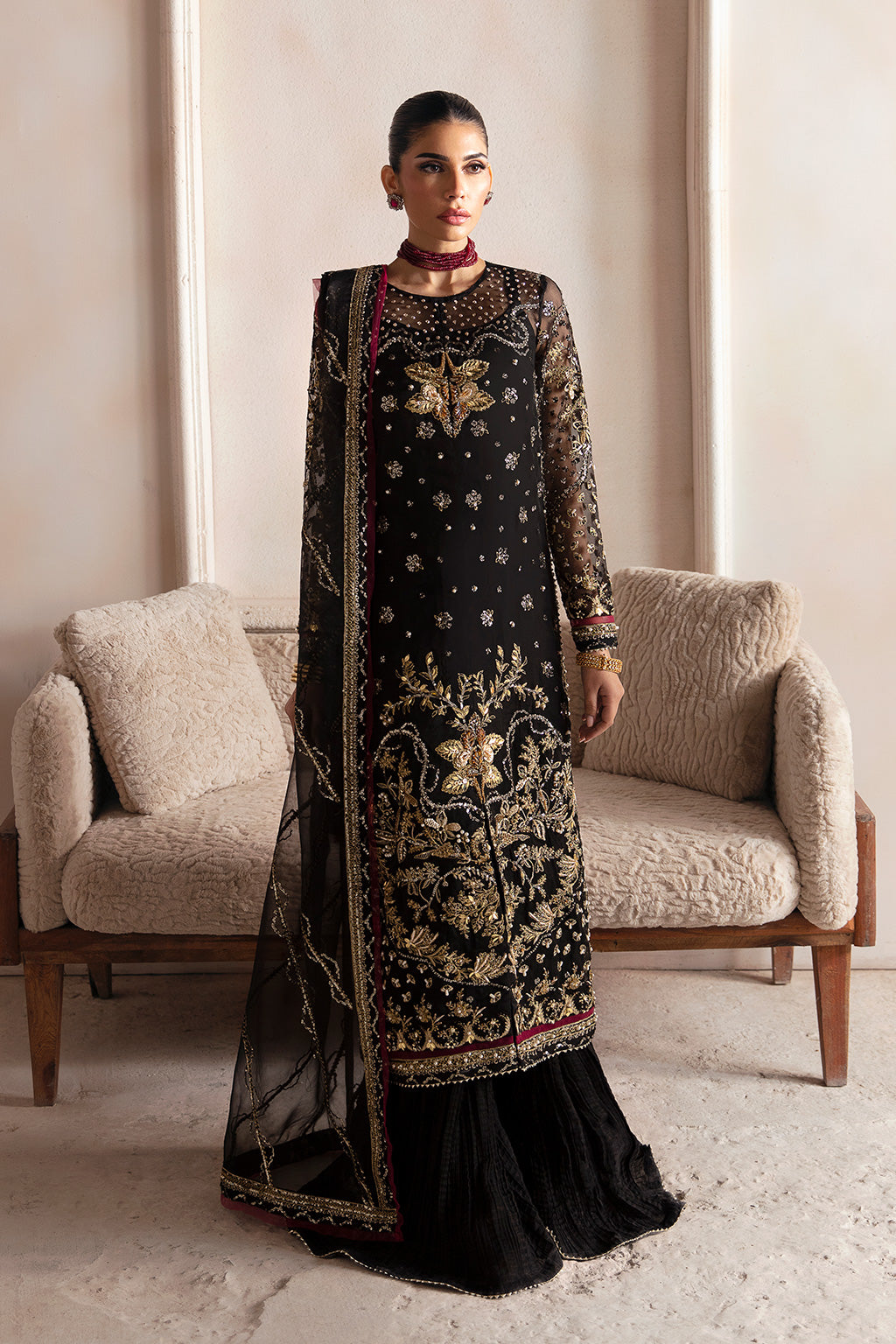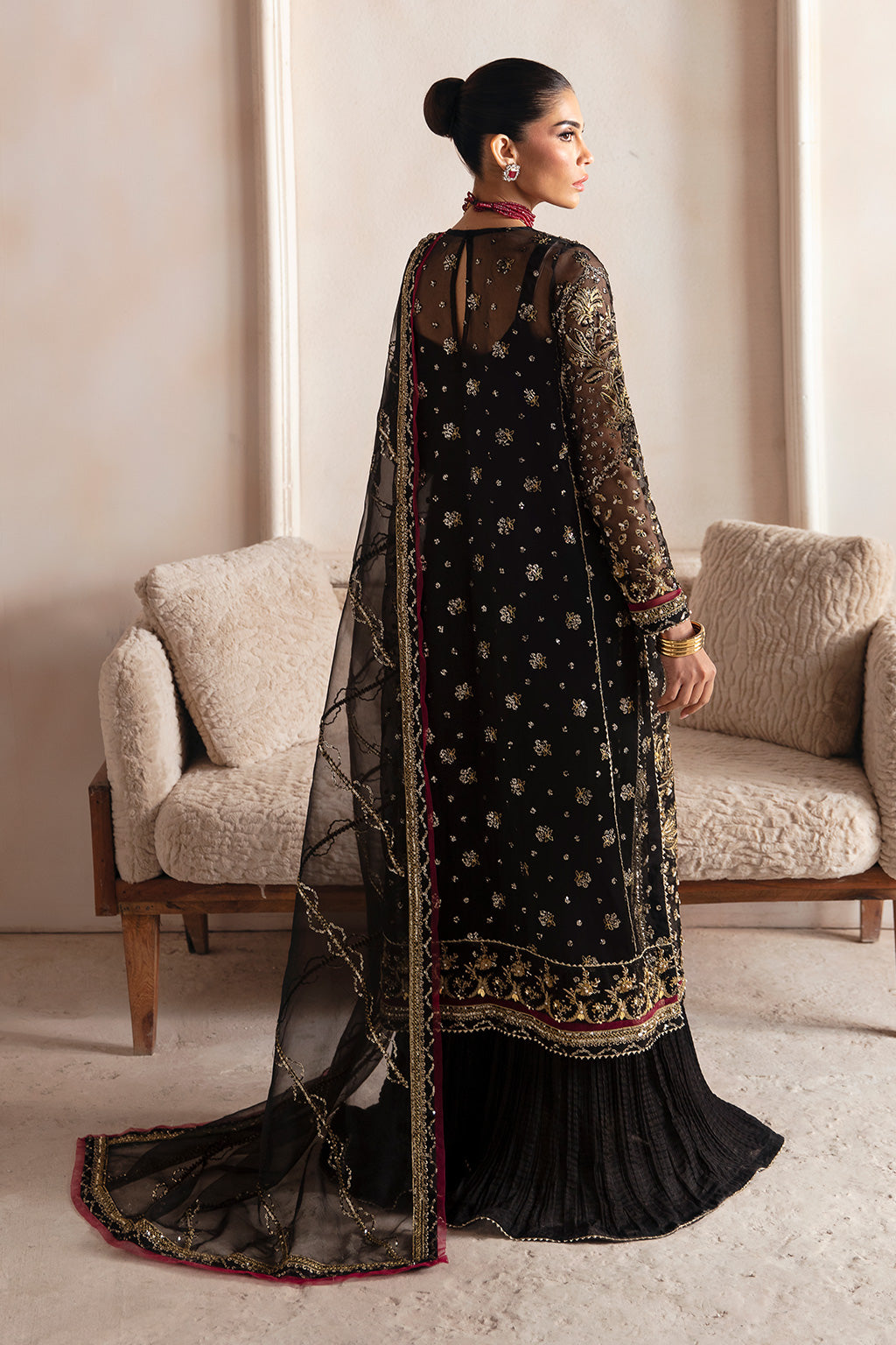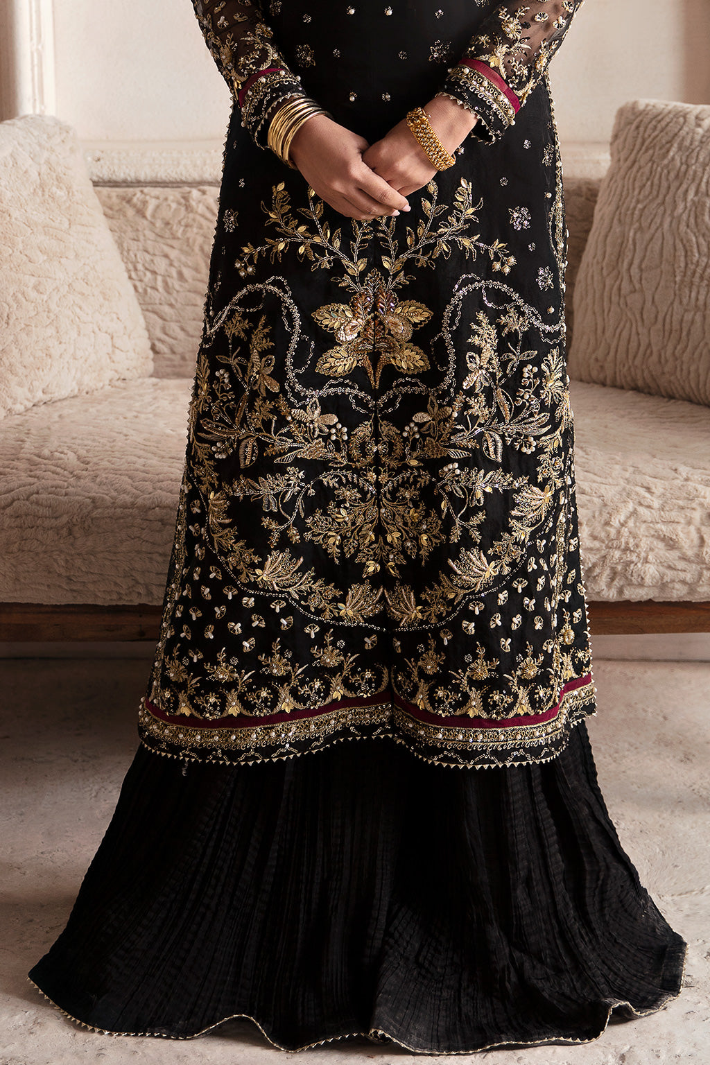 Celestial in its elegance, the stunning black organza ensemble steals the spotlight with its lavish antique gold hand embellishments that gracefully envelop the shirt front, back and sleeves, accentuated by gotta lace finishing and enriched with opulent burgundy accents.