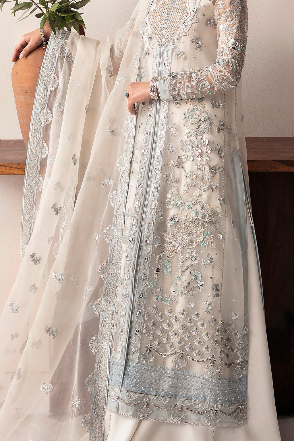 Get ready to sparkle in our dreamy off-white organza jacket, an ethereal creation that is sure to captivate hearts. This luminous ensemble is bejewelled with 3D silver hand embellishments and hints of ice blue crystals, adding a refreshing touch to this enchanting ensemble.