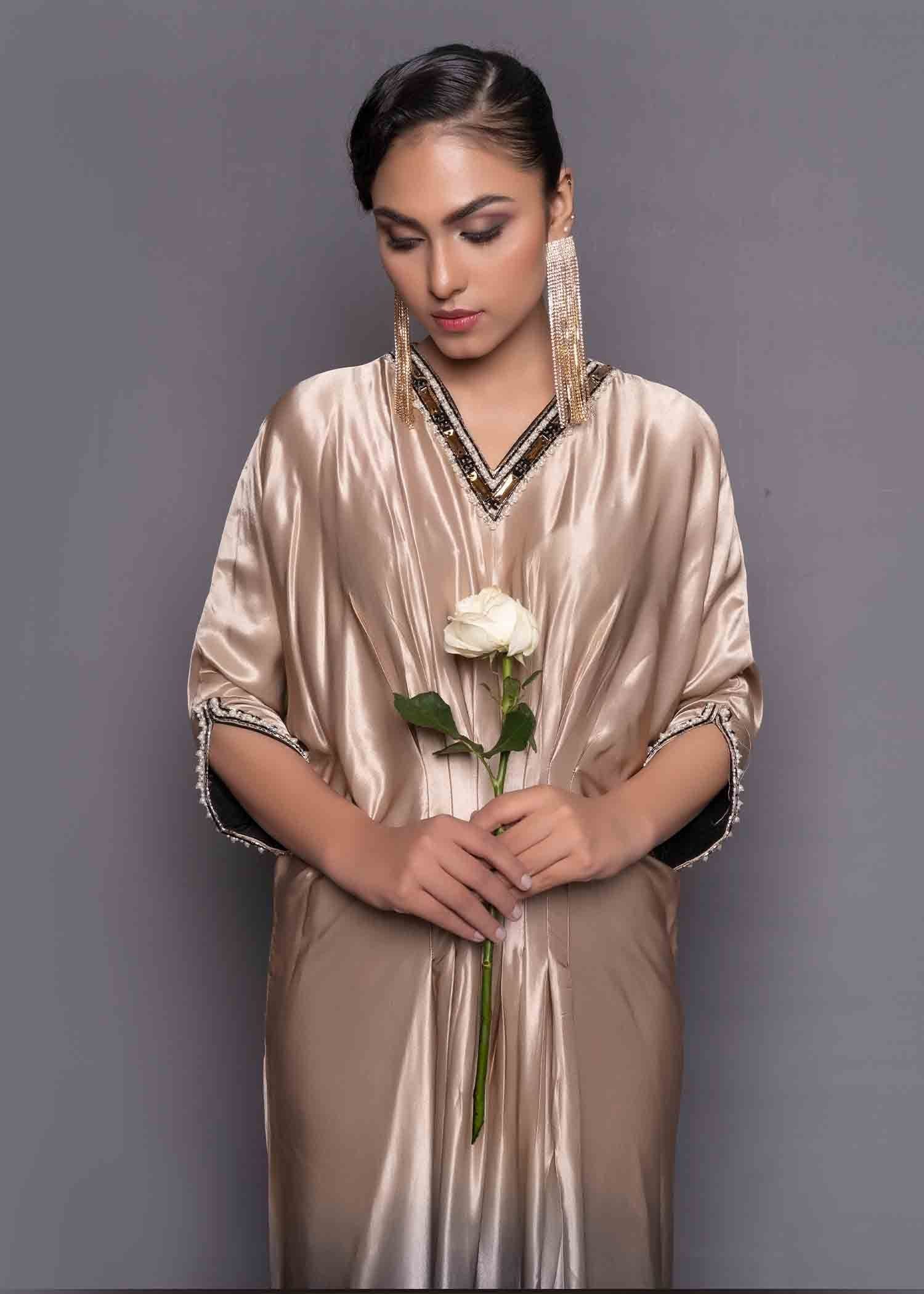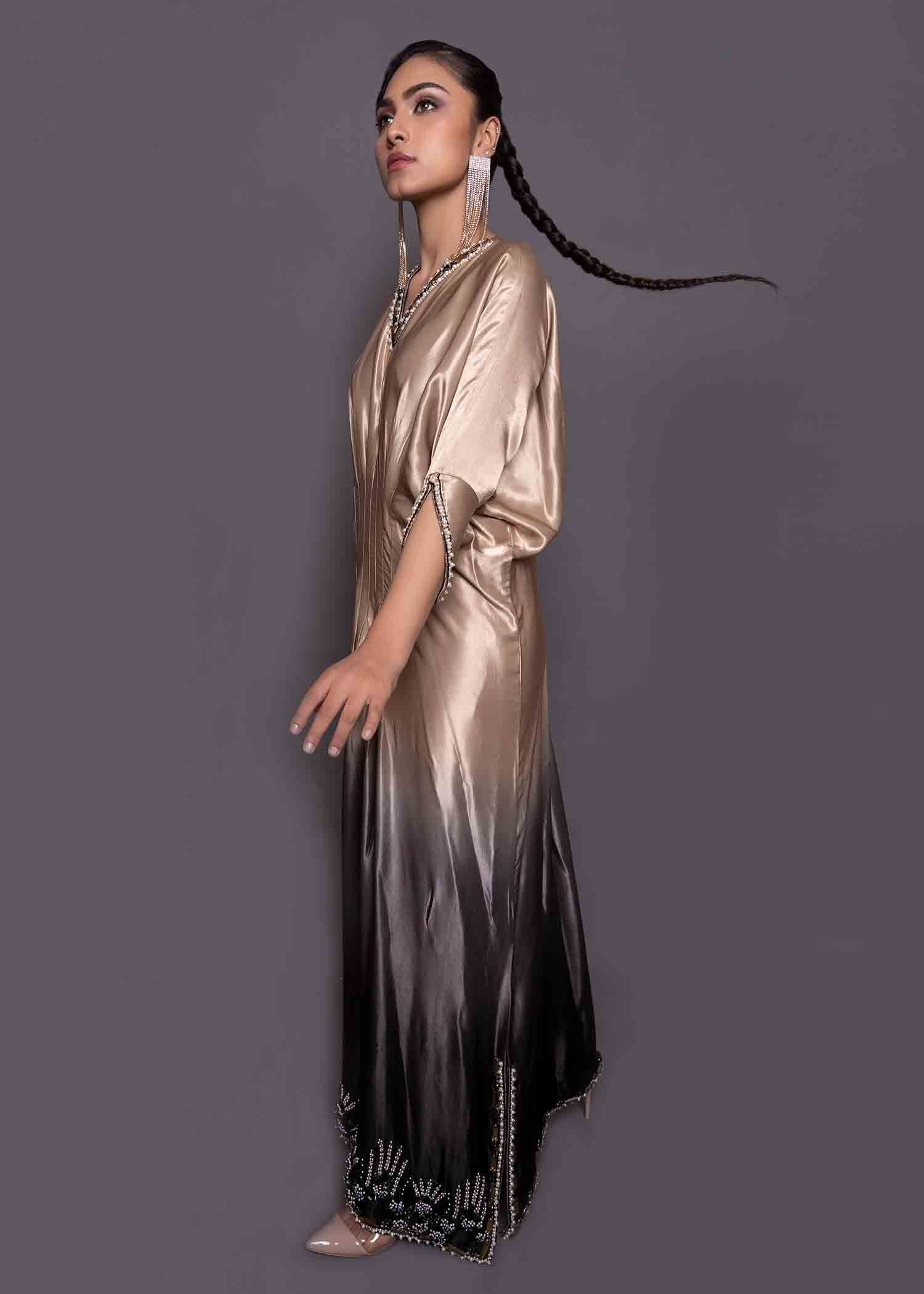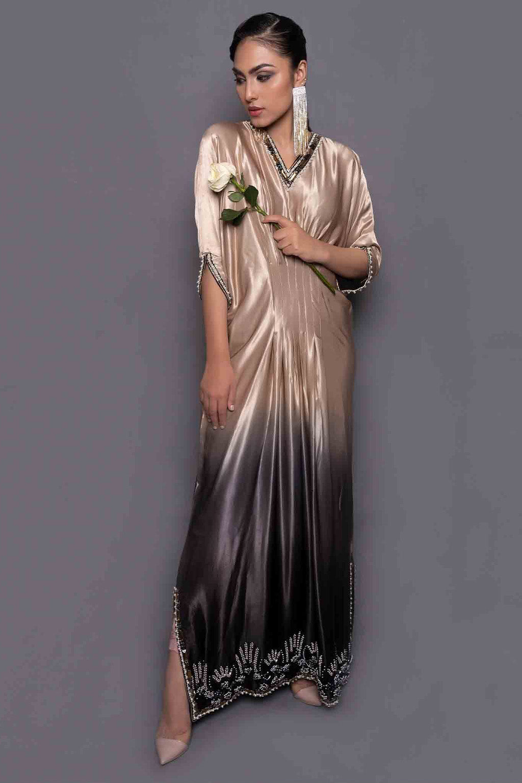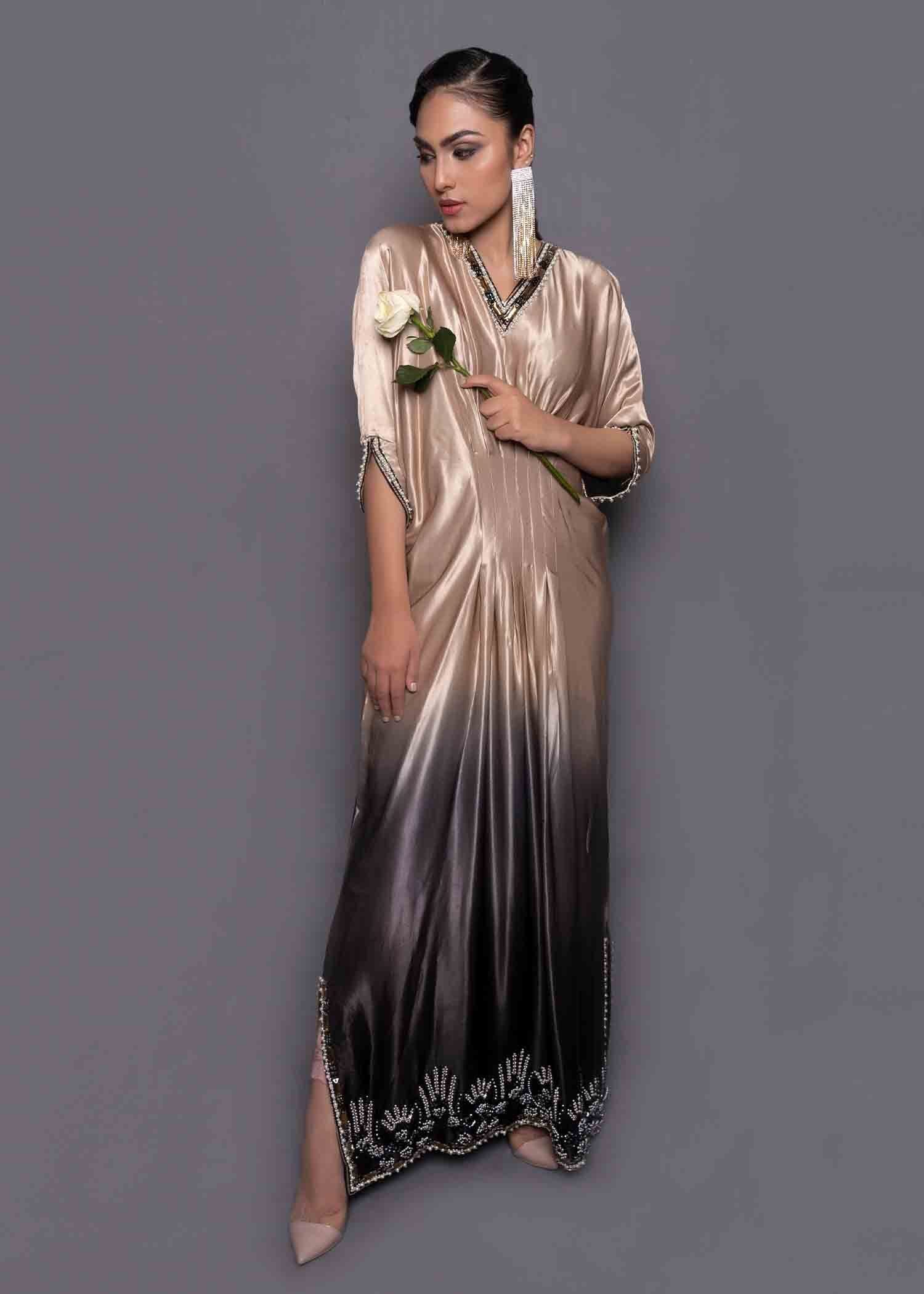Description: KAFTAAN is made in pure silk, it is dyed gradient and is totally hand embellished. Work is on sleeves bottom and neckline