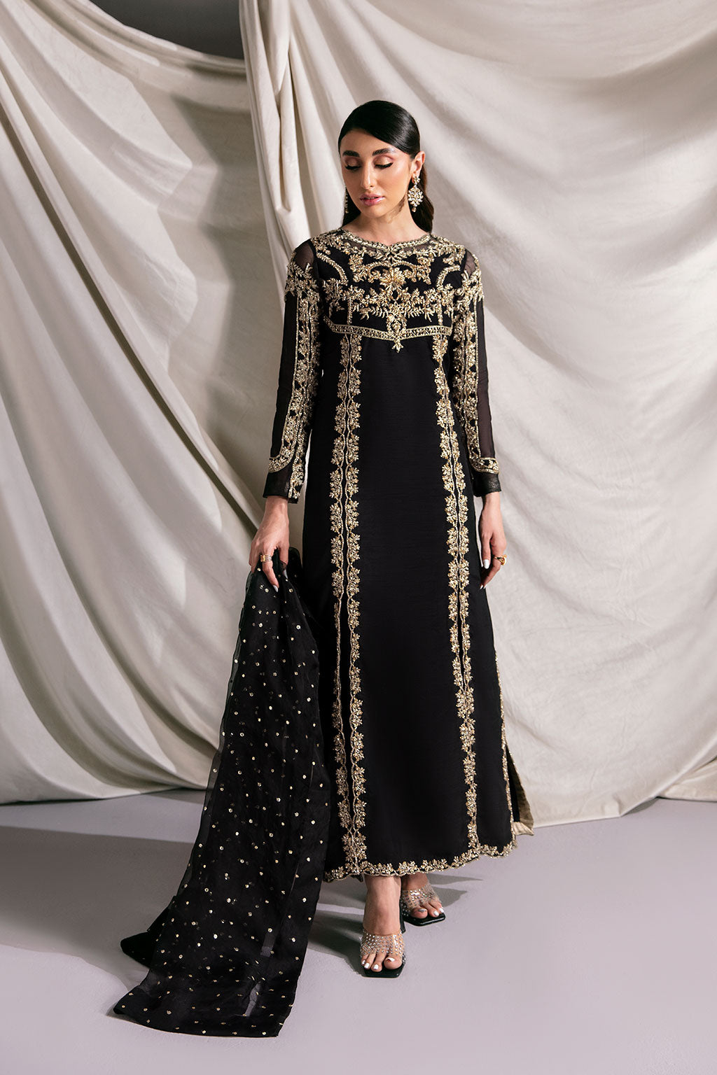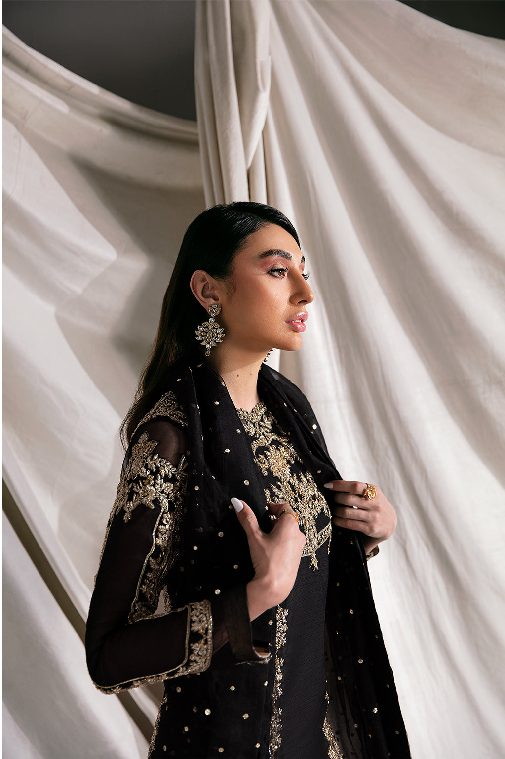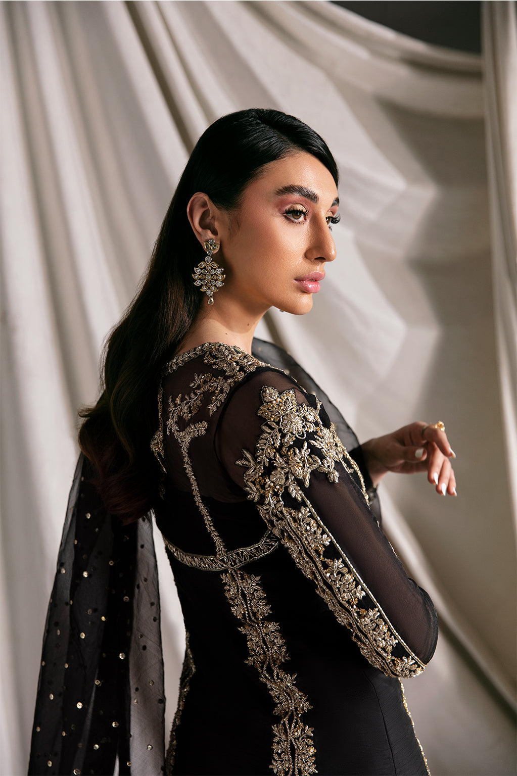 Description: Elevate your aura and captivate hearts as you don this elegant black silk shirt. Indulge in the timeless allure of a black panelled silk shirt, meticulously adorned with heavy silver and golden adda work on the shirt and sleeves, creating an intricate tapestry of opulence and refinement. Paired effortlessly with sleek silk pants, this ensemble strikes the perfect balance between contemporary elegance and timeless charm. The organza dupatta with a captivating sequin spray adds a touch of celestial beauty to the overall look.