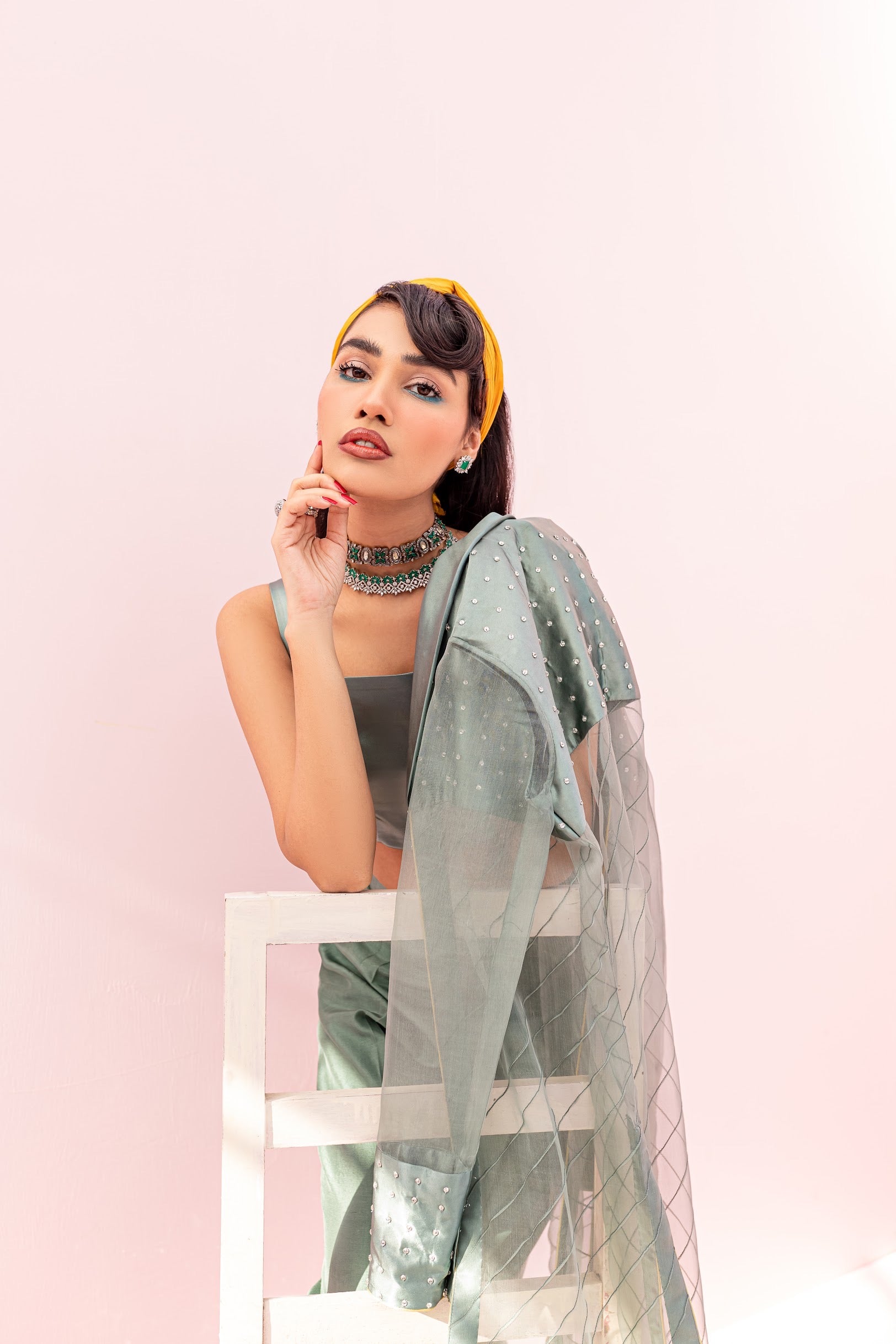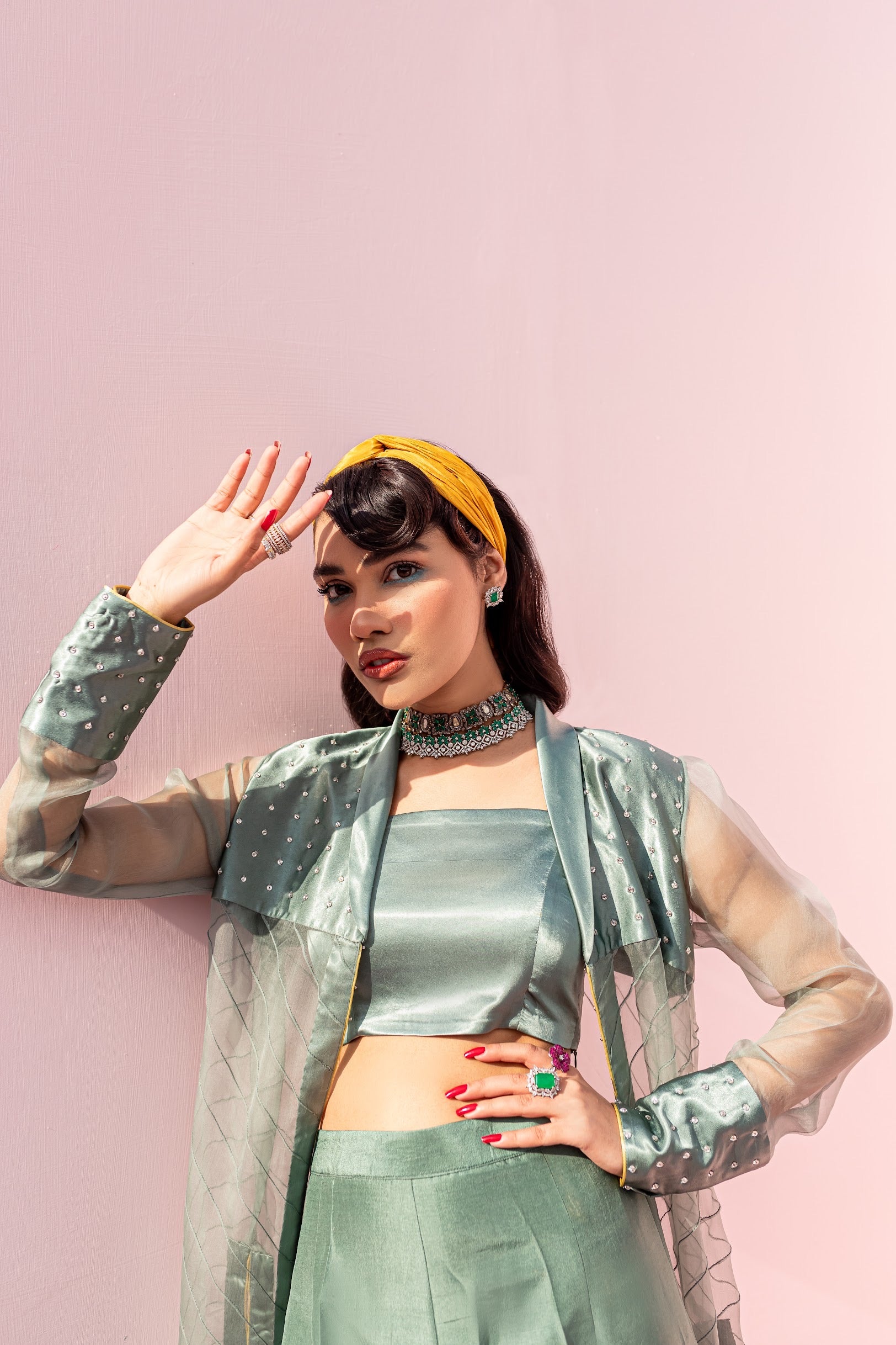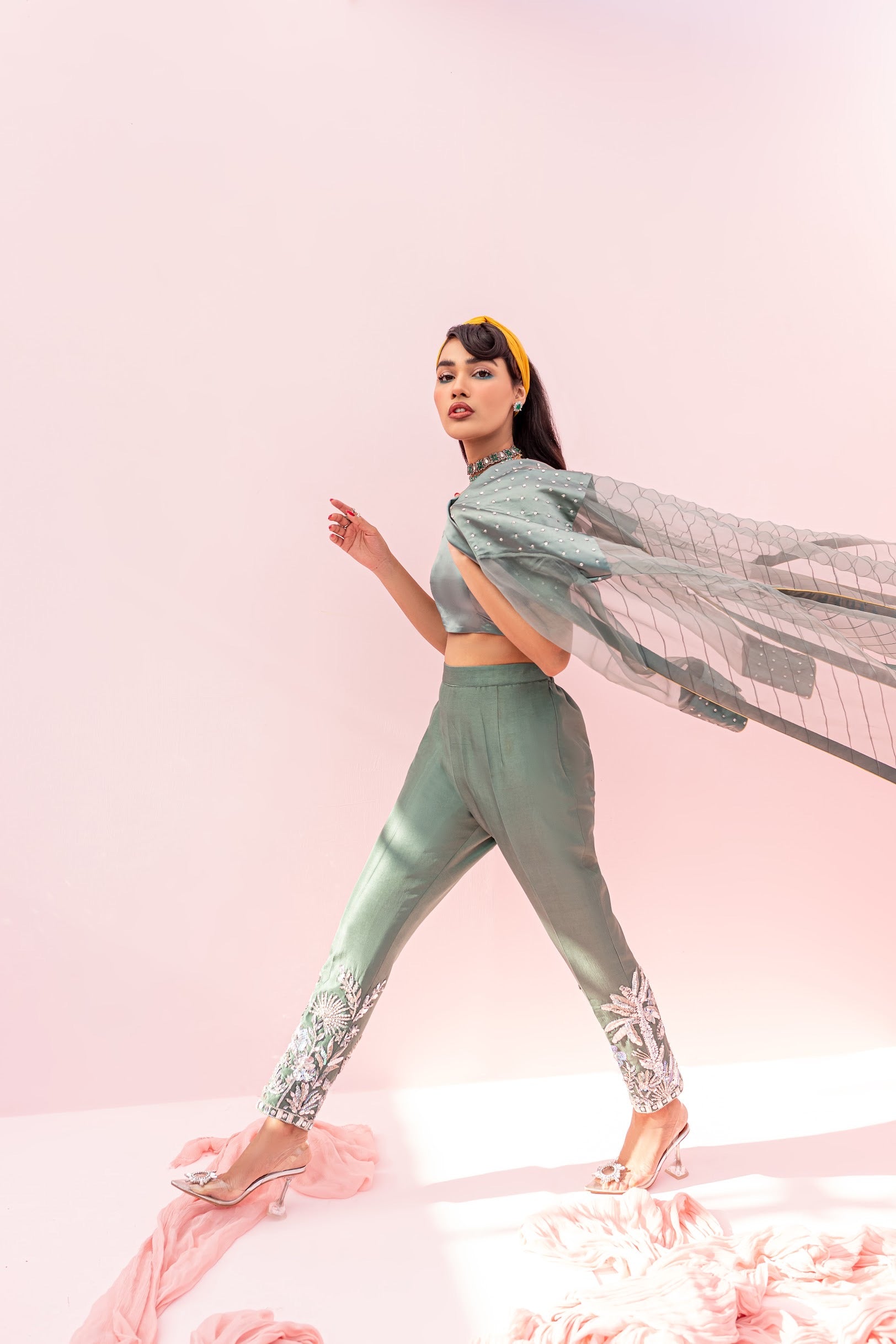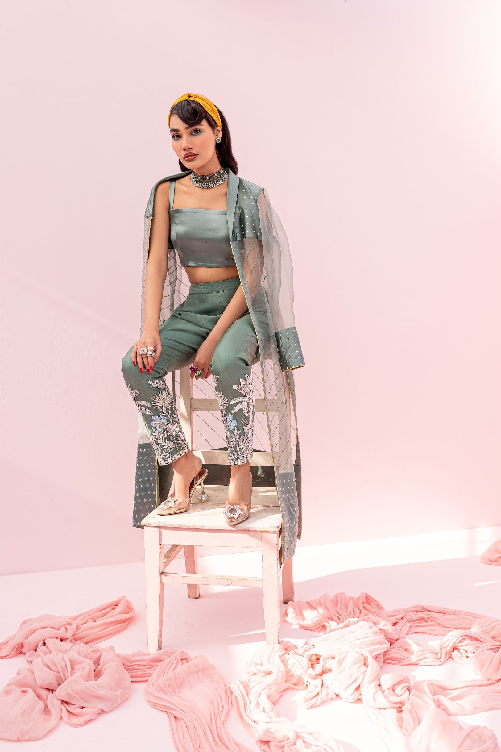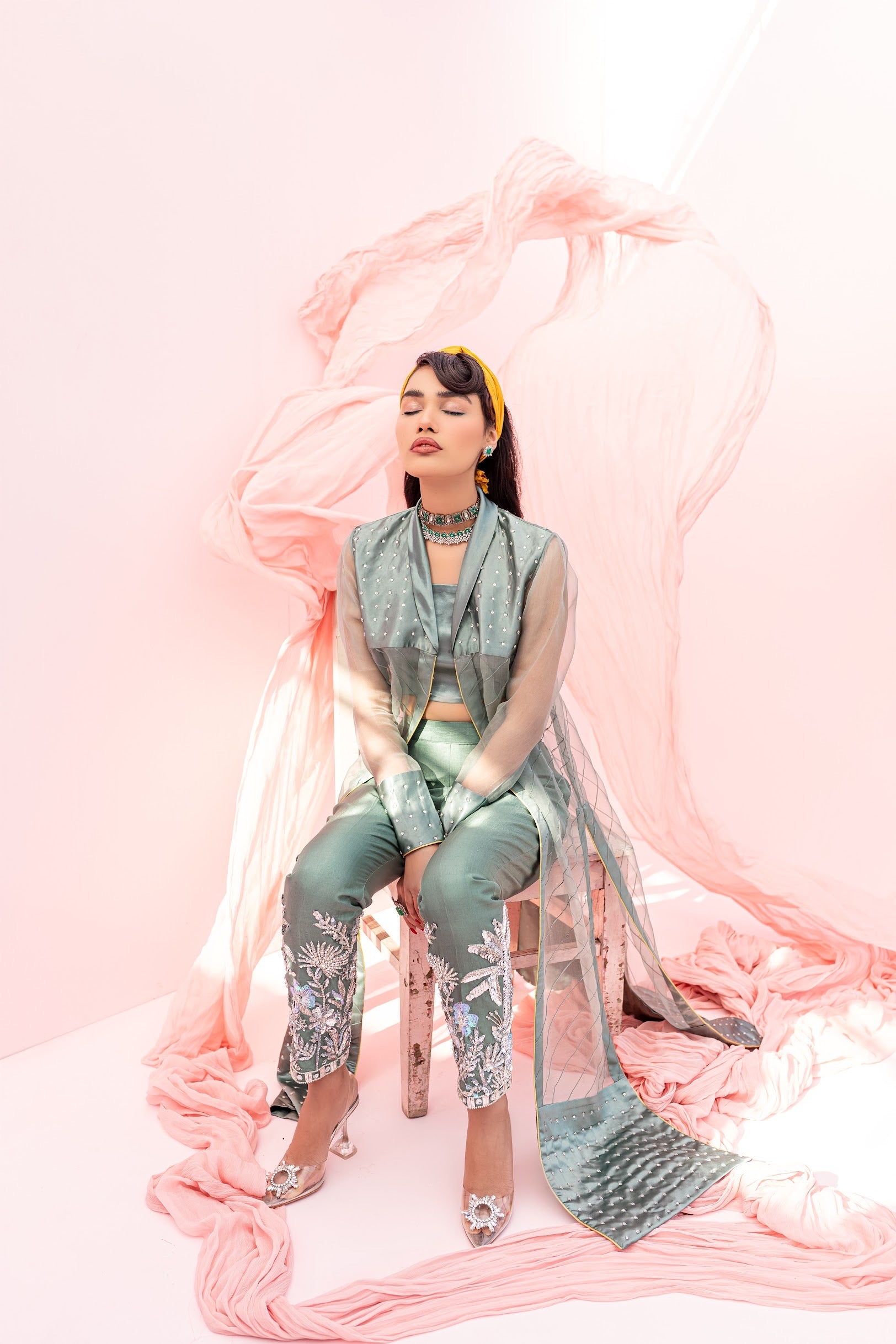 Description: Mint - Presenting an artistic symphony of blush shades reflecting a calm festive appeal. This long jacket adorned with sequins creates a finesse outlook with embroidered trousers