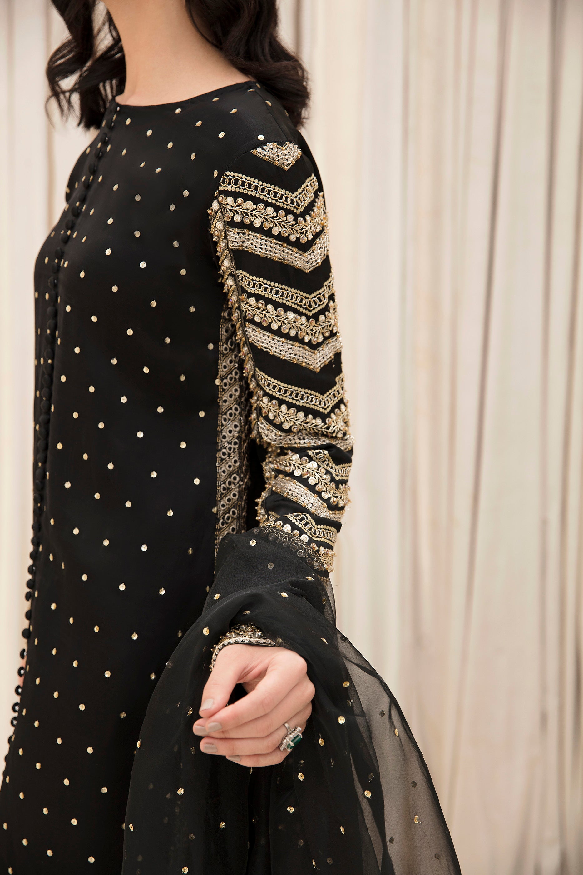 This breathtaking black ankle-length silk shirt is embellished with intricate adda work of gold and silver on the sleeves, shirt front, and back along with gold sequins spray all over. It is paired with satin silk culotte pants and organza dupatta, making it a perfect choice for all your festivities!