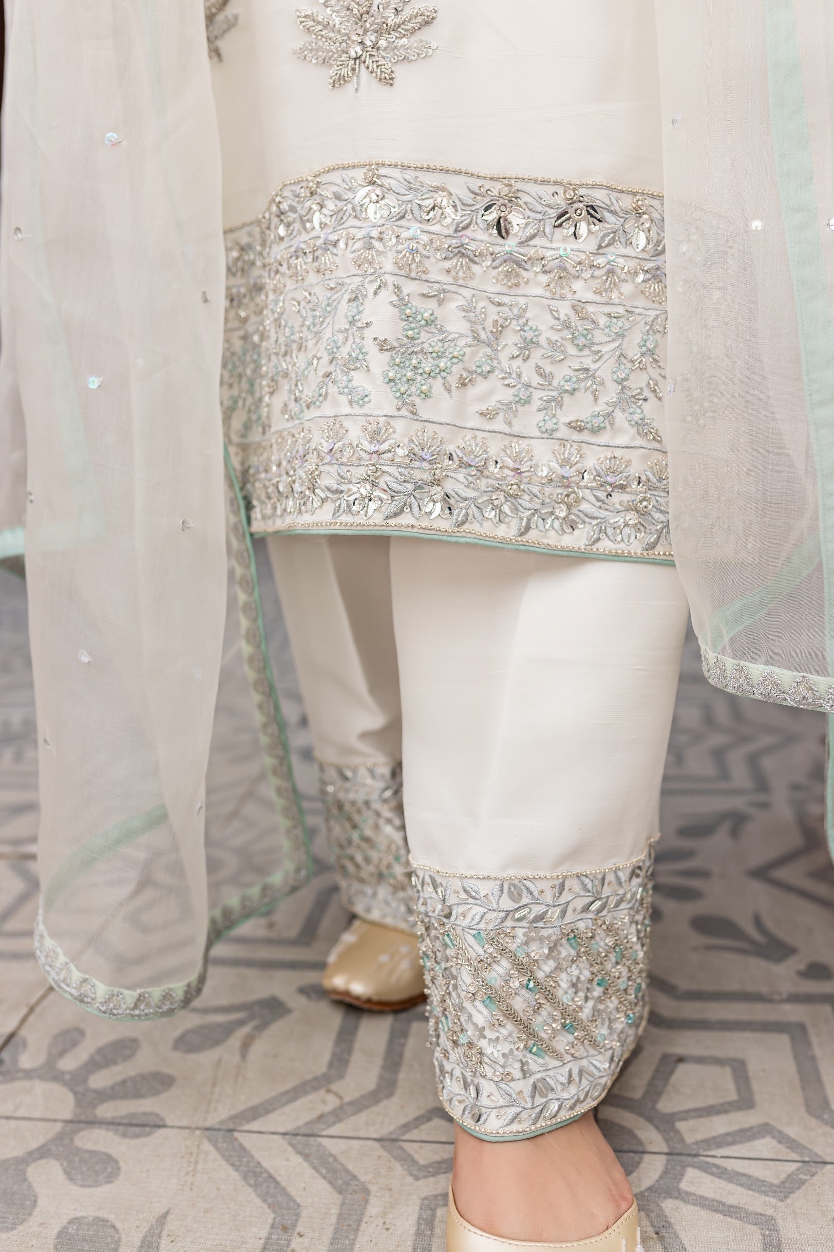 Description: Made in pure raw silk with intricate hand embellishments would add an extra joy to your festivity. The use of dabka, naqshi, chain, cut dana with the tint of aqua swarovski and crystals on the shirt and the pants.
