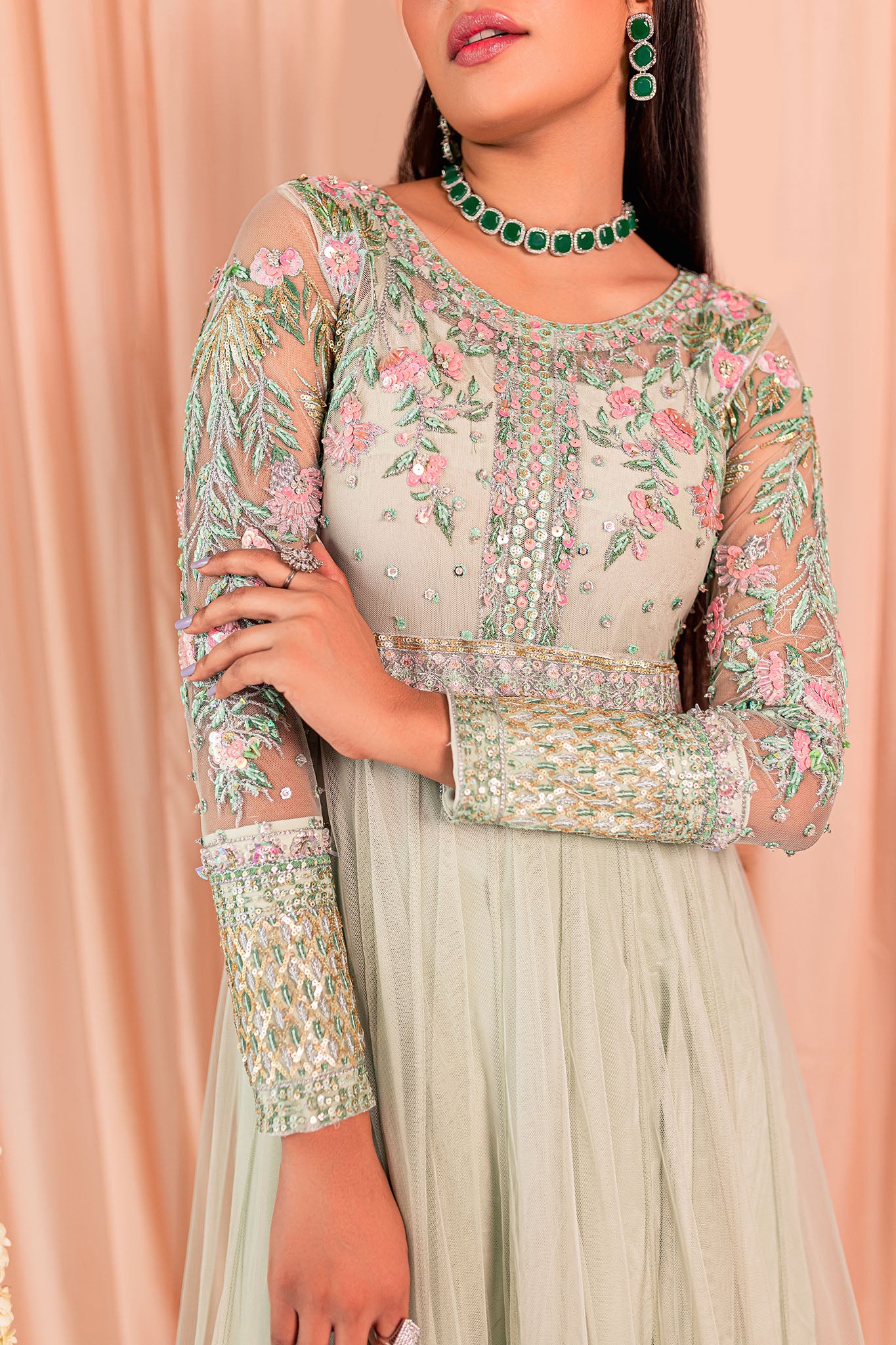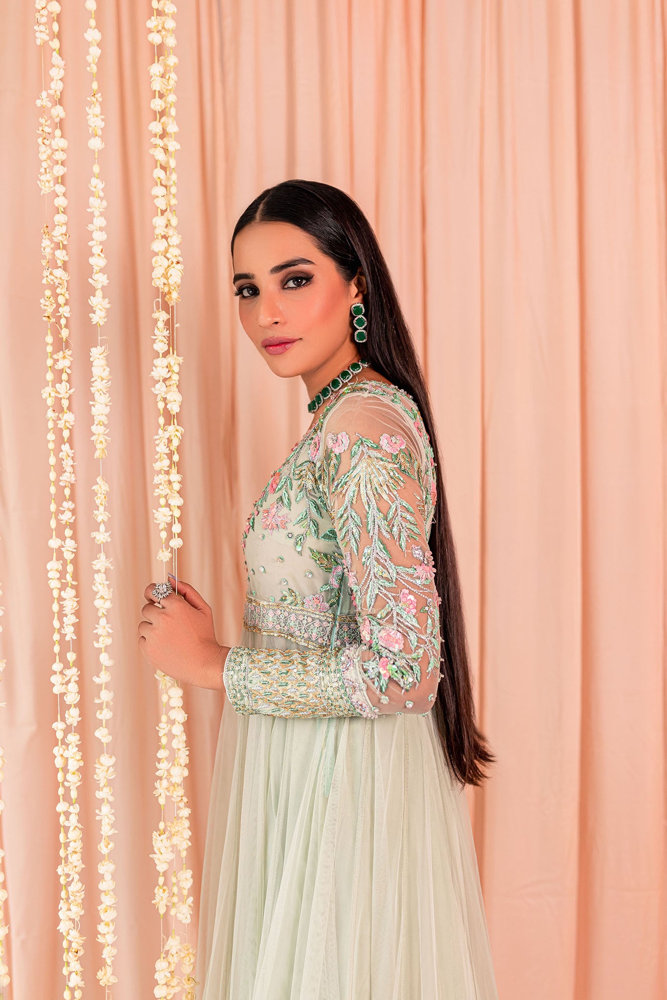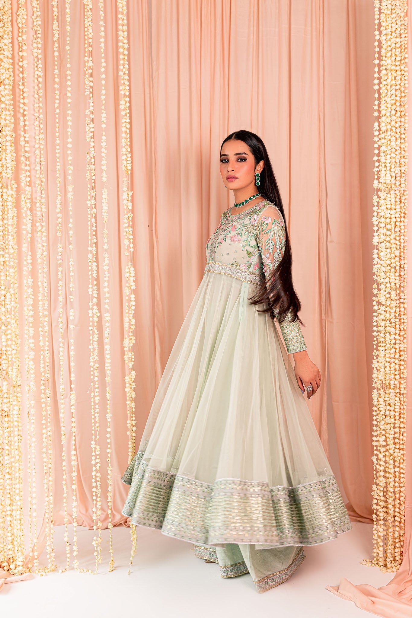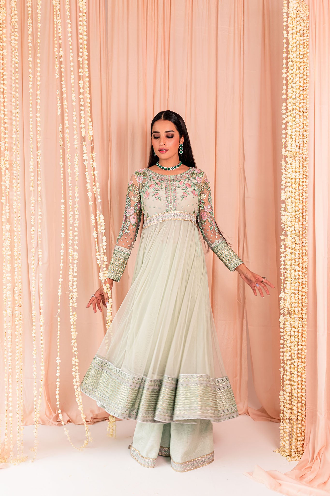 This Pistachio color pishwas is a long floor-touching dress made for twirling with a fitted hand embellished bodice.