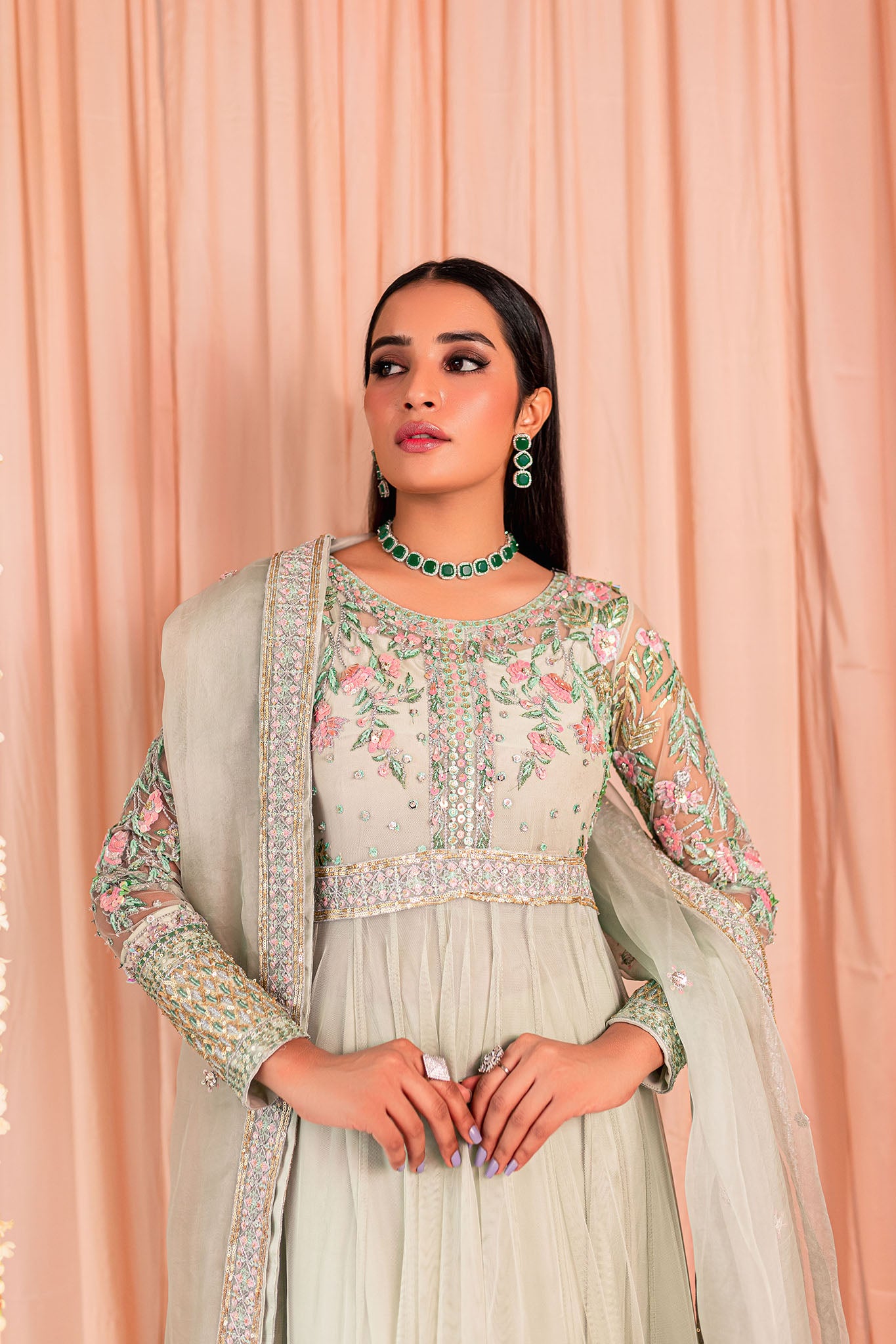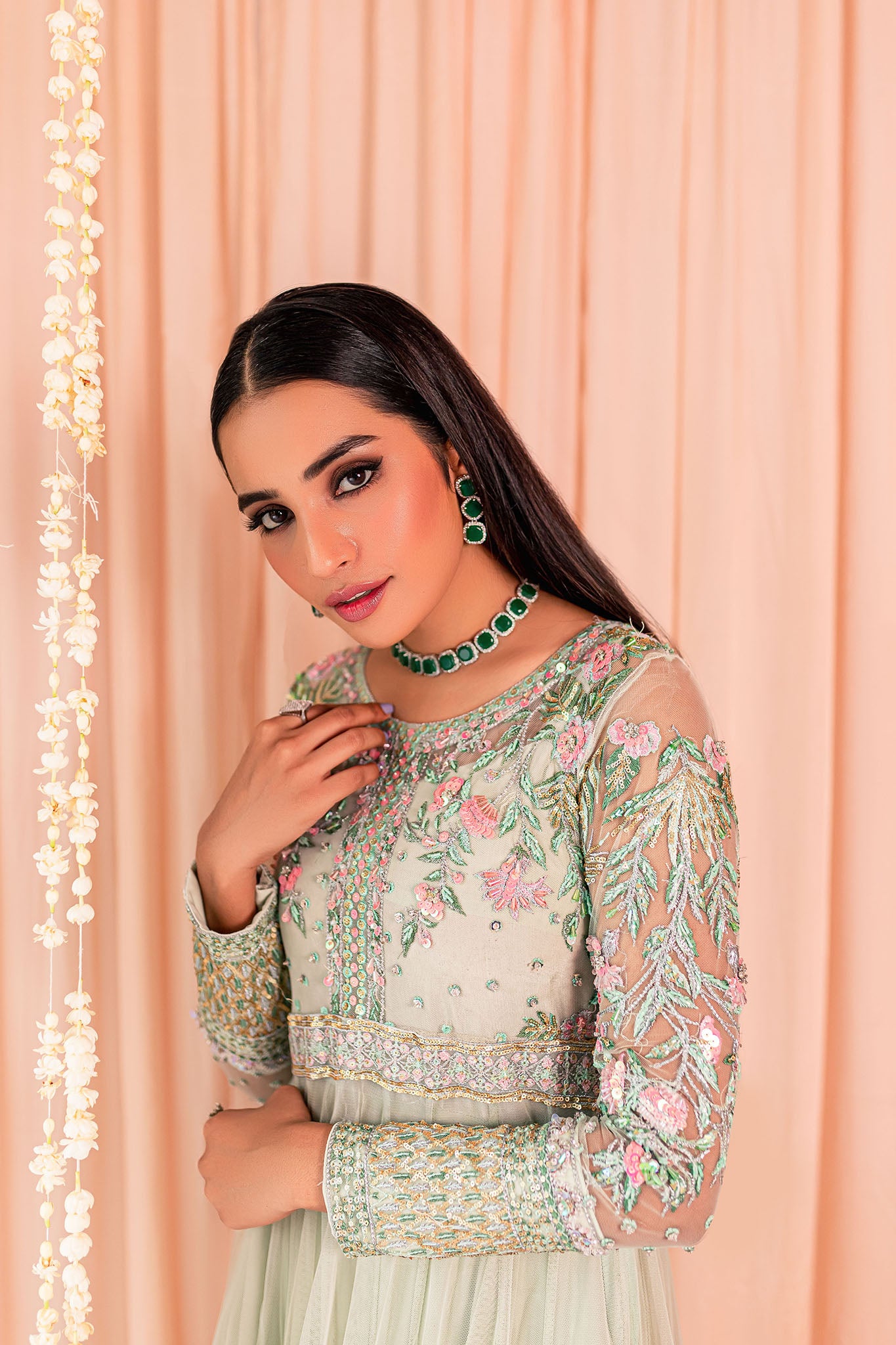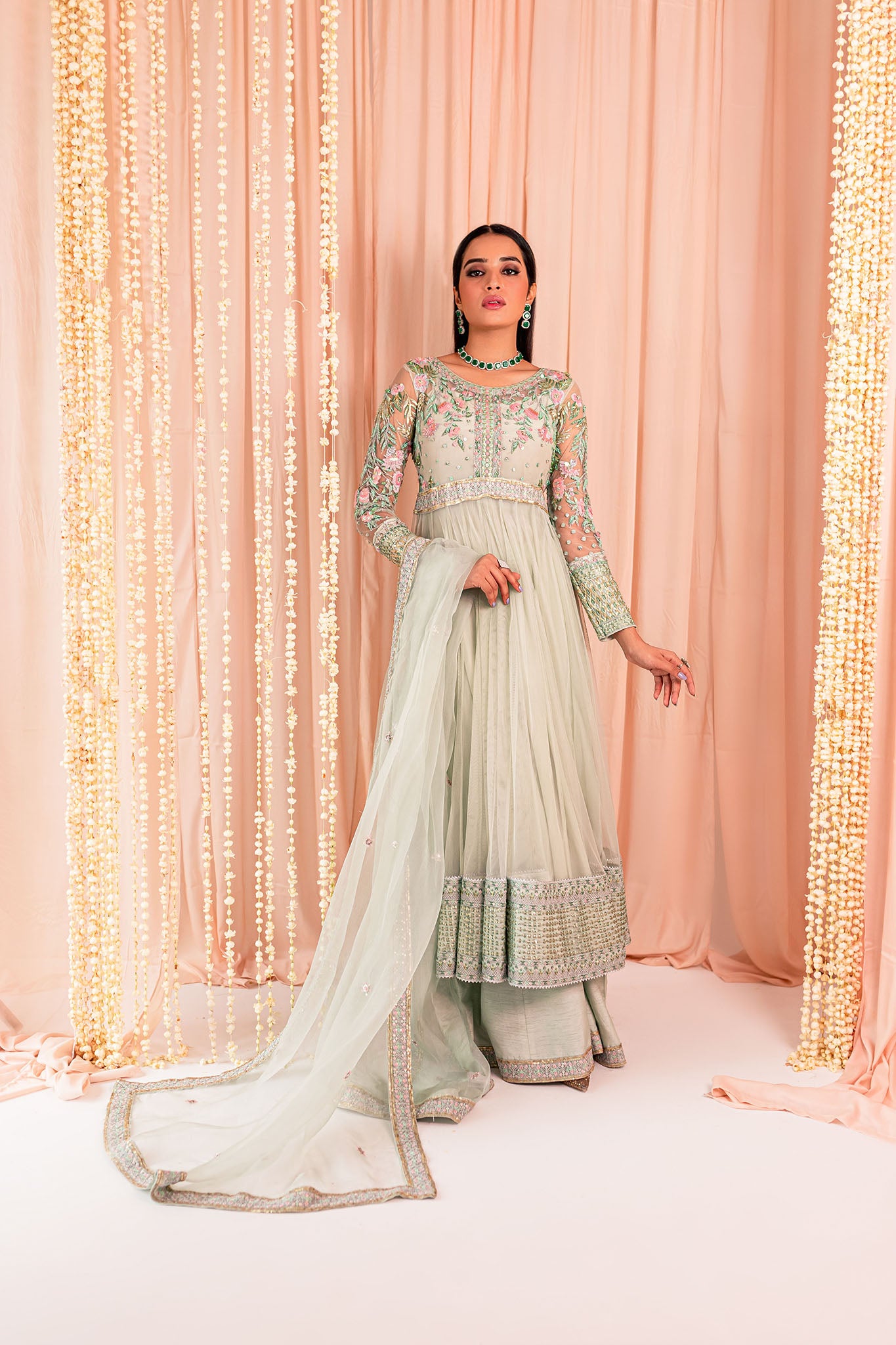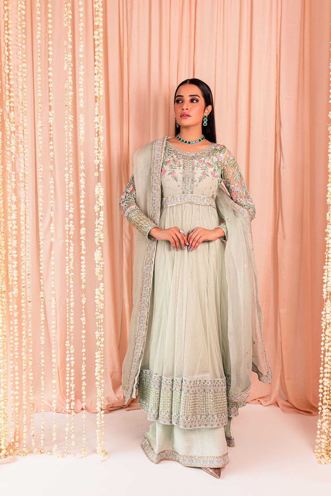 This Pistachio color pishwas is a long floor-touching dress made for twirling with a fitted hand embellished bodice.