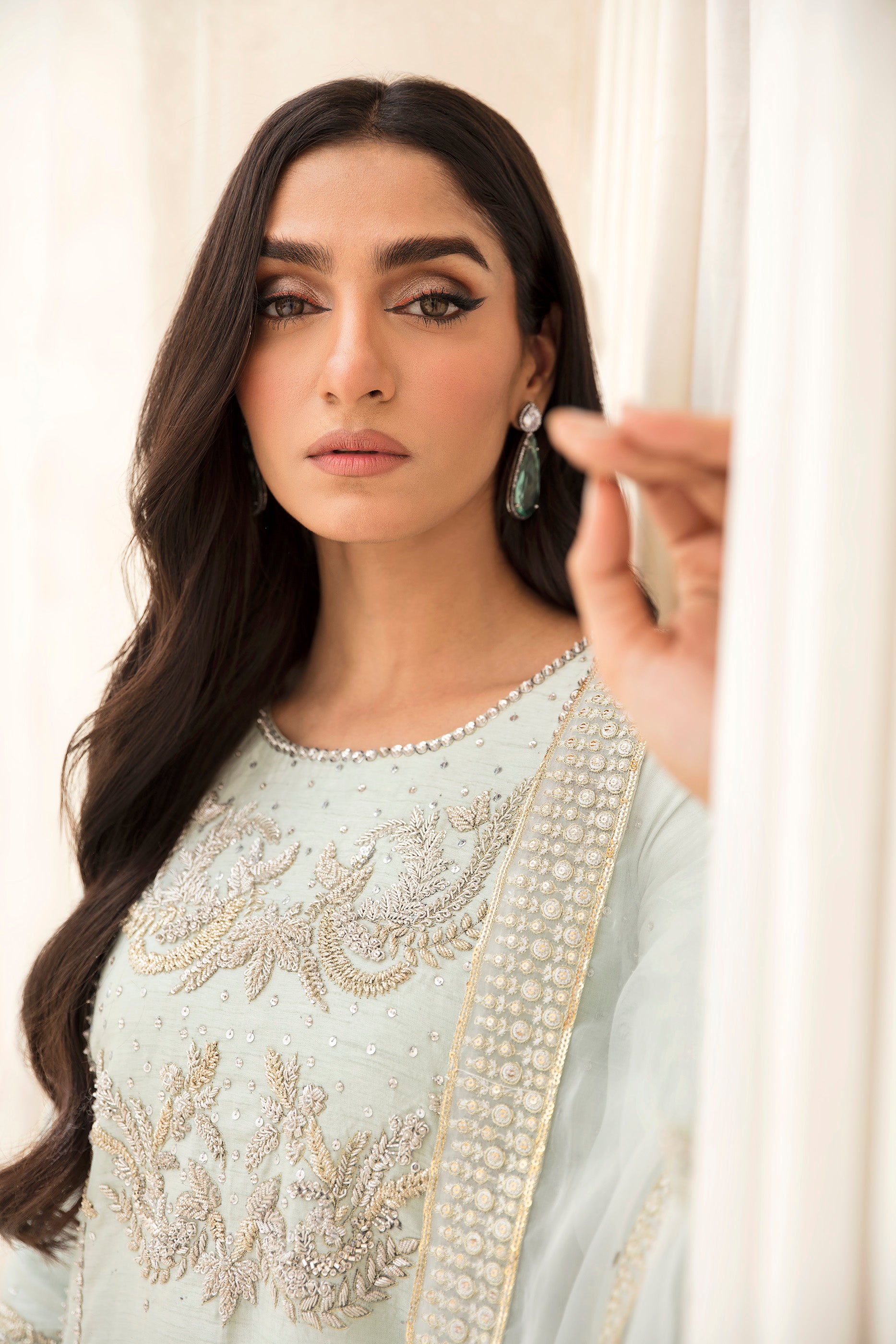 This outstanding pastel green paneled silk shirt is meticulously embellished with exquisite silver handwork on the front, back, and sleeves. The shirt panels have seamless tilla embroidery, creating a masterpiece that exudes timeless beauty. It is paired with sleek cigarette pants and organza dupatta with four-sided embroidered borders, creating a beautiful finish.