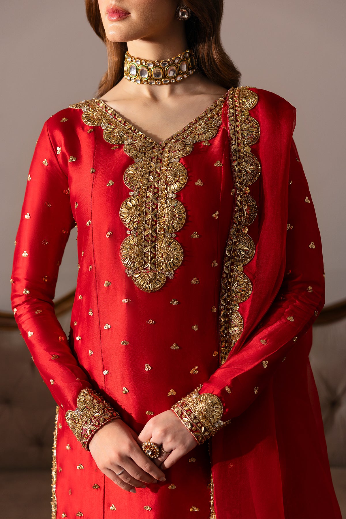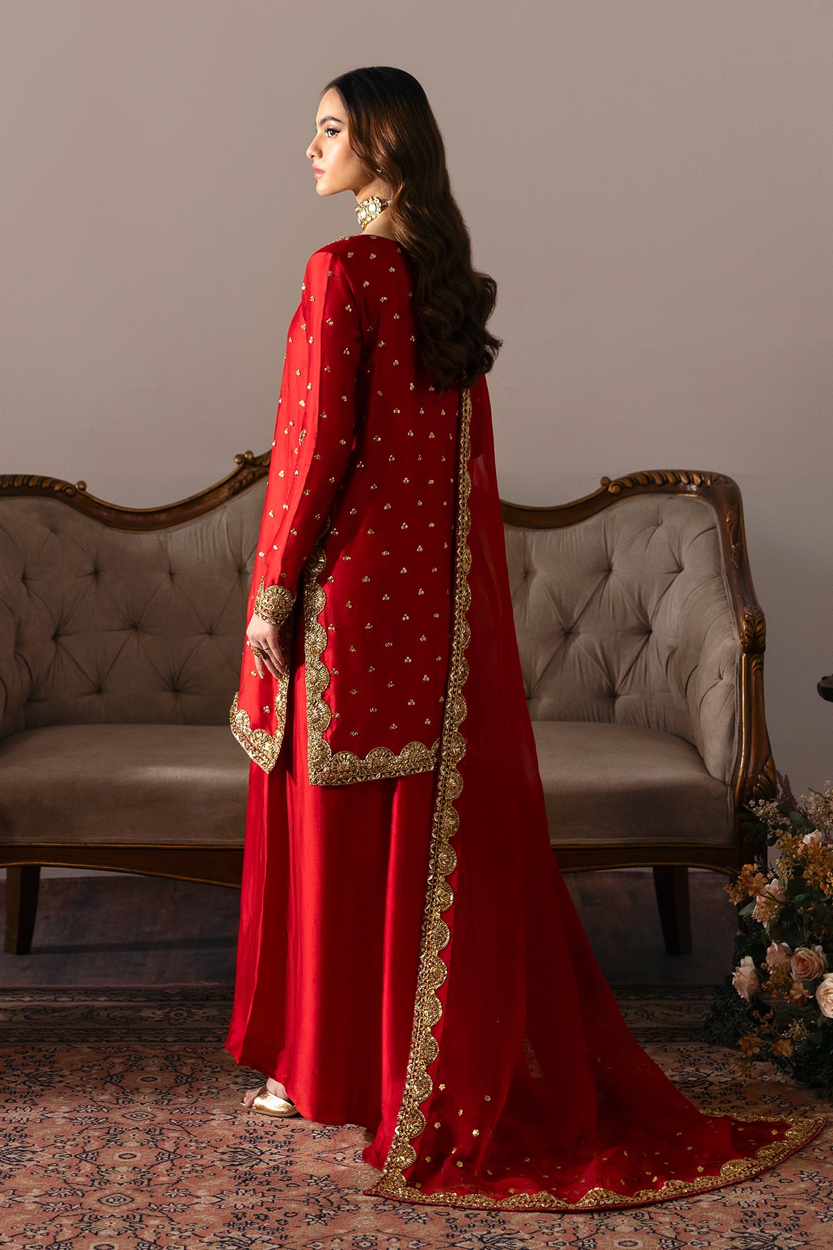 Description: Drape yourself in the charm of red! The stunning shirt, crafted from luxurious silk is adorned with intricate gold hand embellishments, radiating opulence in every detail. Paired with effortlessly chic draped pants and a sheer organza dupatta featuring four-sided embroidered borders and a delicate sequin spray. This ensemble is a true embodiment of charm and grace.