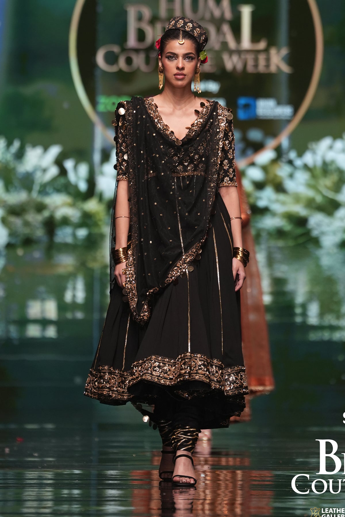 Stealing the spotlight with effortless poise, this black peshwas and churidar set exudes timeless drama and sophistication. The peshwas is adorned with traditional block printing, further enriched with luminous golden embellishments. Its classic silhouette is beautifully complemented by a sheer net dupatta, delicately finished with embroidered borders and a subtle spray that adds a soft, celestial shimmer.