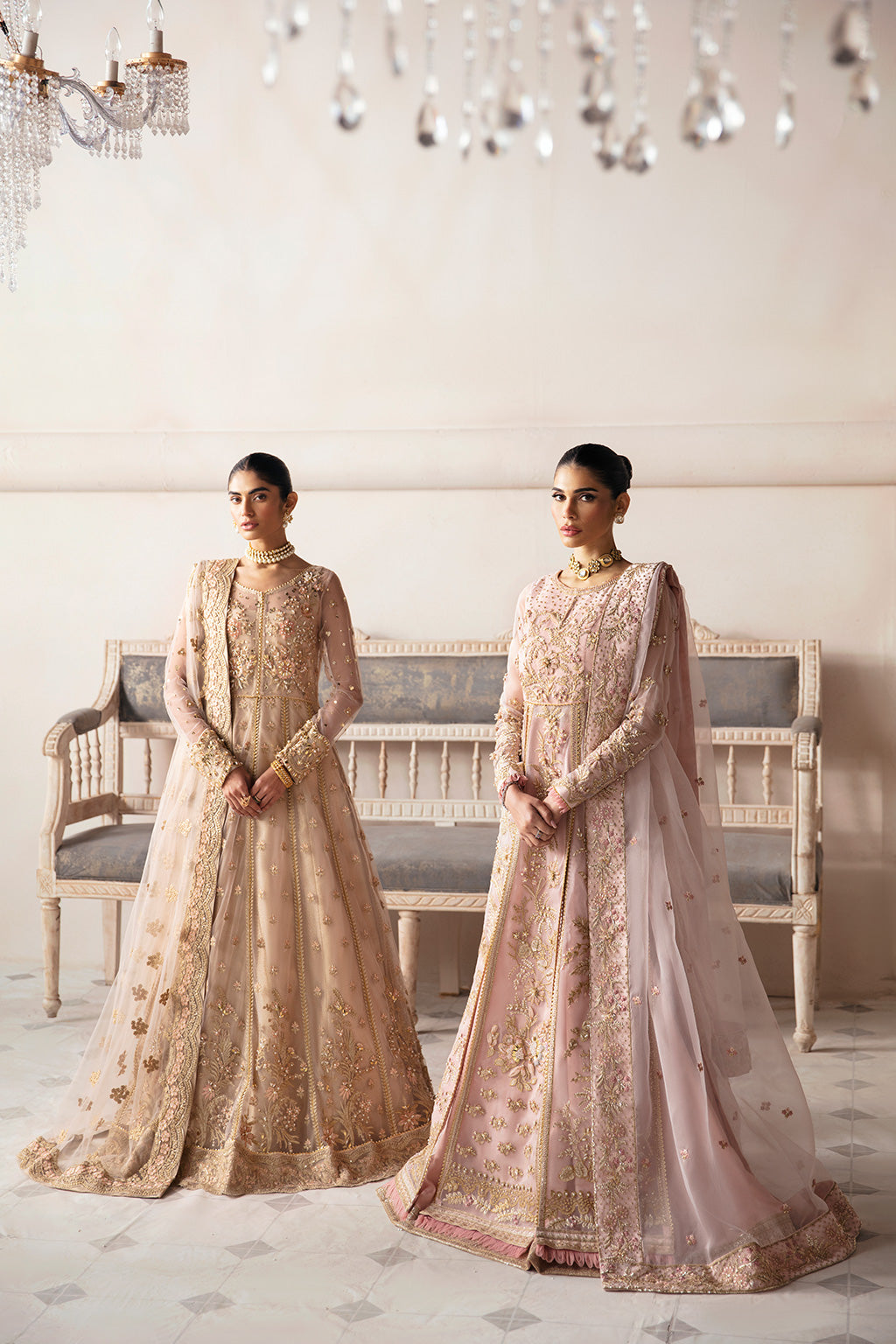 Complementing the pishwas is a gorgeous net dupatta featuring four-sided heavy embroidered borders and an array of ornamental motifs, adding a hint of glamour and sparkle.