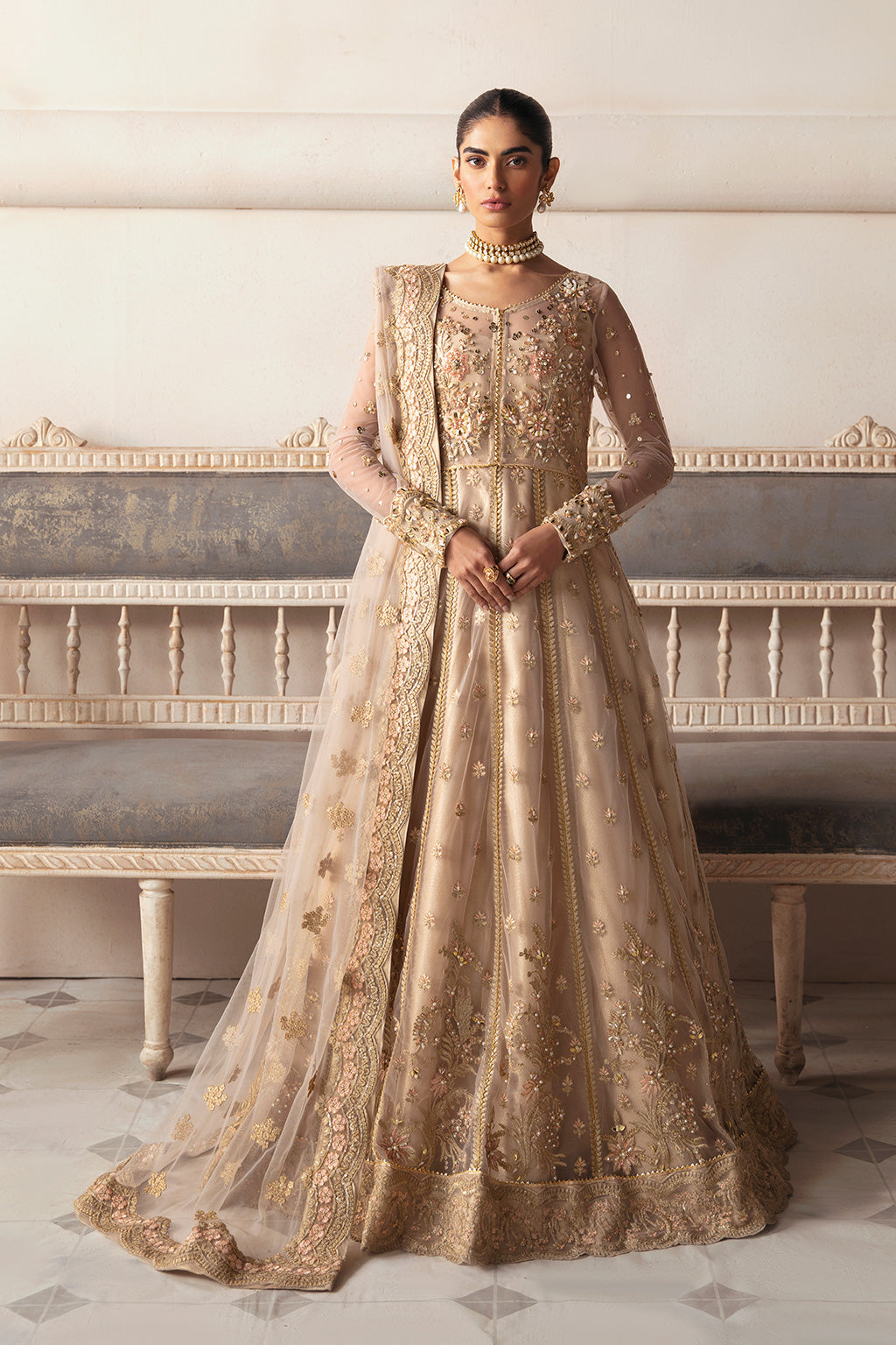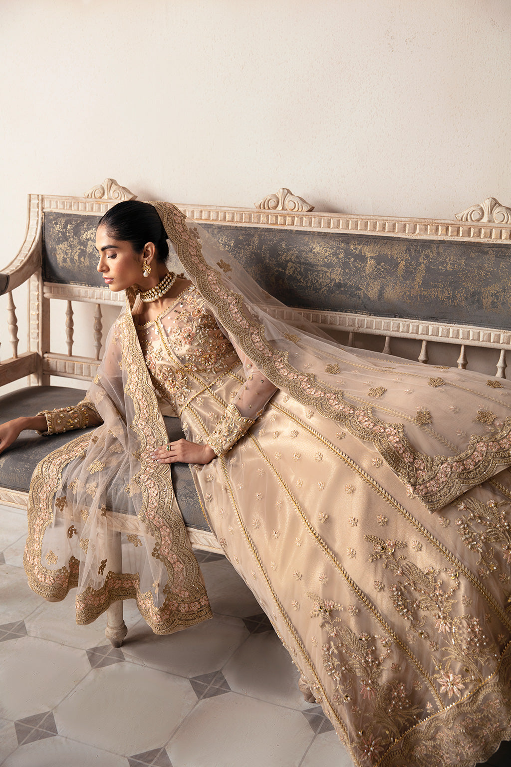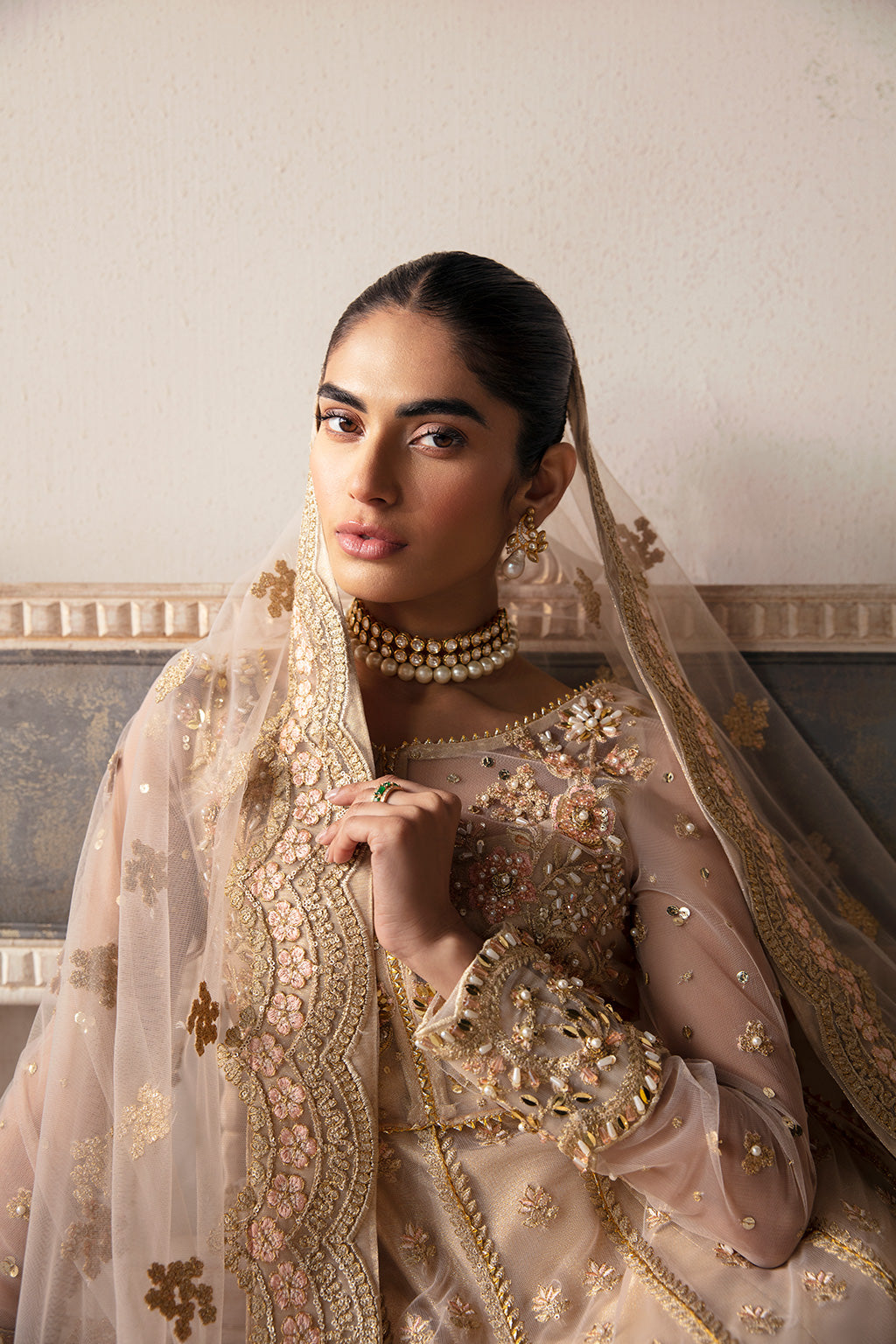 Indulge in the regal charm of beige pishwas, this celestial masterpiece is a canvas of divine elegance. Crafted on luxurious net fabric, the pishwas is embellished with shimmering gold sequins, pearls, and sparkling stones. The soft pink accents and gotta details further elevate the grace of the ensemble.