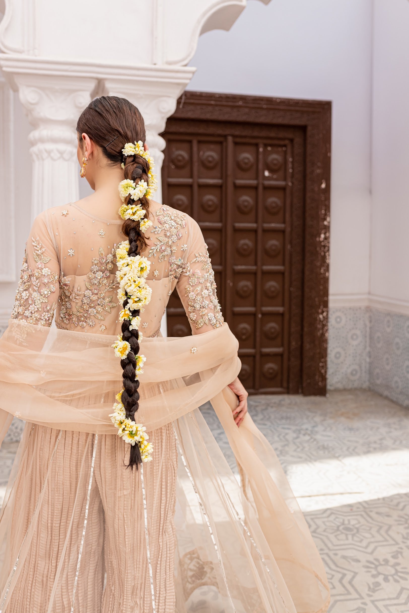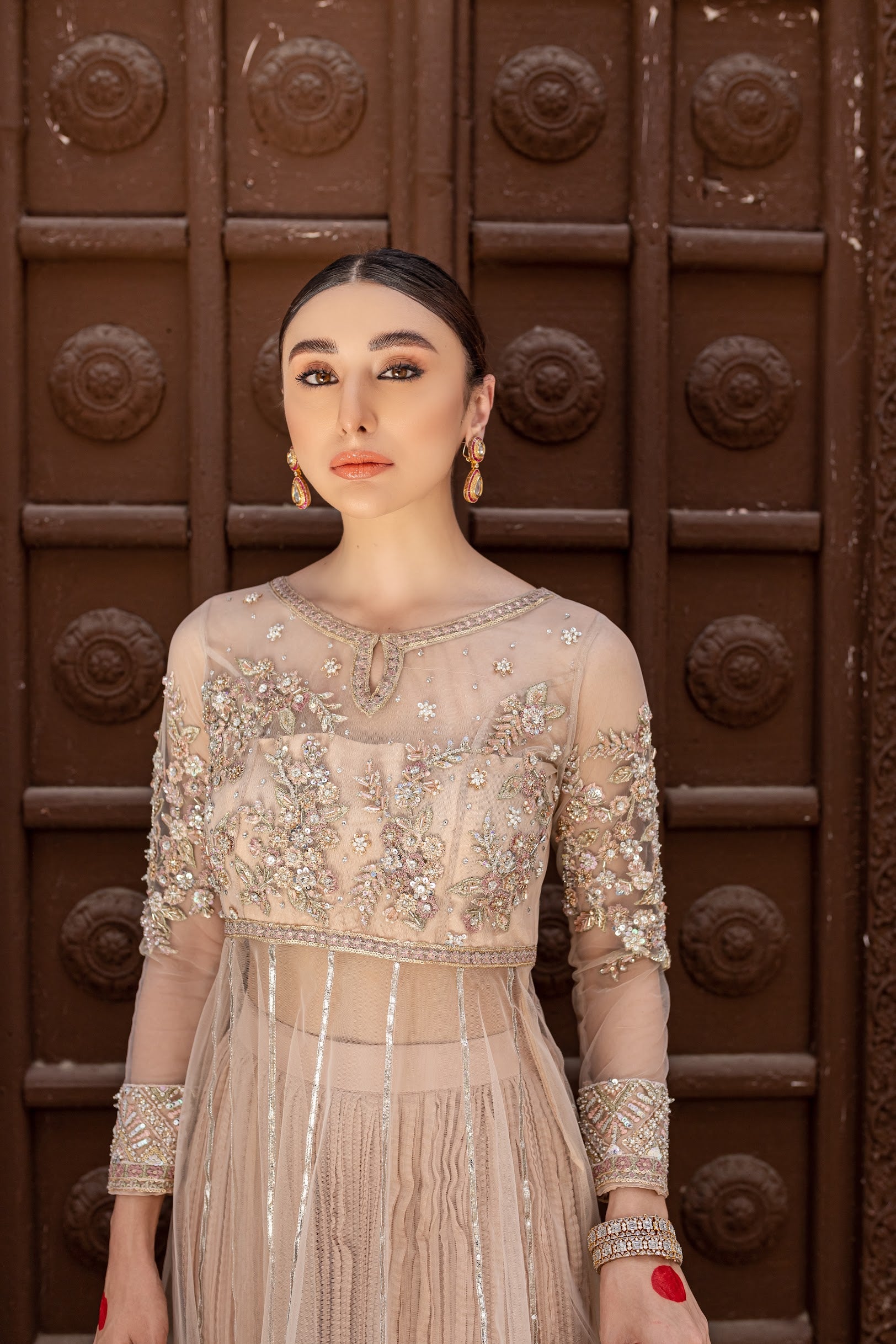 This beige color pishwas is a long floor-touching dress made for twirling with a fitted hand embellished bodice.