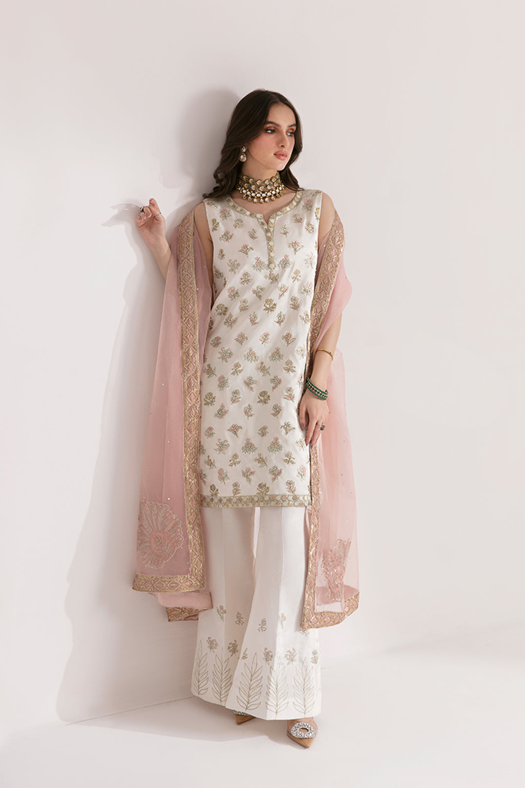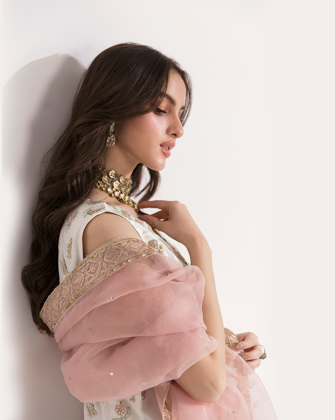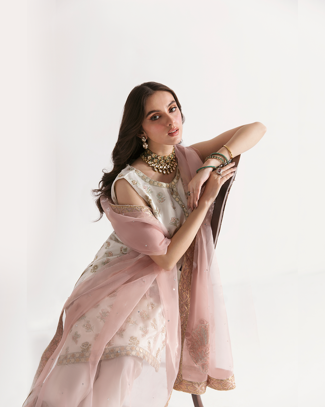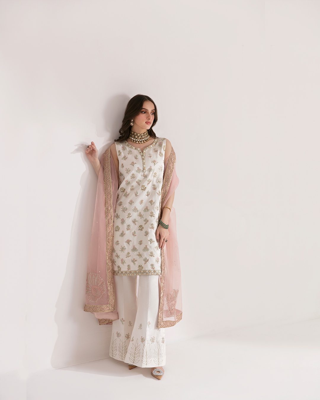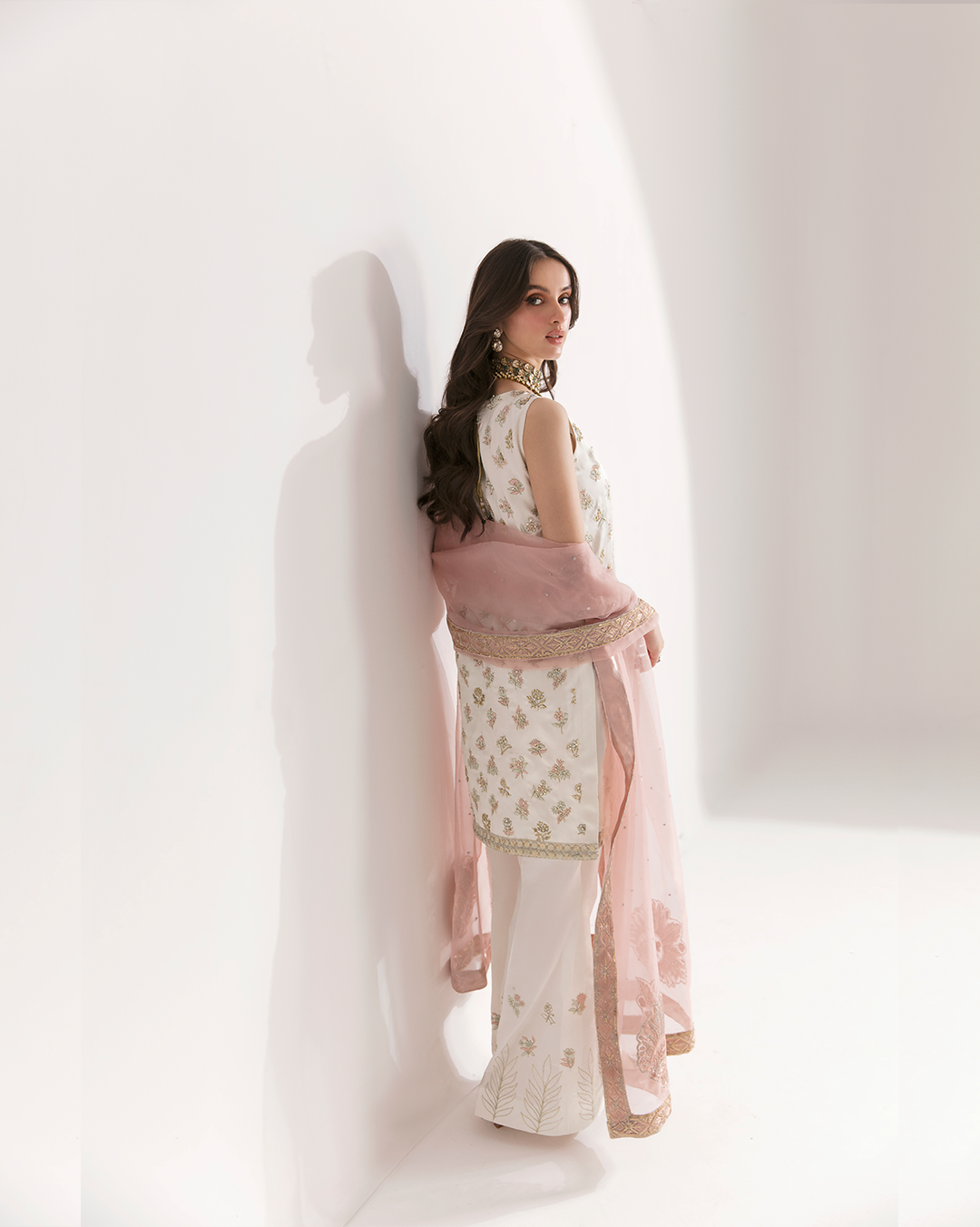 Featuring a charming pearl white satin silk shirt with intricate silver embellishments all over. Paired with embroidered wide-leg pants that embody an effortless sense of style. To complete the look, it comes with a peach organza dupatta with a four-sided border, which enhances the allure and elegance.