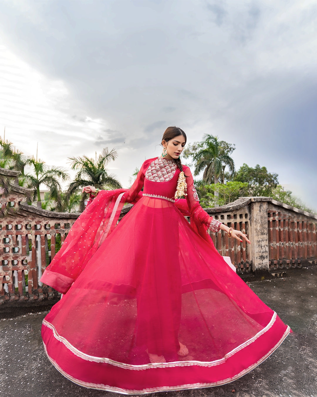 Let's celebrate the grandeur of rosy lush amplified with the shimmering composition of silver embellishments intricately studded on plain silk fabric.
