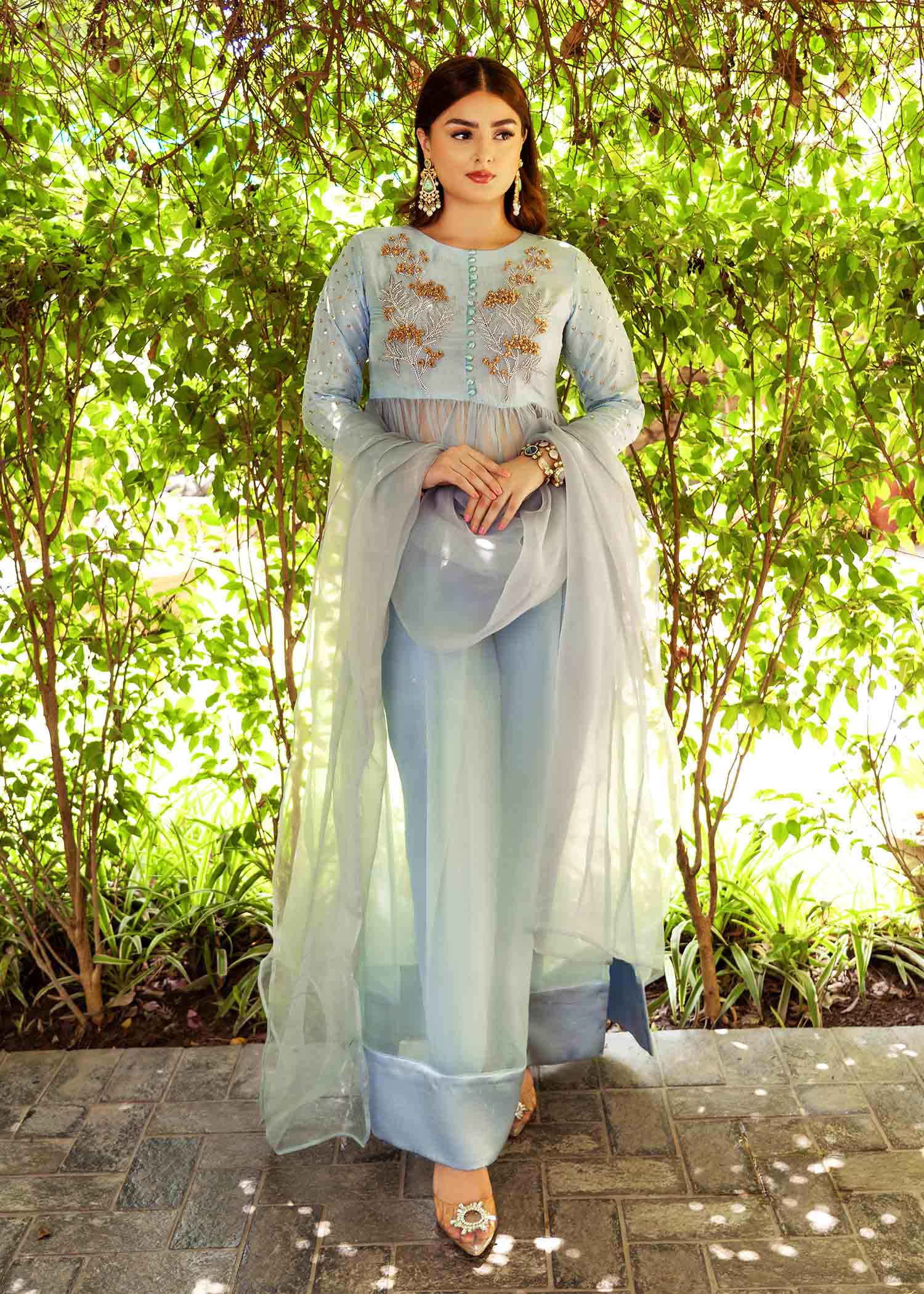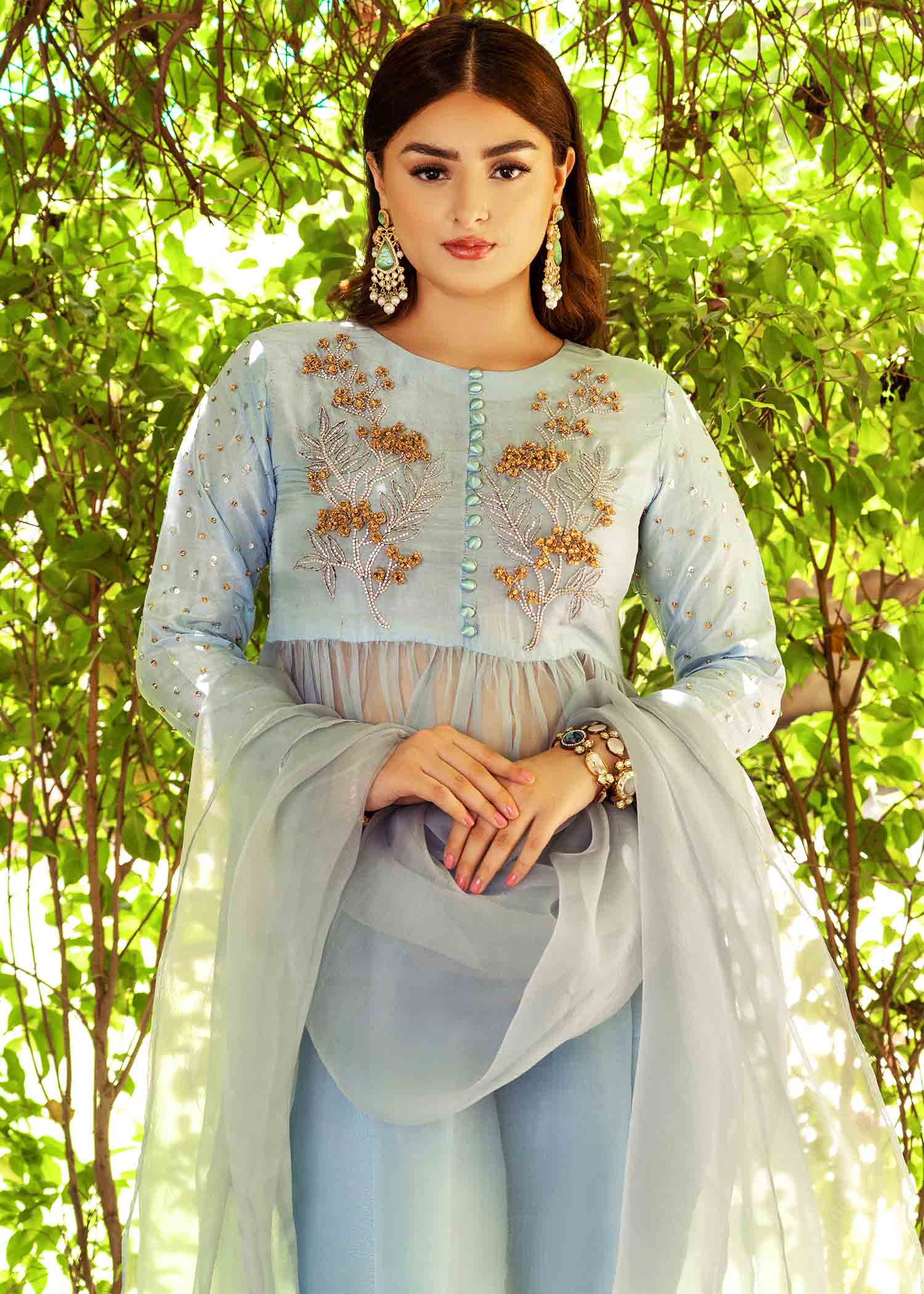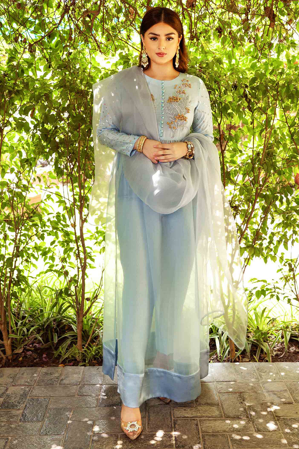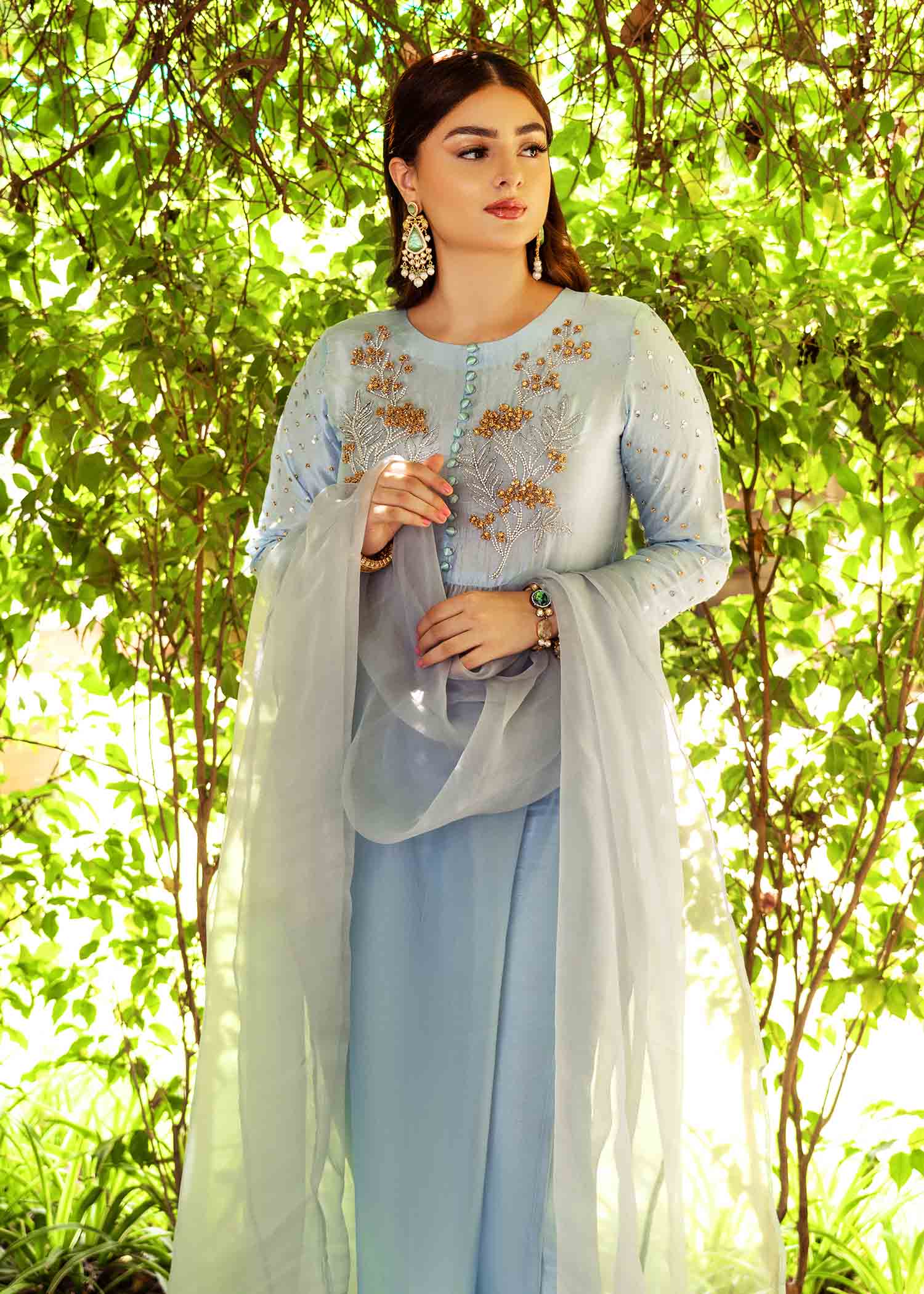 Description: harboring the meticulous waves of Arabian sea into the luscious flames of azure. we have added a soothing shade of blue from our pallete, bedecked with glittering magic of summer evenings. made in pure organza and raw silk pants with total hand embellishments.