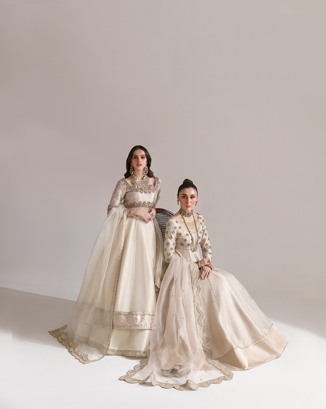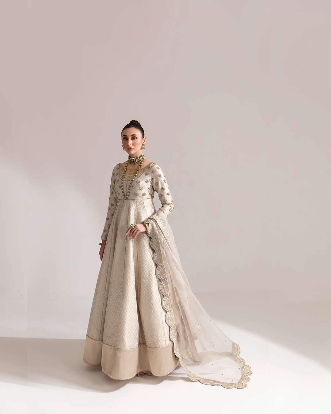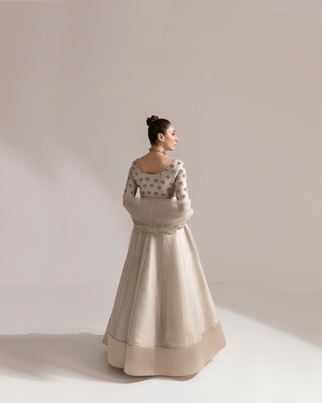 This resplendent gold beige pishwas is a splendid showcase of fine craftsmanship, adorned with intricate floral embellishments in bronze and gold on the bodice of luxurious jamawar fabric and finished with gota work on the neckline. This timeless design is paired with an organza dupatta, having an intricate embroidered scalloped border, creating a mesmerising aura that exudes grace and elegance.