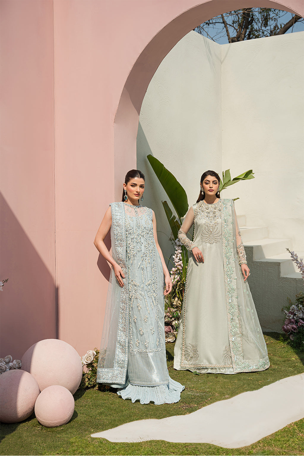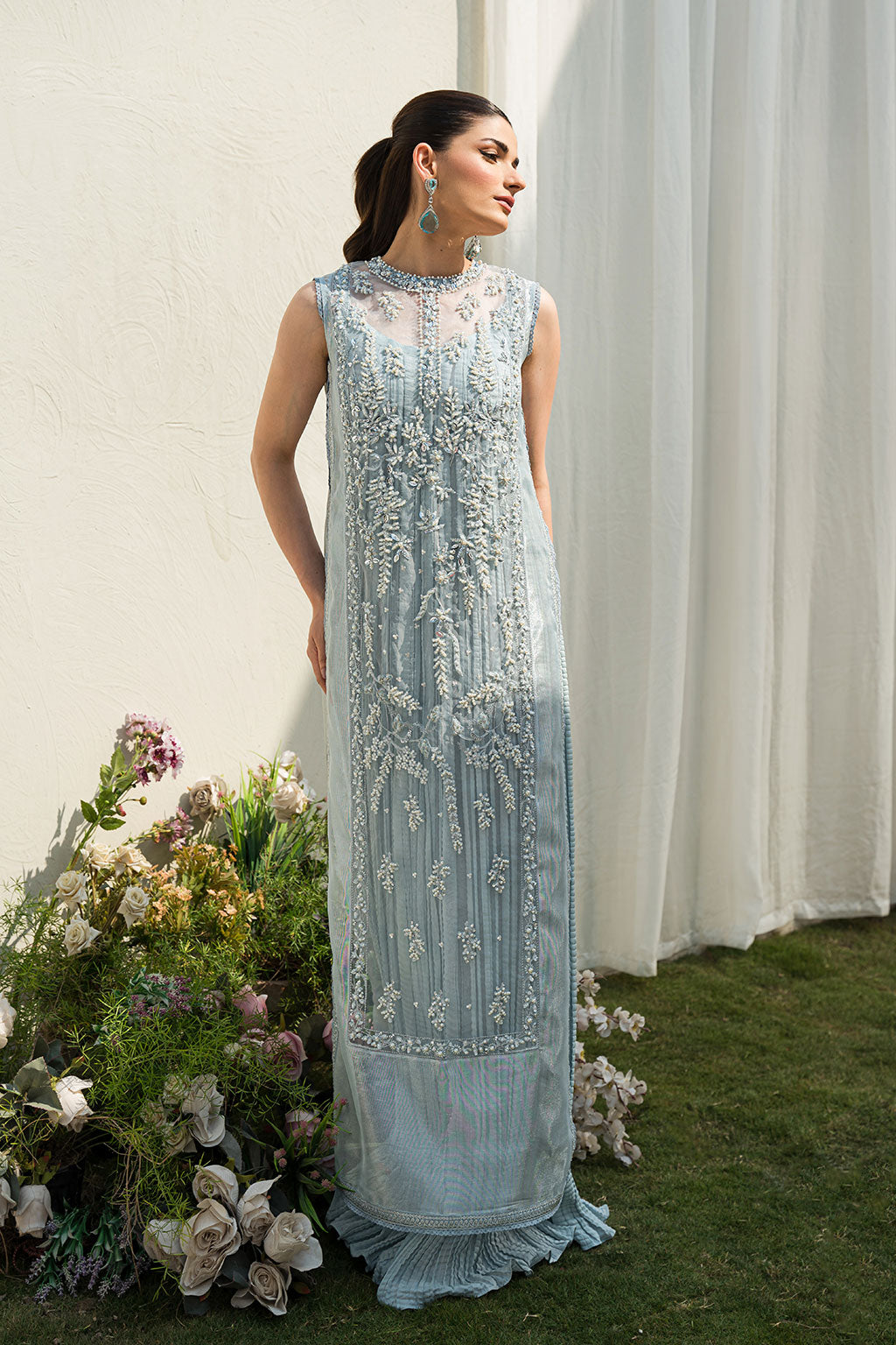 Description: The dazzling ice-blue straight shirt boasts intricate hand embellishments featuring a symphony of seed pearls, sequins, crystals and cutdana on a lustrous organza centre panel while the side panels are crafted from delicate tissue fabric. Paired with a crushed silk inner and net dupatta with heavily embroidered borders and sequin spray, this ethereal silhouette is sure to captivate hearts.