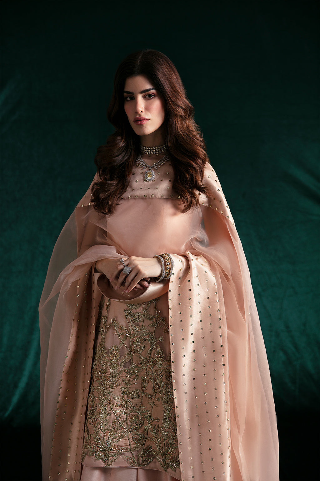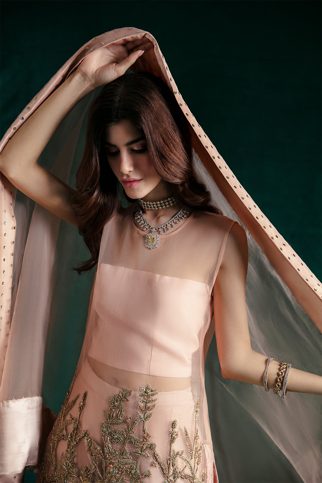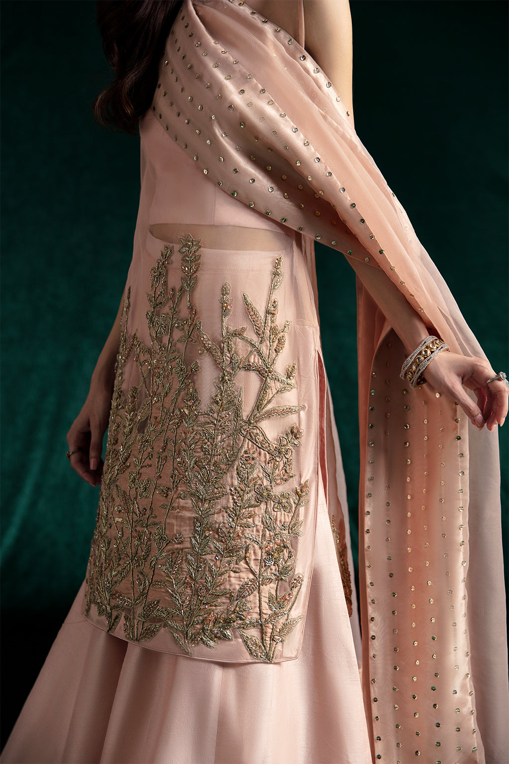 Description: Make a style statement this festive season in a knee-length shirt and Sharara pants!A celestial creamy peach ensemble that exudes timeless beauty and ethereal charm. The knee-length organza shirt is embedded with meticulous hand embellishments along its border with a blend of shimmering golden and silver elements, exemplifying exquisite craftsmanship. Complemented by raw-silk sharara pants and an organza dupatta, adorned with a delicate spray along its borders, this ensemble is a monument to your personality and confidence.