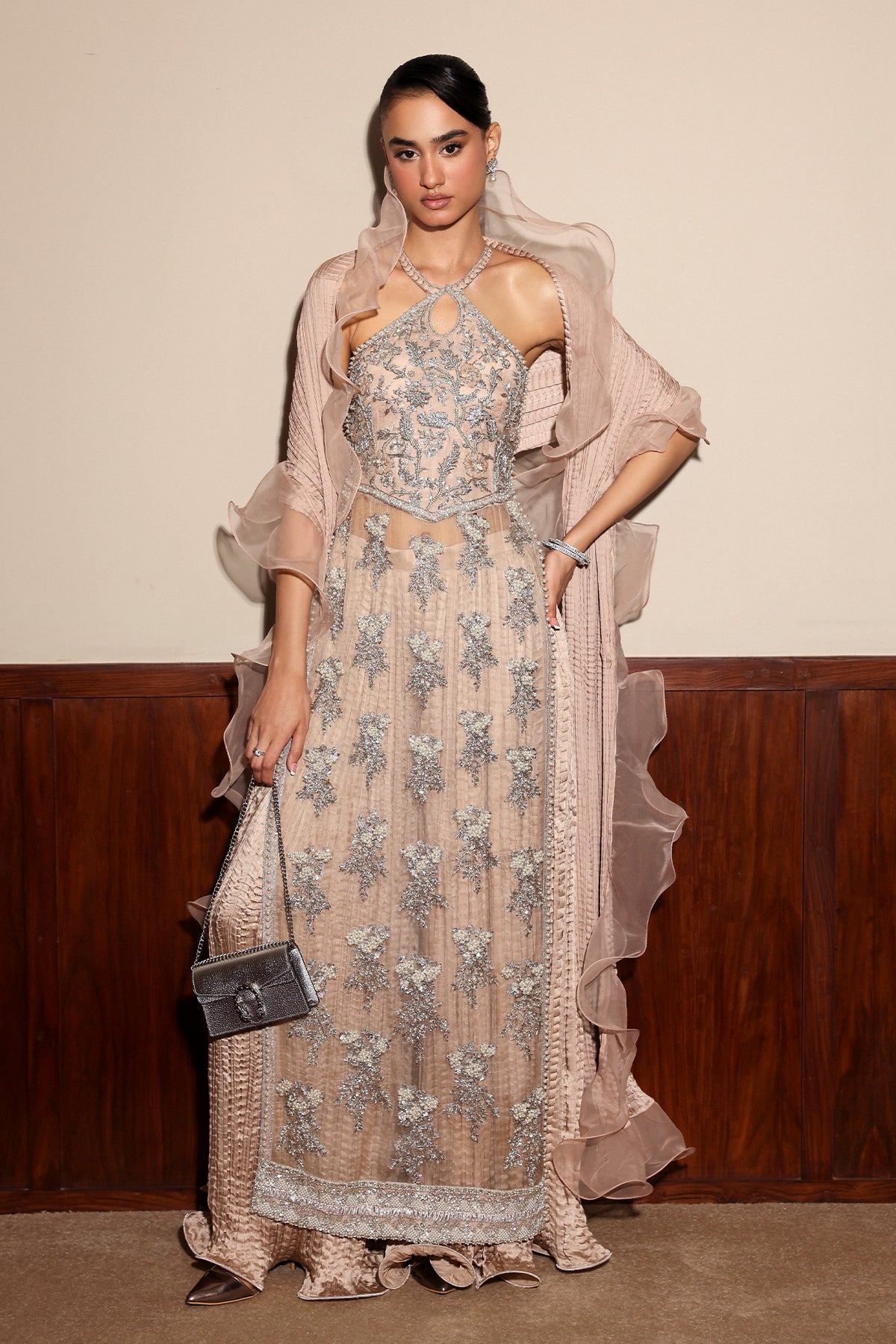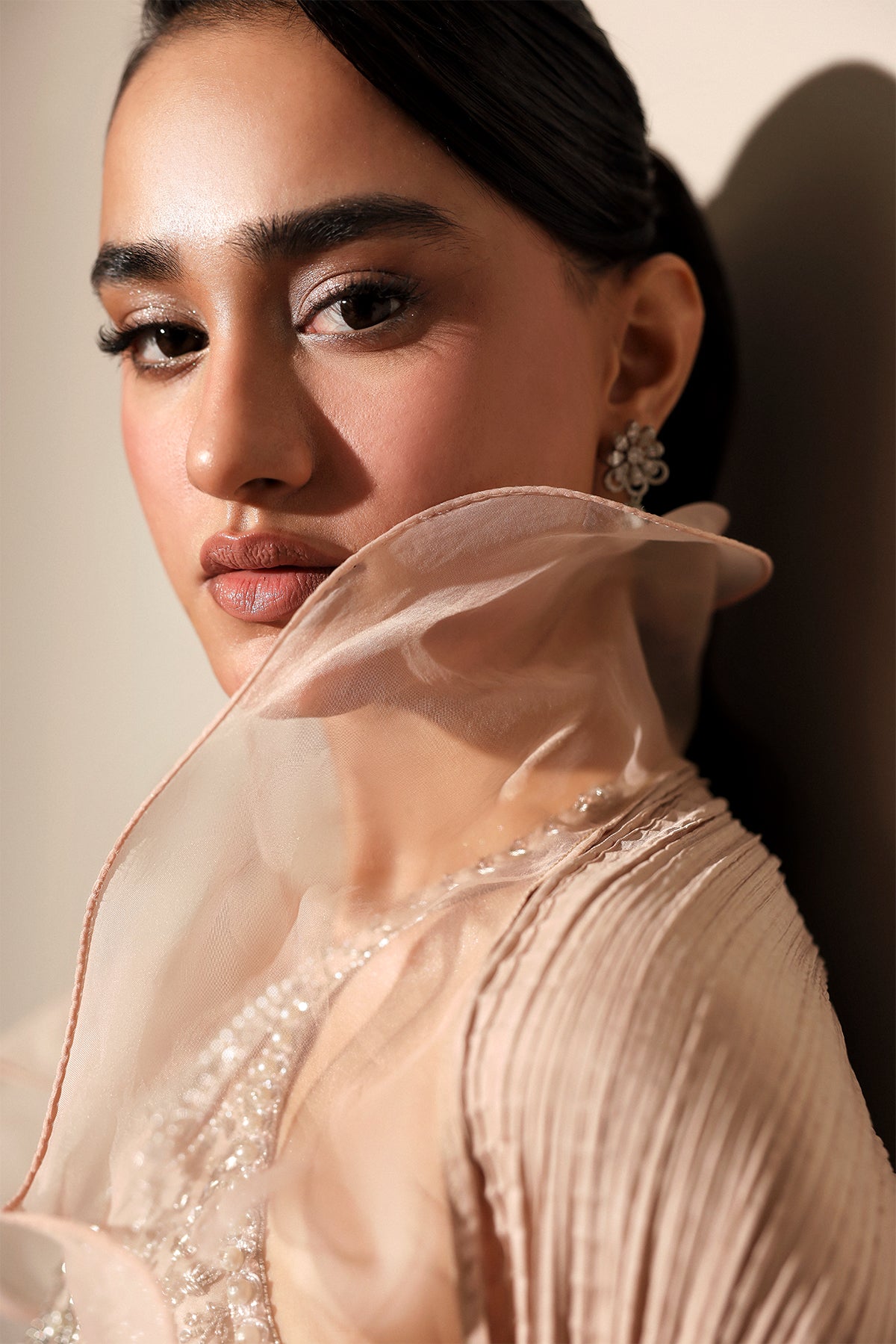 A vision of artistry in an ethereal shade of tea pink. The organza shirt is fully hand-embellished on the front, back, and sleeves, showcasing a stunning fusion of diamantes, zardozi, pearls, and delicate threadwork. It is complemented by crushed sharara pants and a silk dupatta, finished with organza ruffles that add a whimsical touch.