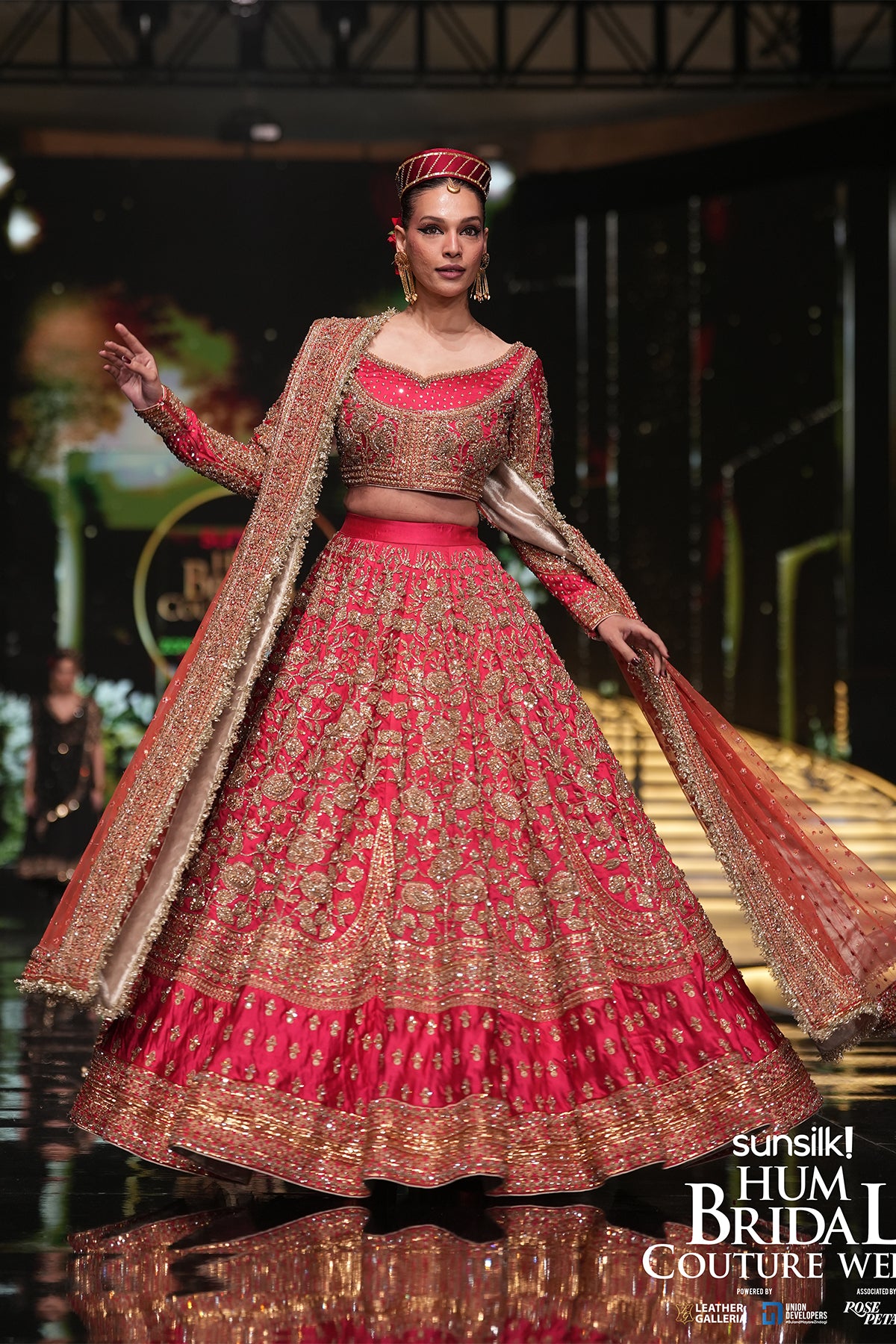 A diaphanous net dupatta, adorned with a sumptuous heavy border on one side, delicate borders on the remaining sides, and a lavish spray of embellishments across its surface, frames the look with ethereal grace. This vision of bridal grandeur comes with a hand-embellished pouch, adding the final touch to an ensemble that celebrates luxury, craftsmanship, and timeless elegance.