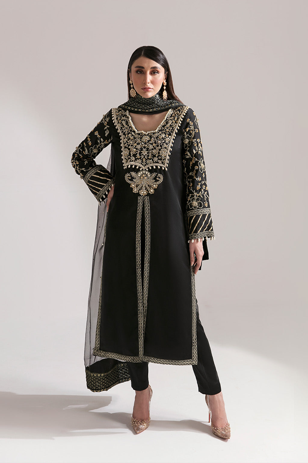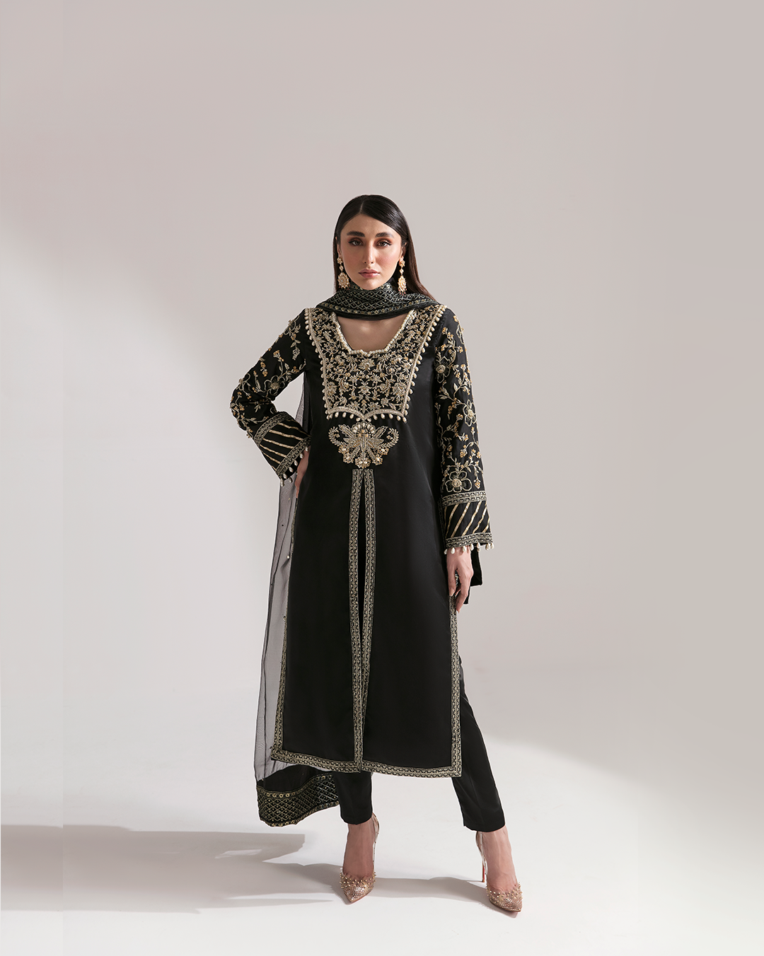 This sumptuous pitch-black ensemble is intricately adorned with handcrafted gold embellishments on the neckline and full sleeves. The open slit with intricately embroidered borders on the shirt and the exquisite addition of drop pearls on the neckline and sleeves provides a luxurious touch of elegance.