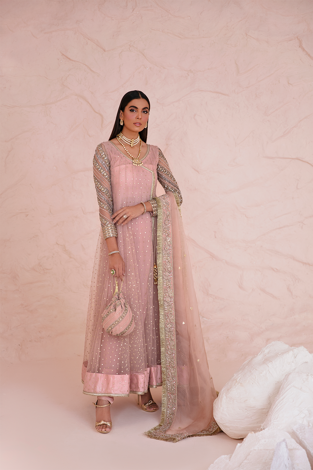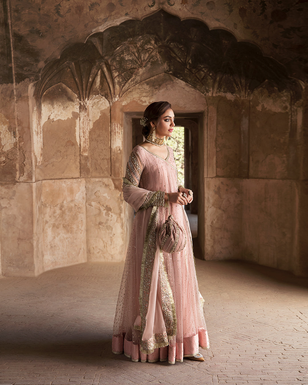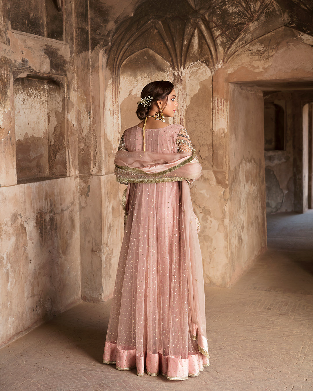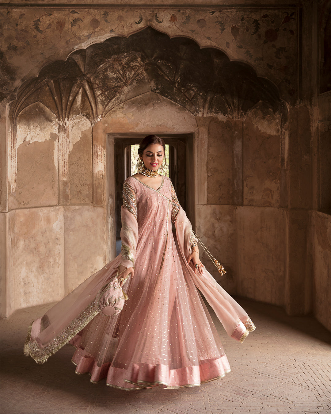 This exquisite floor-length blush pink net anghrakha style net pishwas is a true impediment of feminine charm and sophistication. The silver sequin spray along with heavily embroidery on sleeves adds a subtle yet alluring sheen to the ensemble, that is sure to captivate onlookers. It comes with churidar pajama of grip silk and organza dupatta, featuring delicate embroidery of silver and gold naqshi and adda work. Golden kiran on all the borders ensuring a reminiscence of festivities.
