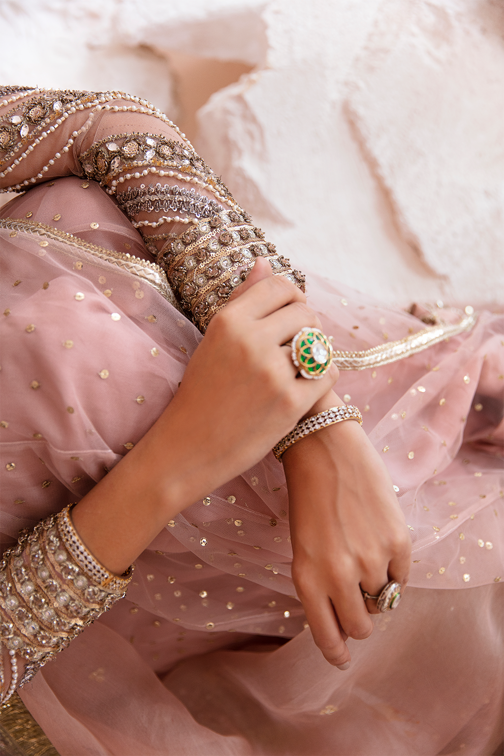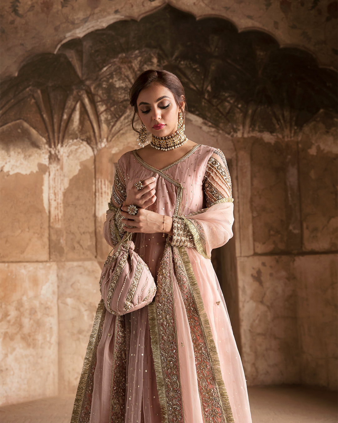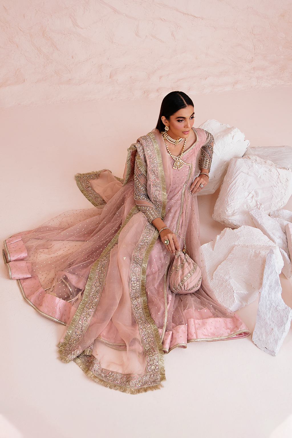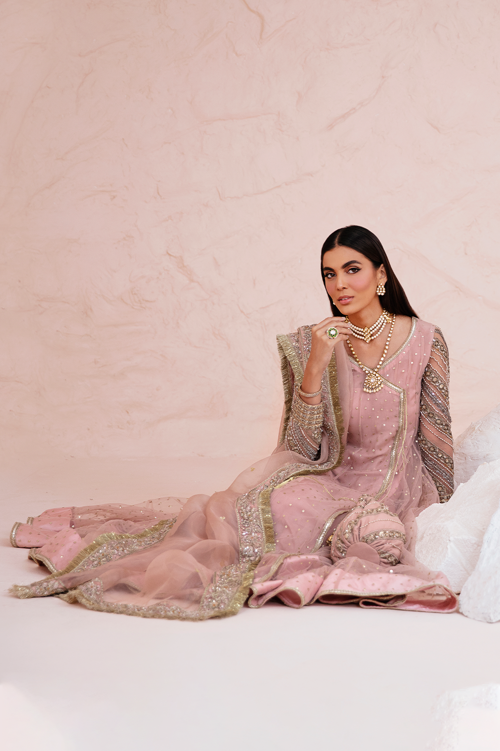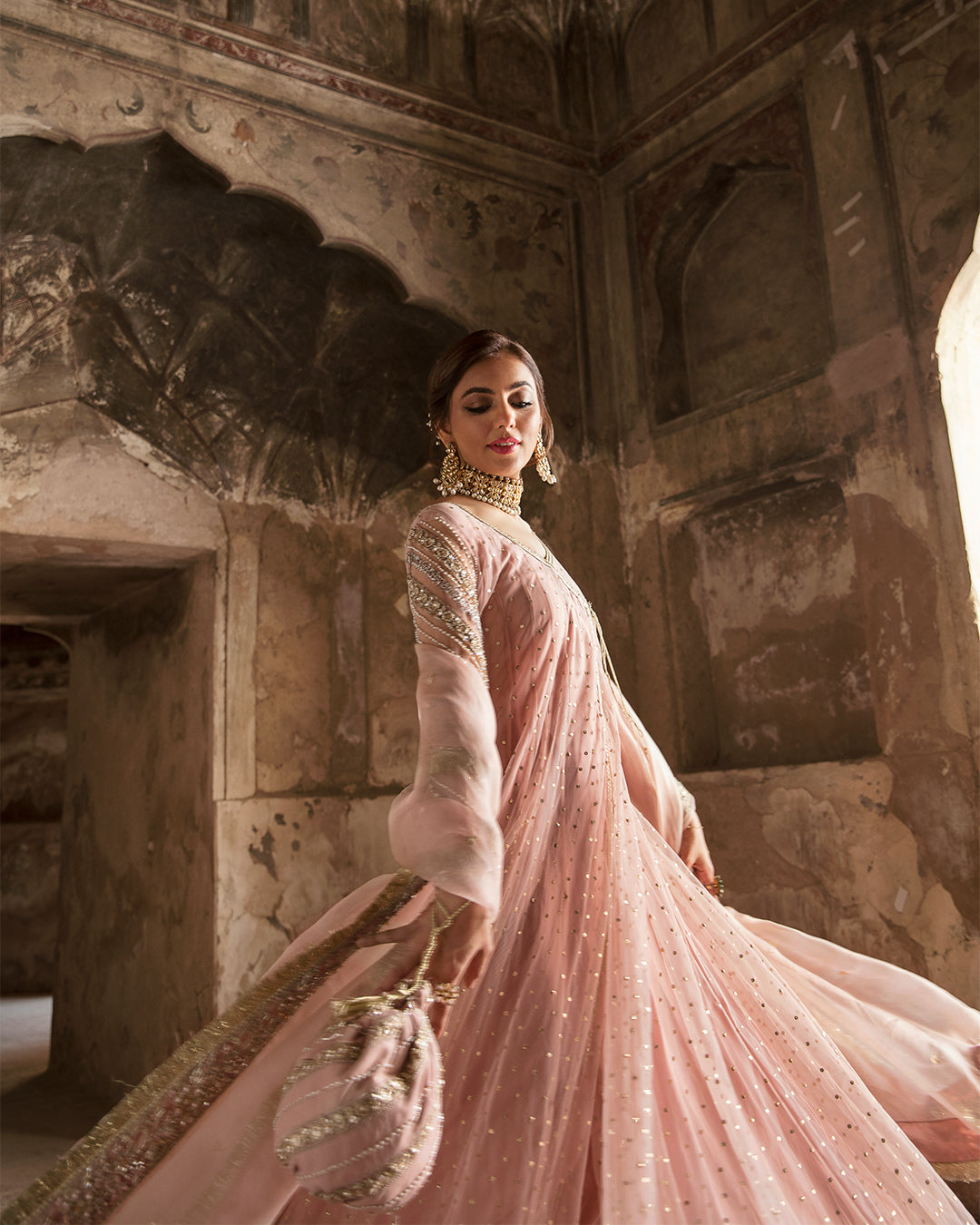 This exquisite floor-length blush pink net anghrakha style net pishwas is a true impediment of feminine charm and sophistication. The silver sequin spray along with heavily embroidery on sleeves adds a subtle yet alluring sheen to the ensemble, that is sure to captivate onlookers. It comes with churidar pajama of grip silk and organza dupatta, featuring delicate embroidery of silver and gold naqshi and adda work. Golden kiran on all the borders ensuring a reminiscence of festivities.