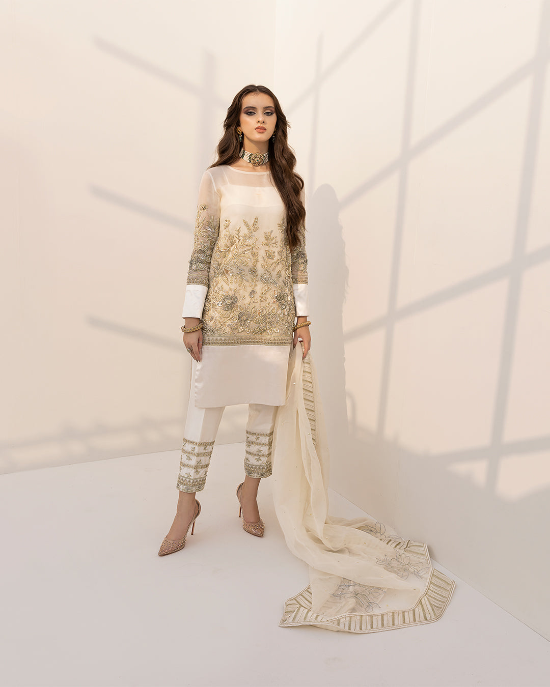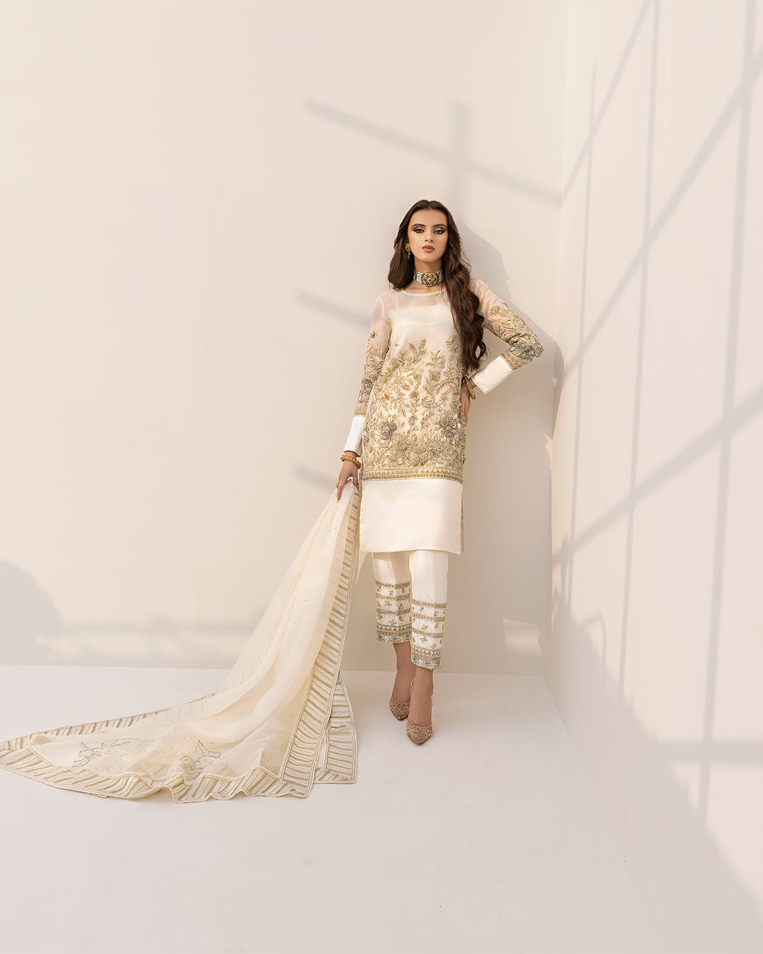 This white raw silk knee-length shirt is exquisitely adnored with dull gold intricate details that depict nothing but epitome of grace. Paired with finely hand-embellishments cigarette pants and an organza dupatta with spray motifs.