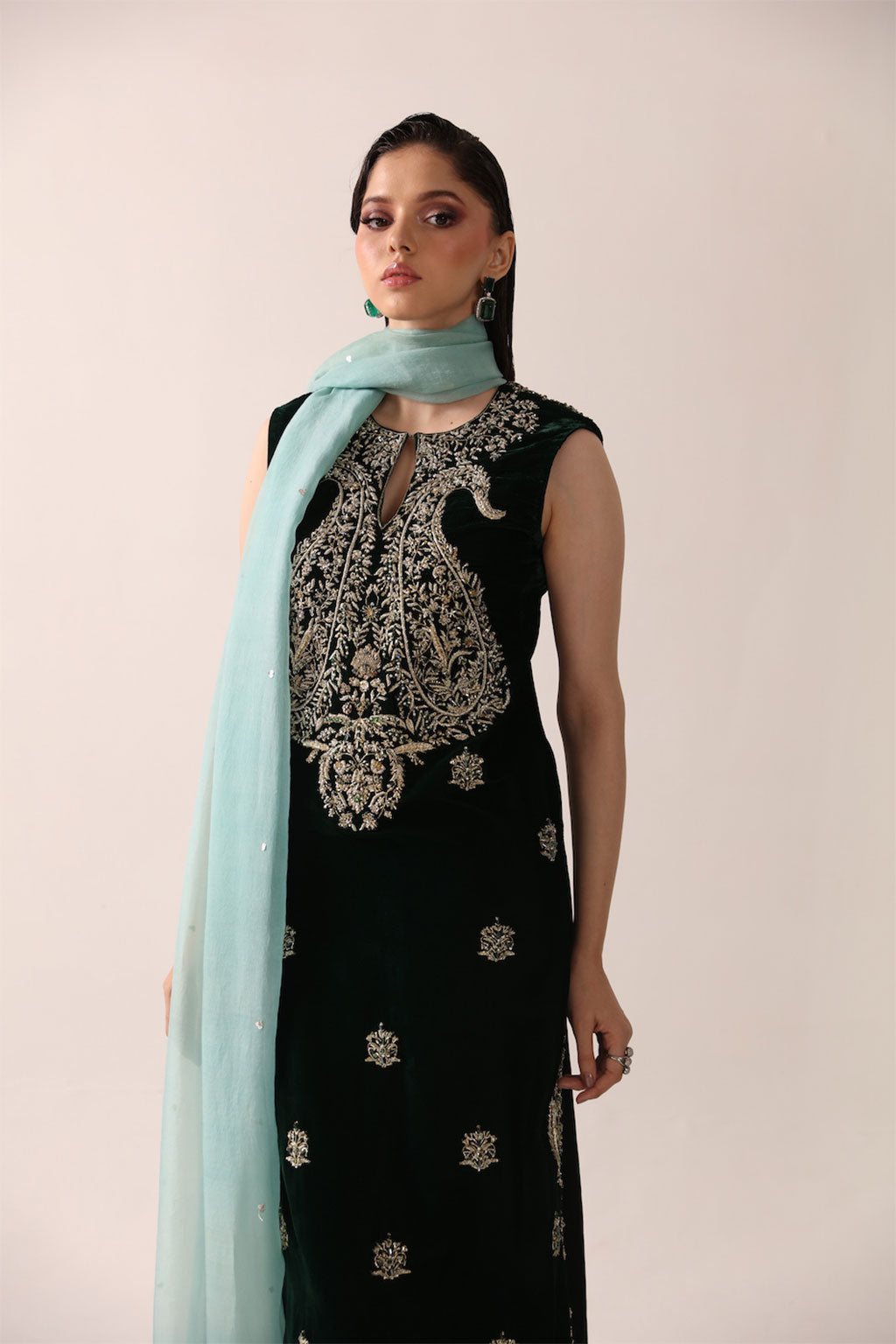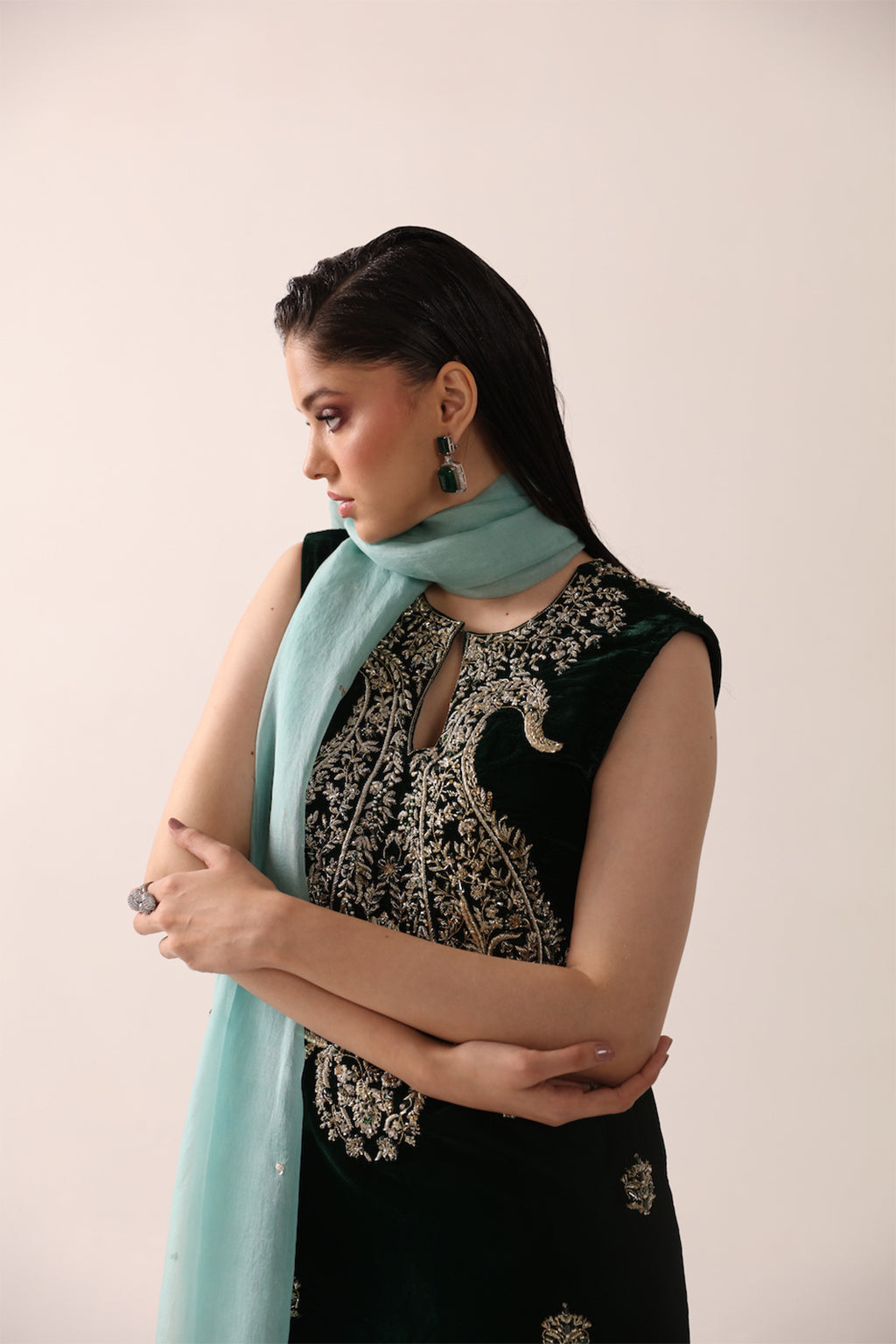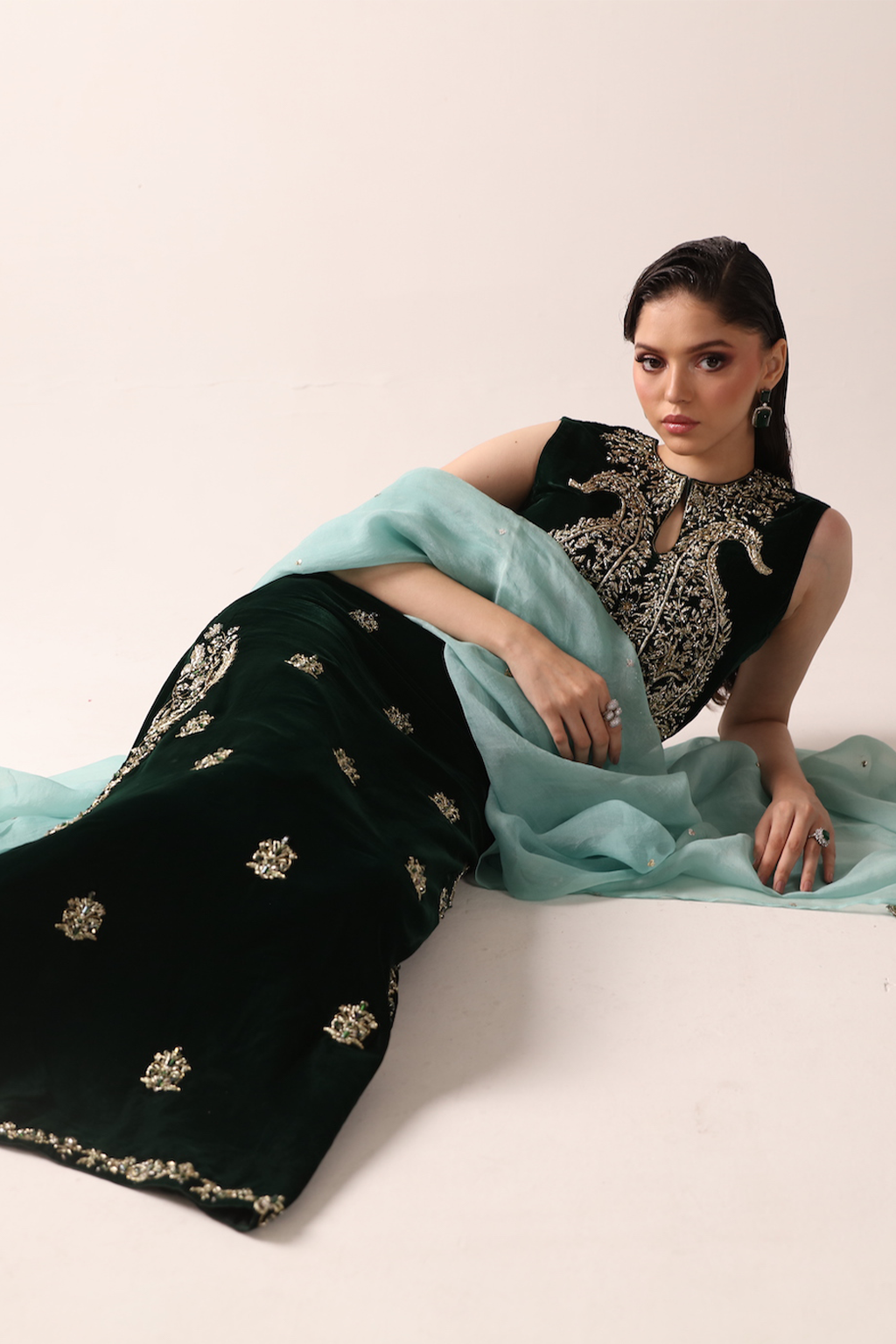 Description: Drape yourself in elegance in this showstopper emerald green shirt paired with cigarette pants. This resplendent floor-length velvet shirt boasts exquisite golden adda work, where subtle accents of green crystals, thoughtfully juxtaposed in meticulous manner, adding a touch of enchantment to the ensemble. It is paired effortlessly with cigarette raw silk pants and a contrasting sea green or cancer dupatta featuring hand embellishments on borders, adding a touch of charm to the outfit.