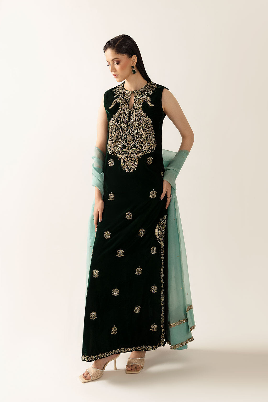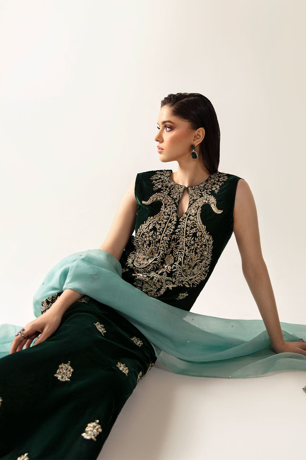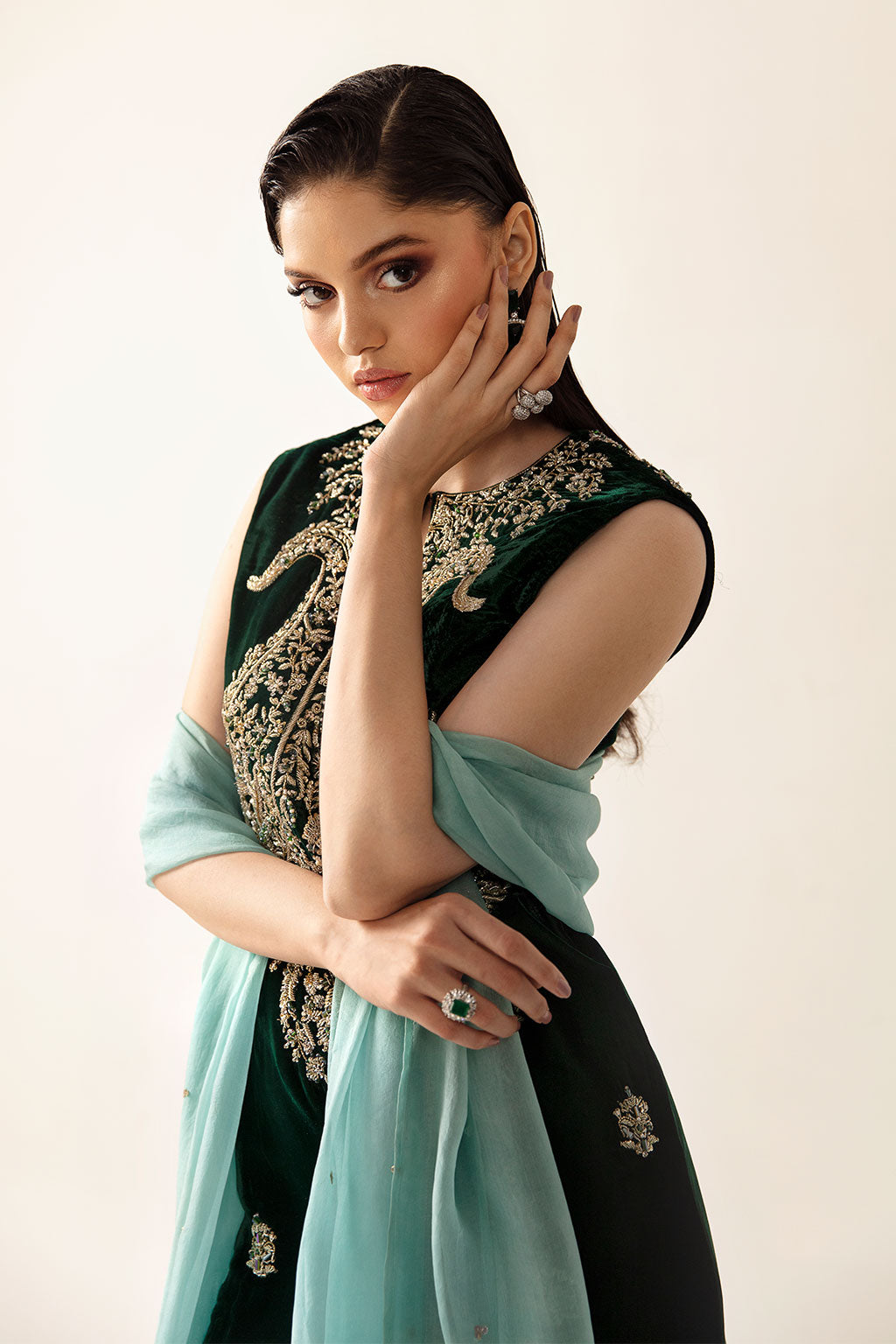 Description: Drape yourself in elegance in this showstopper emerald green shirt paired with cigarette pants. This resplendent floor-length velvet shirt boasts exquisite golden adda work, where subtle accents of green crystals, thoughtfully juxtaposed in meticulous manner, adding a touch of enchantment to the ensemble. It is paired effortlessly with cigarette raw silk pants and a contrasting sea green or cancer dupatta featuring hand embellishments on borders, adding a touch of charm to the outfit.