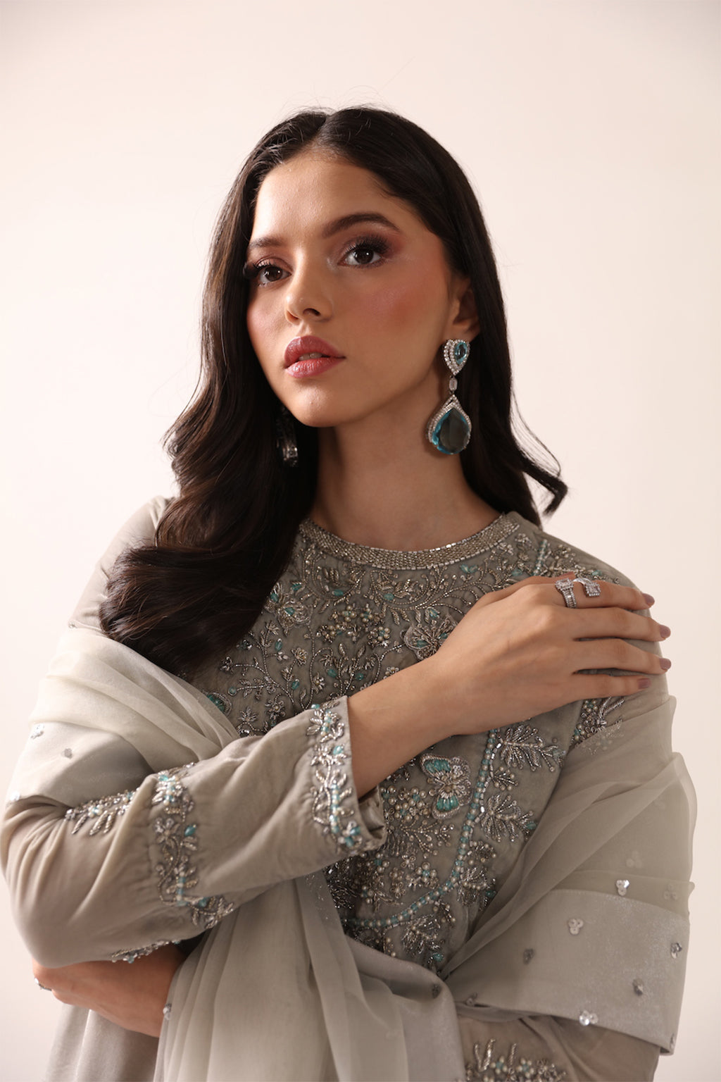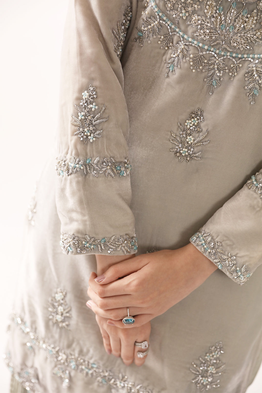 Description: Indulge in glamour and embrace your style with our ethereal grey outfit. This charming grey knee-length shirt is meticulously detailed with exquisite silver embroidered and ice-blue crystals that bring a touch of enchantment. It is teamed up with grip-crushed sharara pants that exude modern elegance. The organza dupatta with captivating adda spray on the borders provides the ideal finish.
