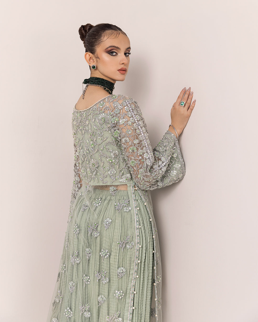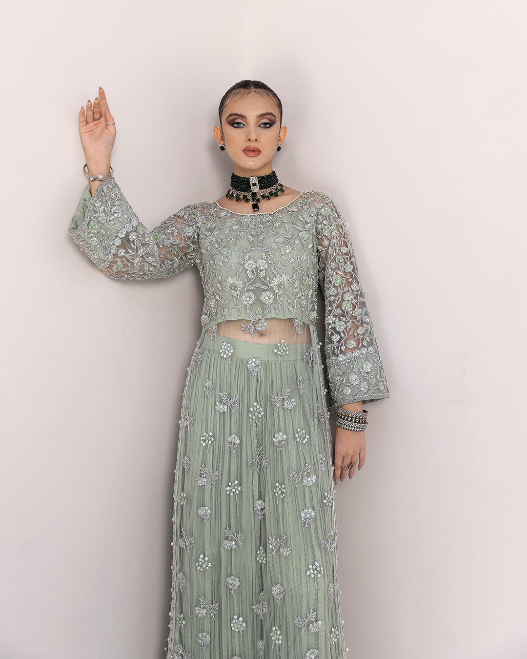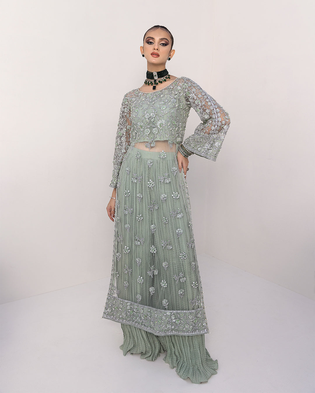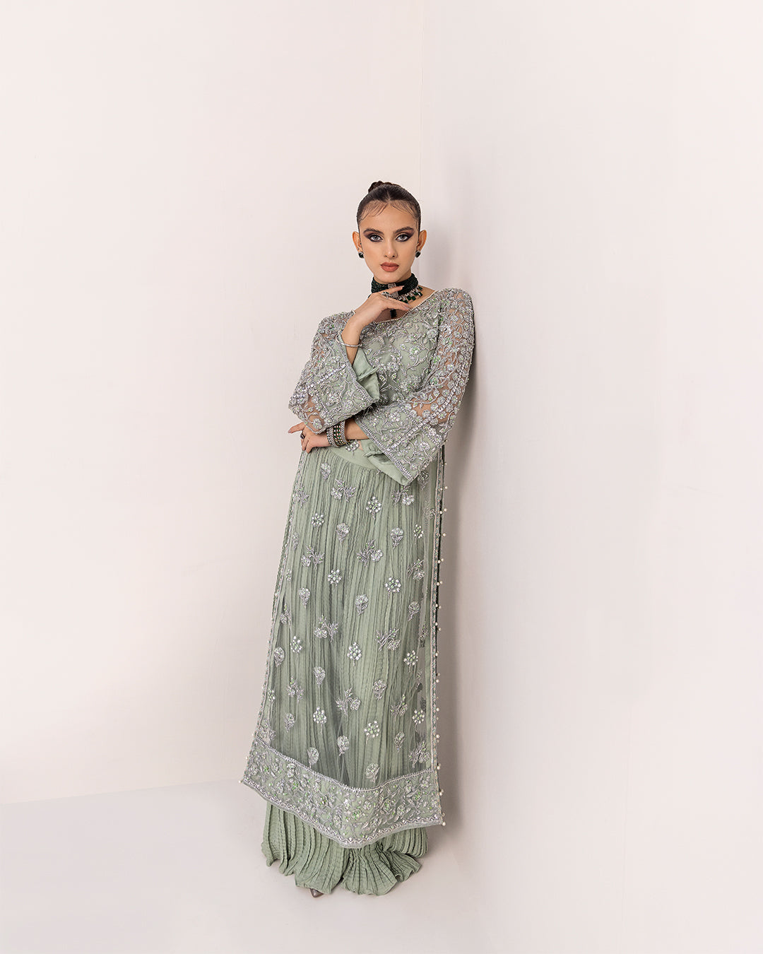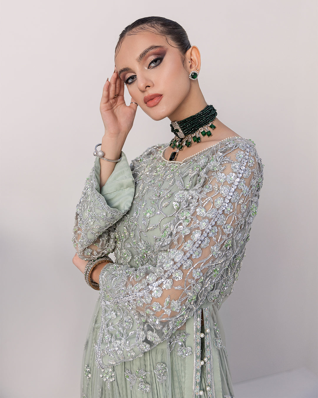 A splended mint green floor length silhouette crafted on premium net fabric with playful motifs all over body and sleeves. This flattering shirt is styled with crushed pants and organza dupatta with exceptional embroidered borders, making it the perfect fit for this season.
